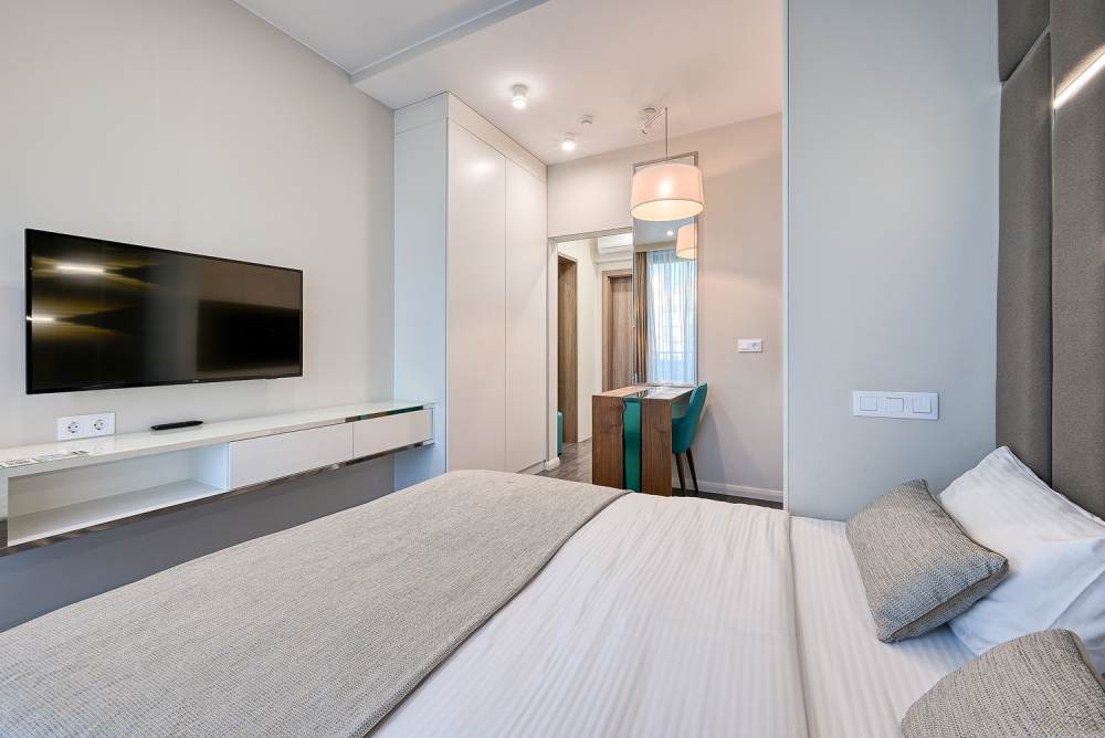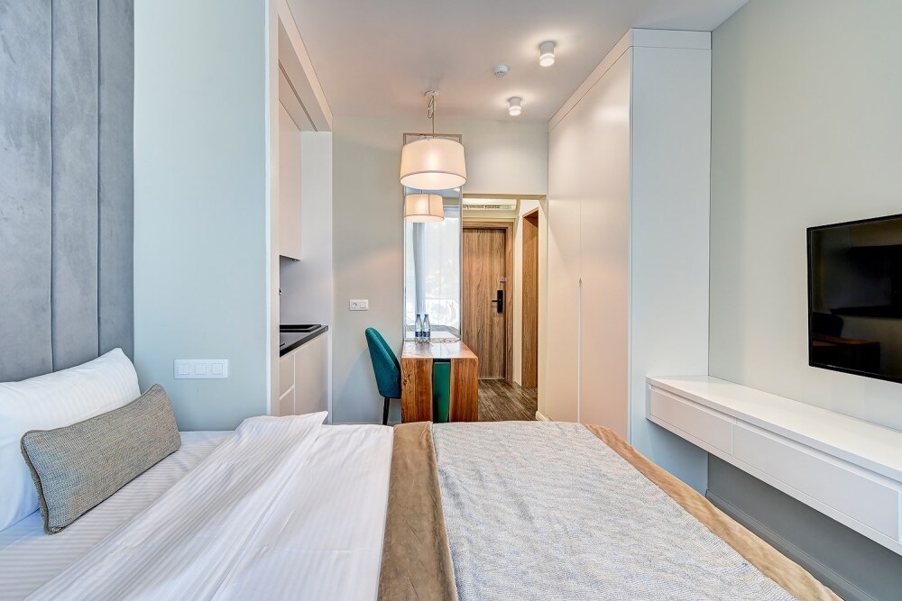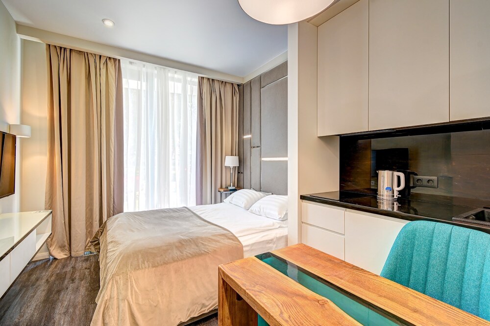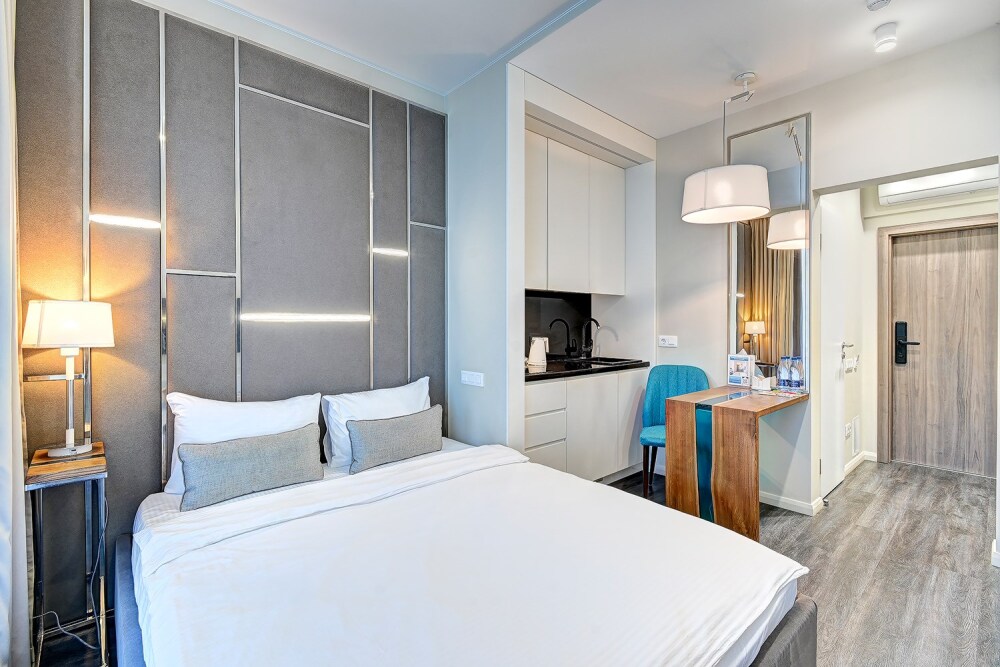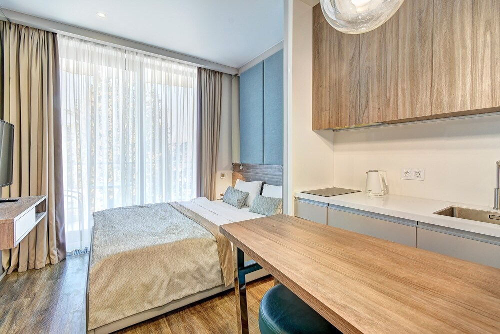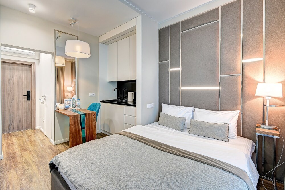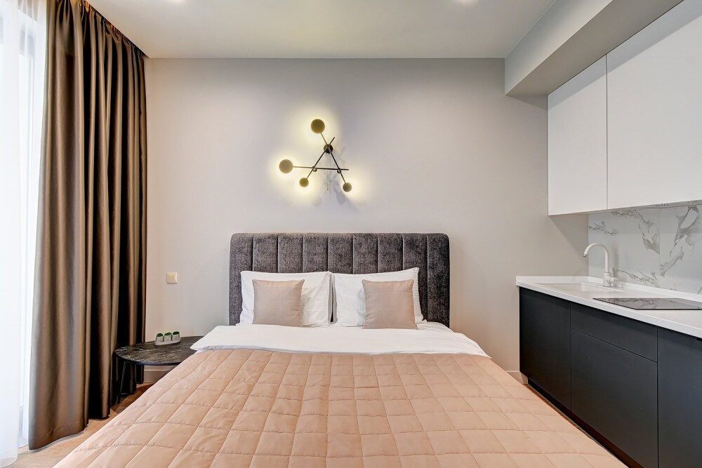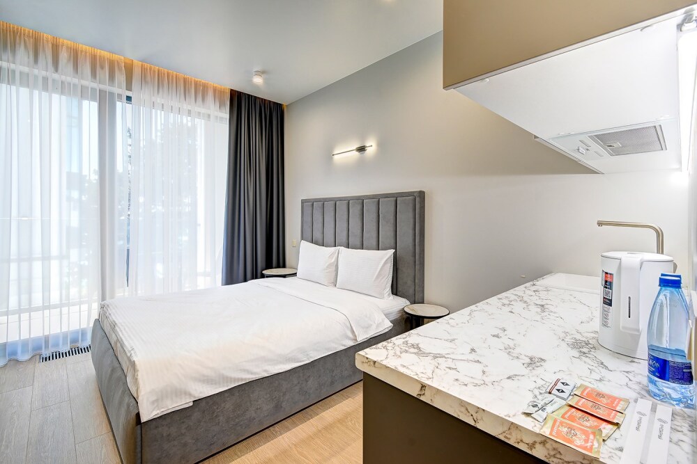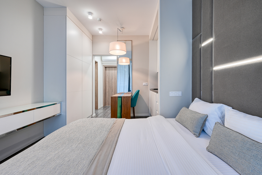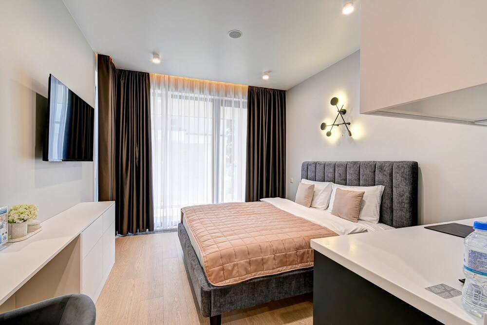 Широкий выбор апартаментов различного размера и конфигурации, чтобы соответствовать потребностям различных клиентов, будь то семьи, пары или деловые путешественники. От студий стандарт до номеров «Grand Luxe». Только высокое качество номеров с современным дизайном, удобствами и полным набором необходимых удобств для комфортного проживания. Полностью оборудованная мини-кухня, мягкая мебель из велюра, система кондиционирования и встроенного отопления, LCD-телевизор с цифровыми каналами и радио, фен, окна и двери с повышенной звукоизоляцией, высокоскоростной Wi-Fi, косметический набор.