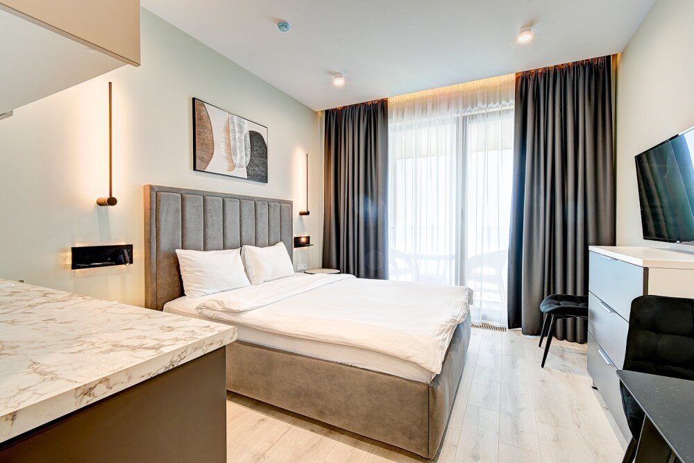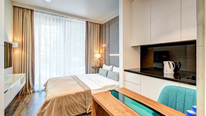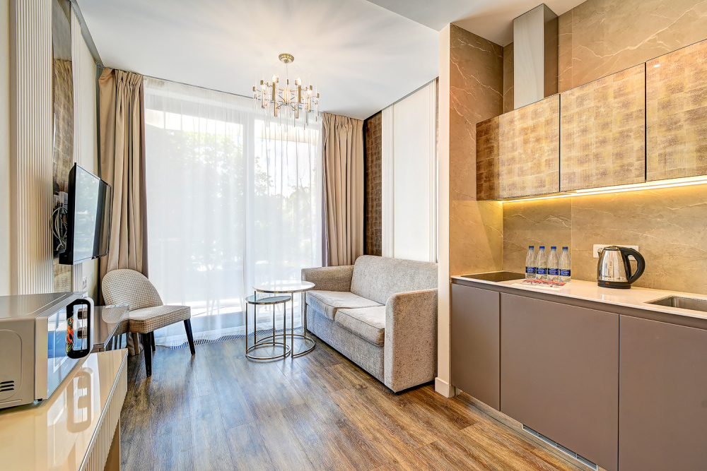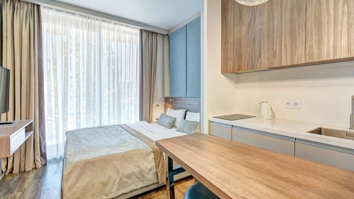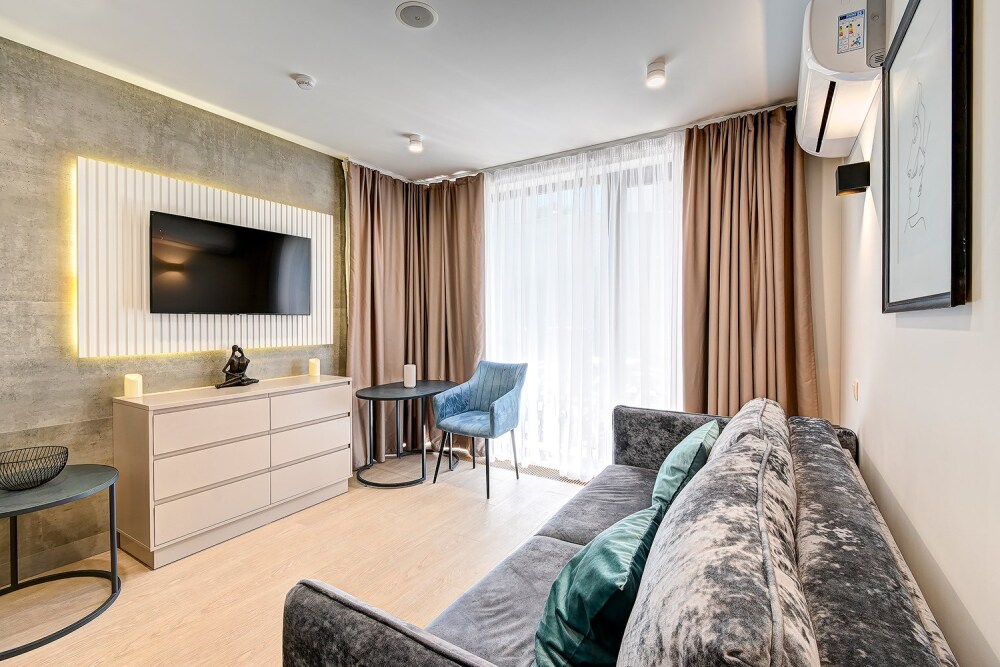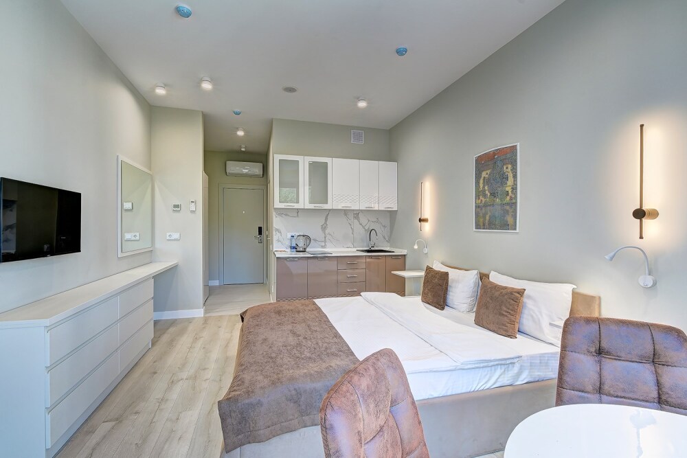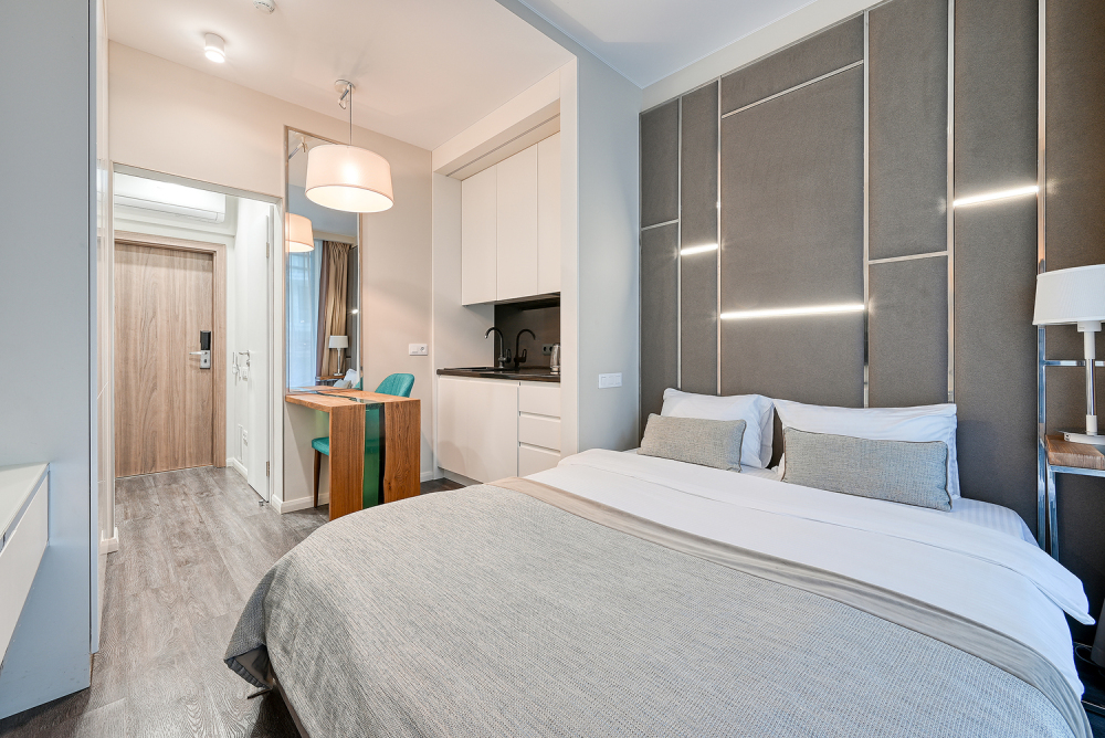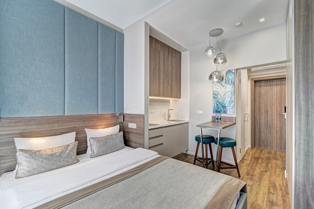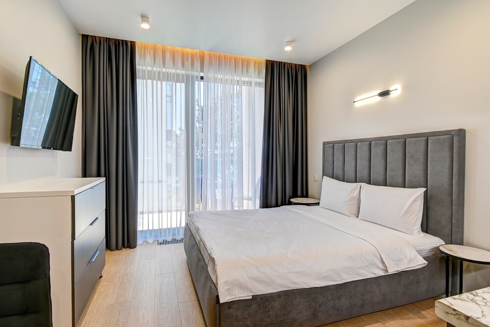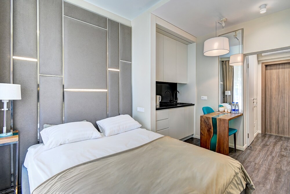 Широкий выбор апартаментов различного размера и конфигурации, чтобы соответствовать потребностям различных клиентов, будь то семьи, пары или деловые путешественники. От студий стандарт до номеров «Grand Luxe». Только высокое качество номеров с современным дизайном, удобствами и полным набором необходимых удобств для комфортного проживания. Полностью оборудованная мини-кухня, мягкая мебель из велюра, система кондиционирования и встроенного отопления, LCD-телевизор с цифровыми каналами и радио, фен, окна и двери с повышенной звукоизоляцией, высокоскоростной Wi-Fi, косметический набор.