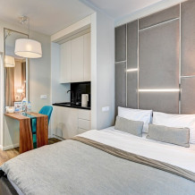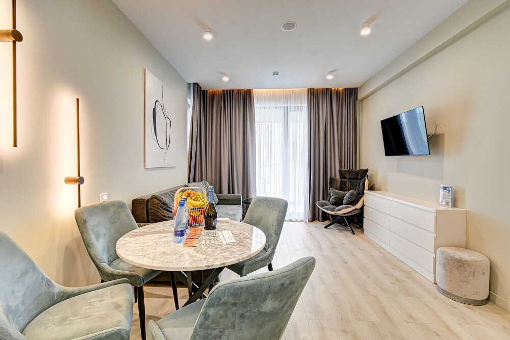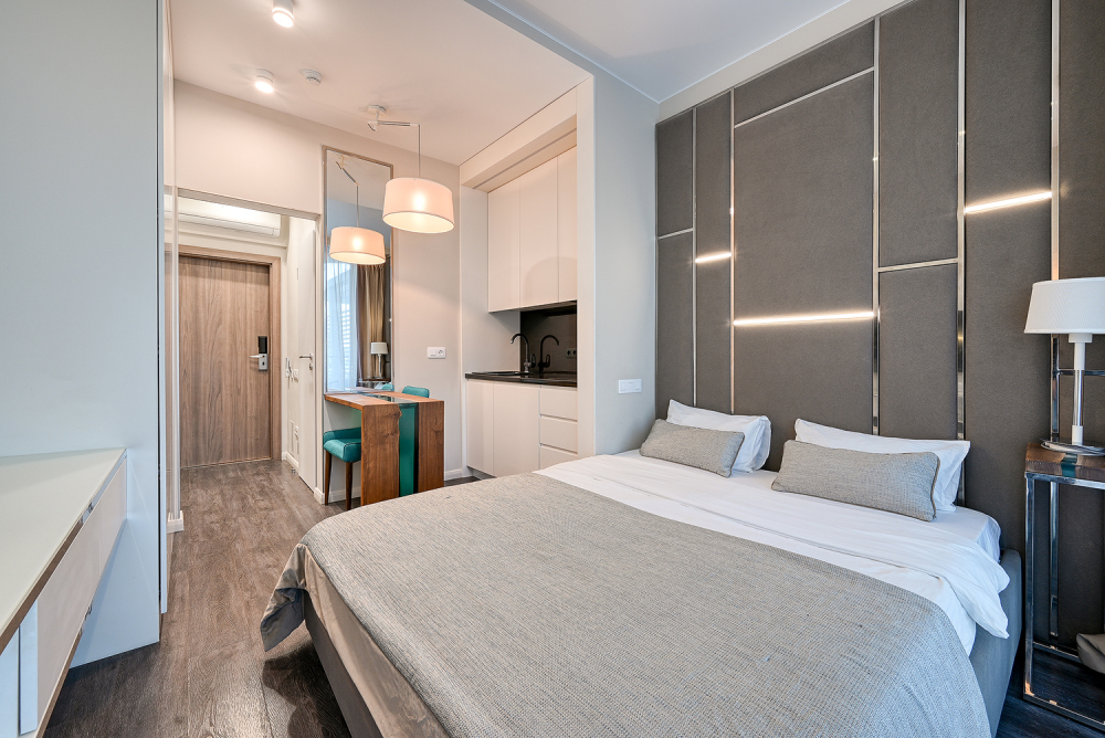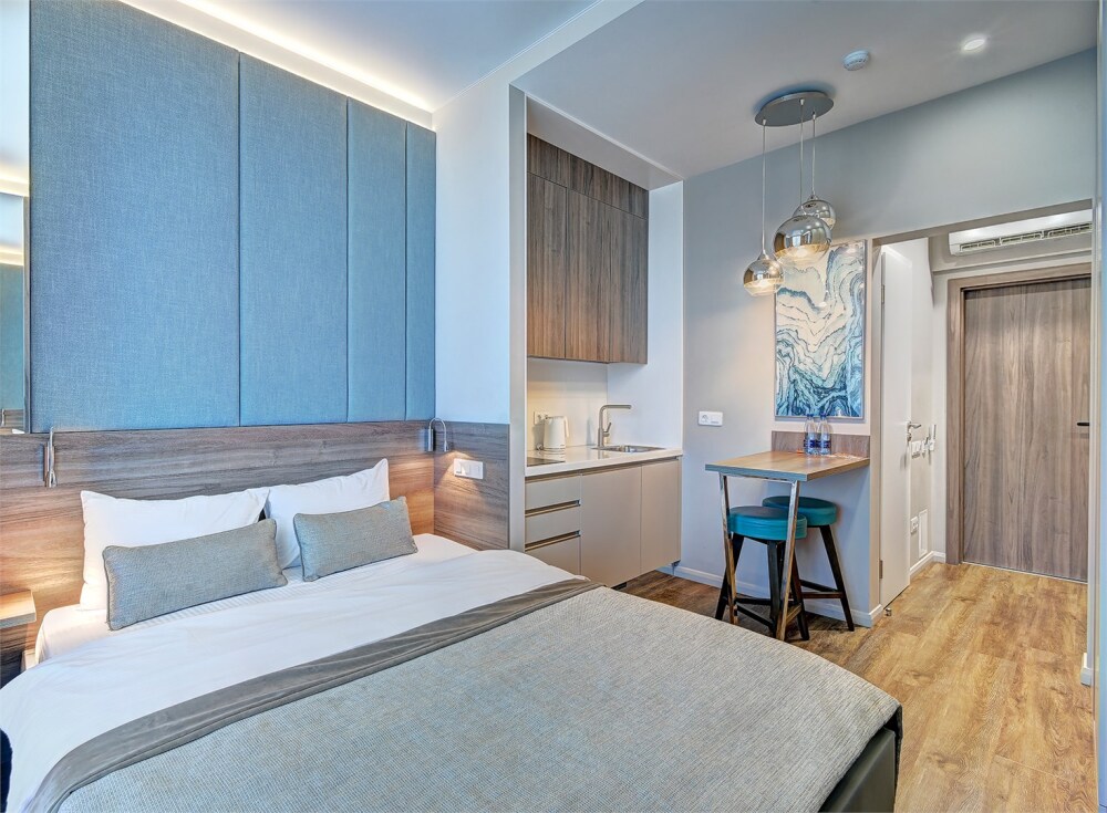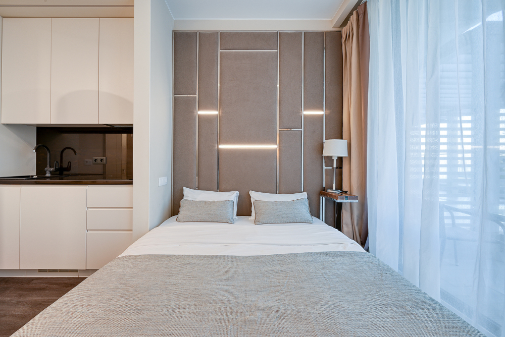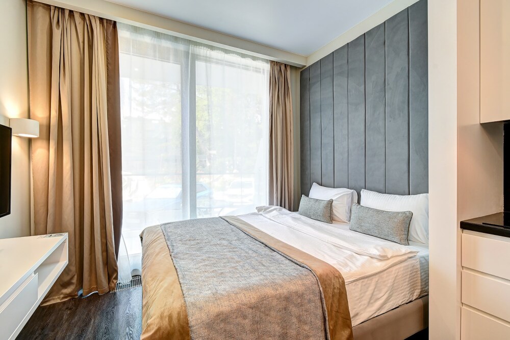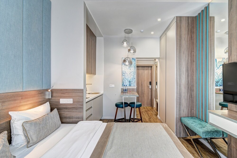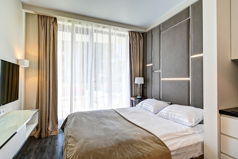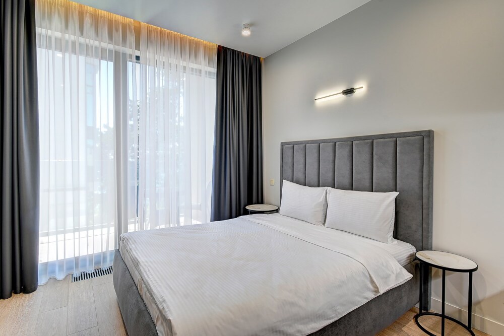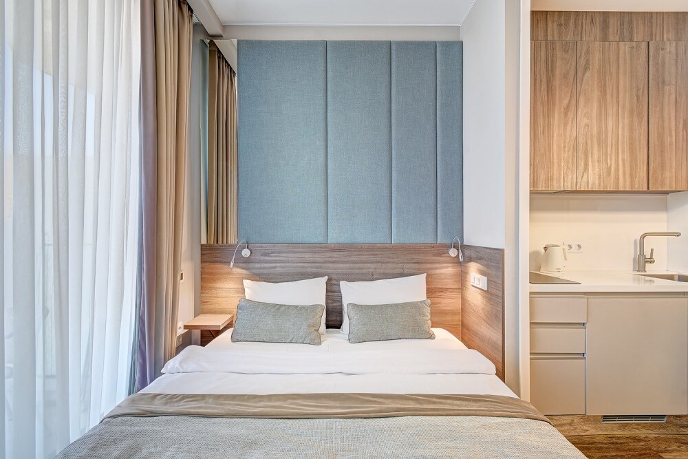 Широкий выбор апартаментов различного размера и конфигурации, чтобы соответствовать потребностям различных клиентов, будь то семьи, пары или деловые путешественники. От студий стандарт до номеров «Grand Luxe». Только высокое качество номеров с современным дизайном, удобствами и полным набором необходимых удобств для комфортного проживания. Полностью оборудованная мини-кухня, мягкая мебель из велюра, система кондиционирования и встроенного отопления, LCD-телевизор с цифровыми каналами и радио, фен, окна и двери с повышенной звукоизоляцией, высокоскоростной Wi-Fi, косметический набор.