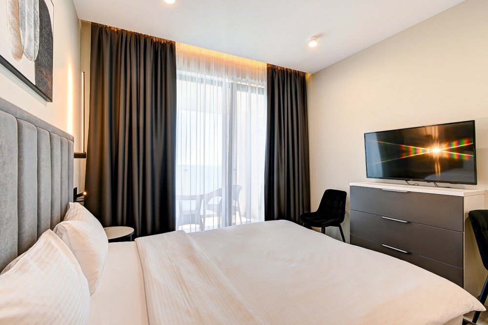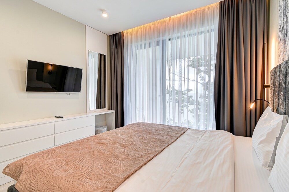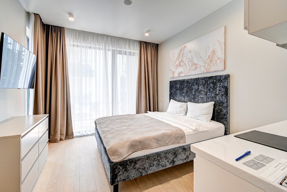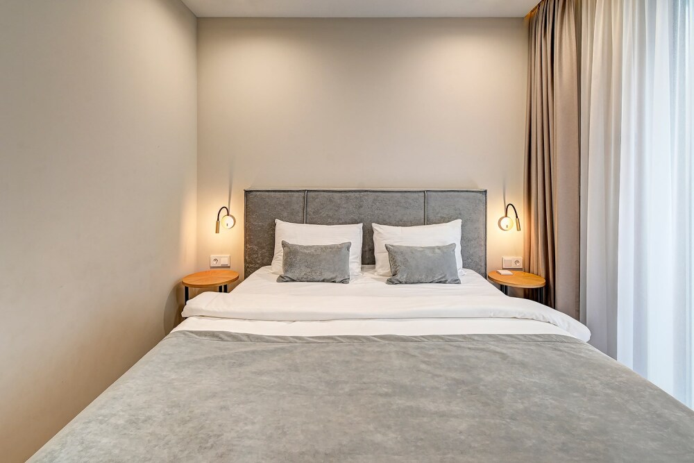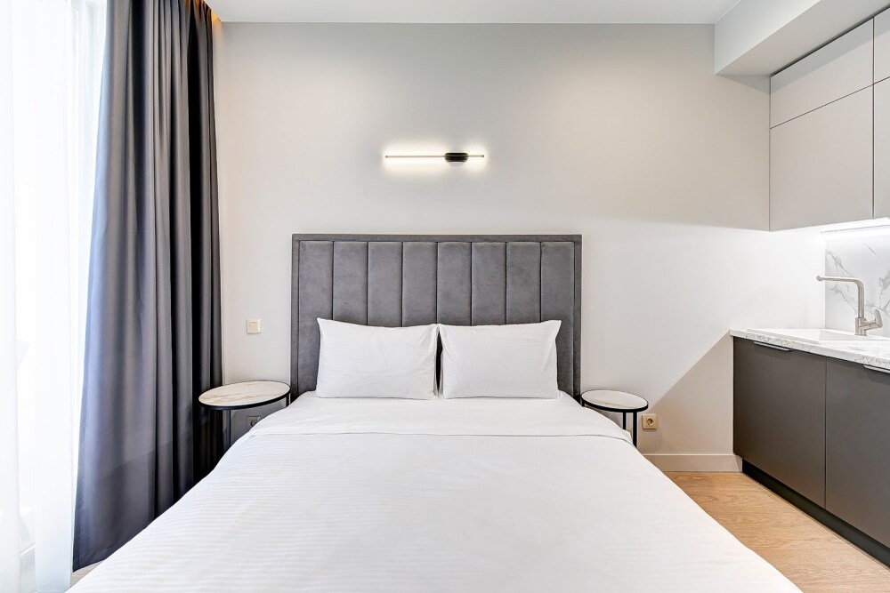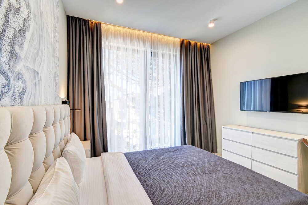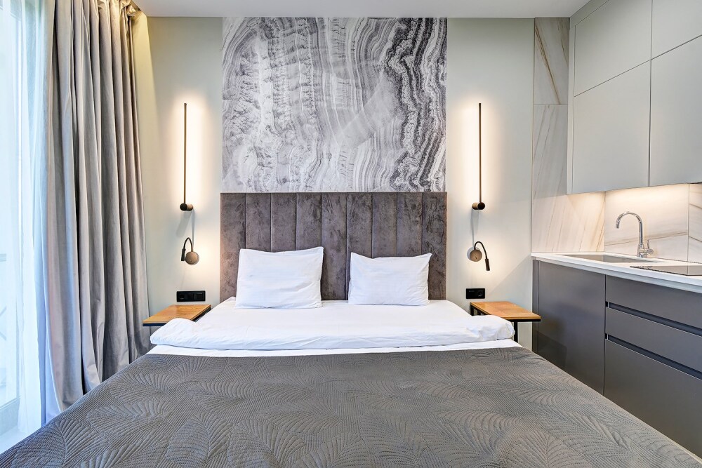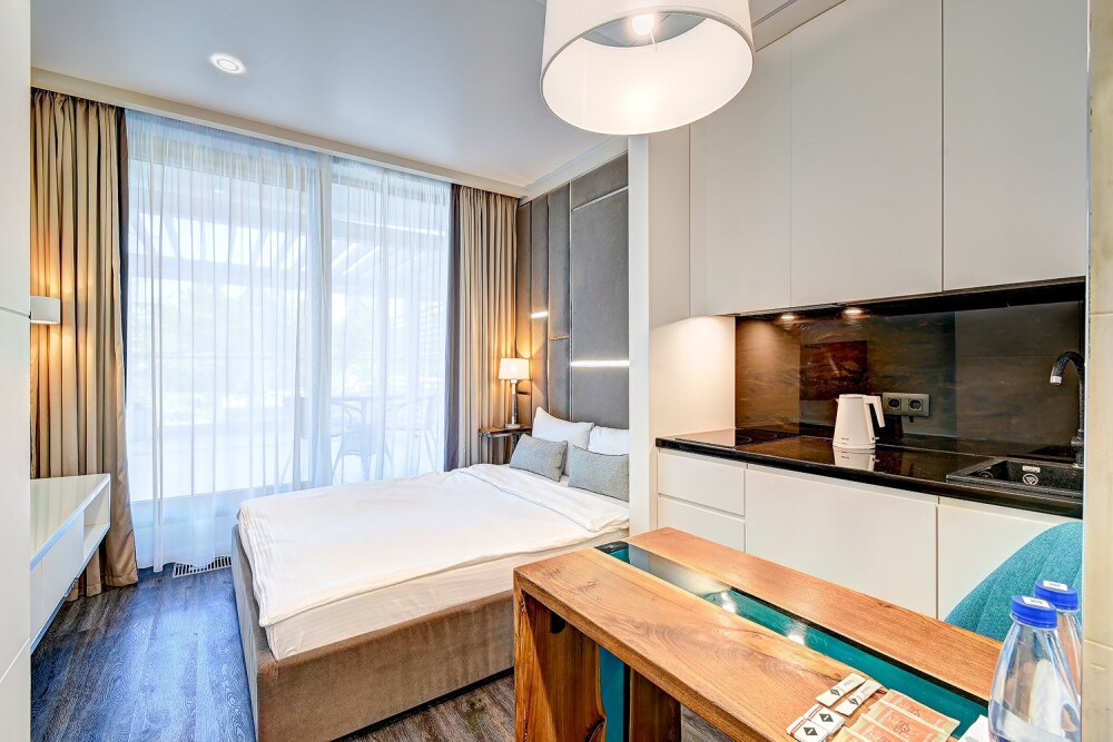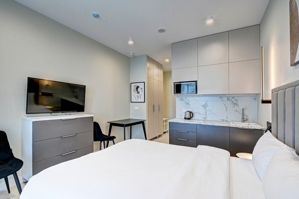 Широкий выбор апартаментов различного размера и конфигурации, чтобы соответствовать потребностям различных клиентов, будь то семьи, пары или деловые путешественники. От студий стандарт до номеров «Grand Luxe». Только высокое качество номеров с современным дизайном, удобствами и полным набором необходимых удобств для комфортного проживания. Полностью оборудованная мини-кухня, мягкая мебель из велюра, система кондиционирования и встроенного отопления, LCD-телевизор с цифровыми каналами и радио, фен, окна и двери с повышенной звукоизоляцией, высокоскоростной Wi-Fi, косметический набор.