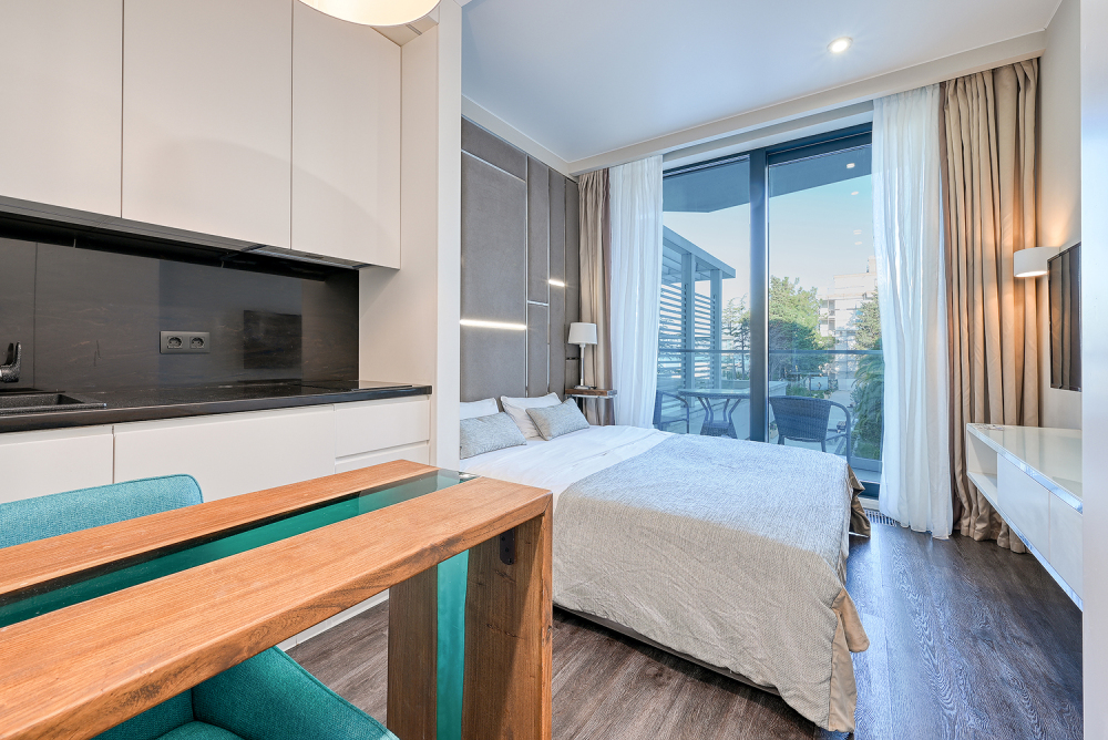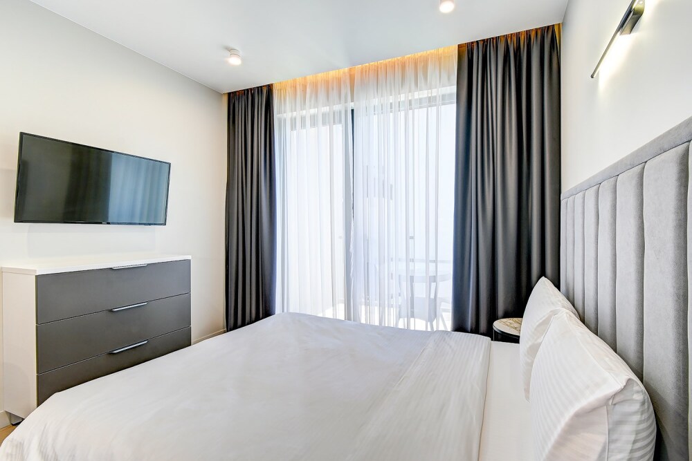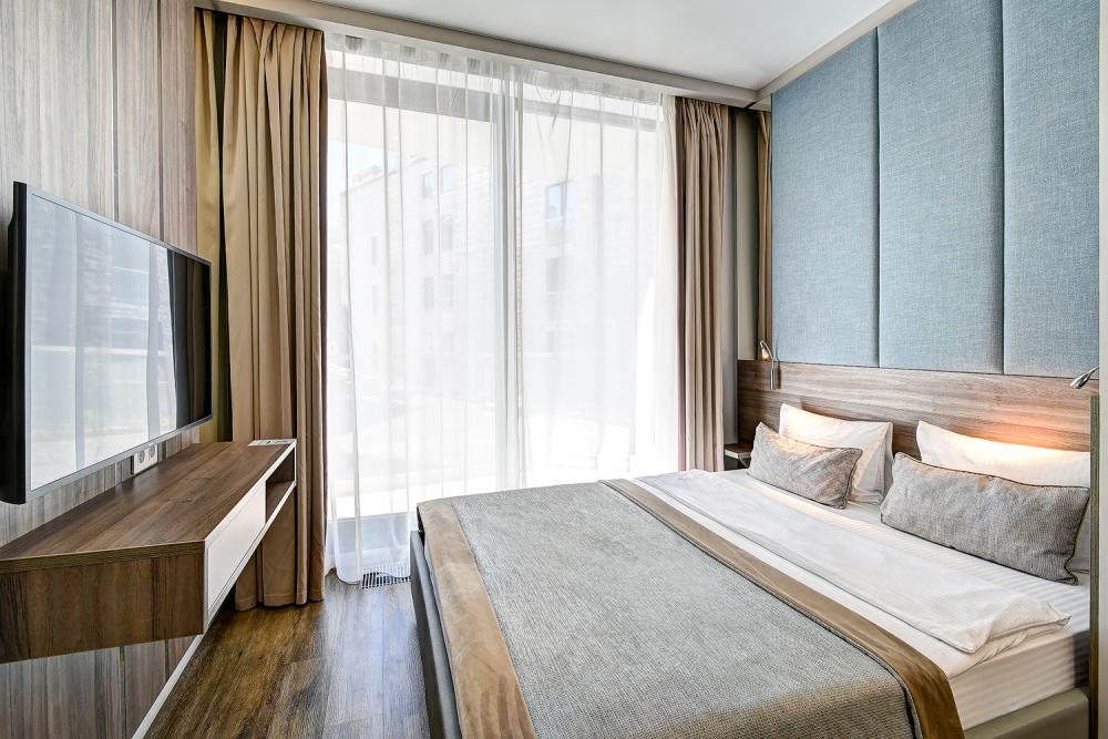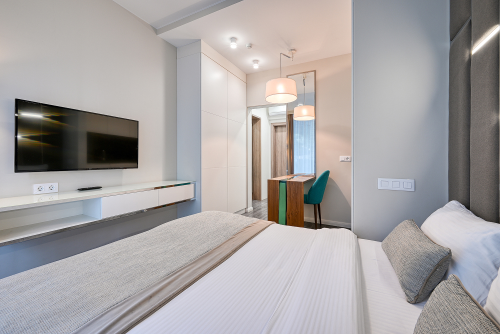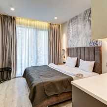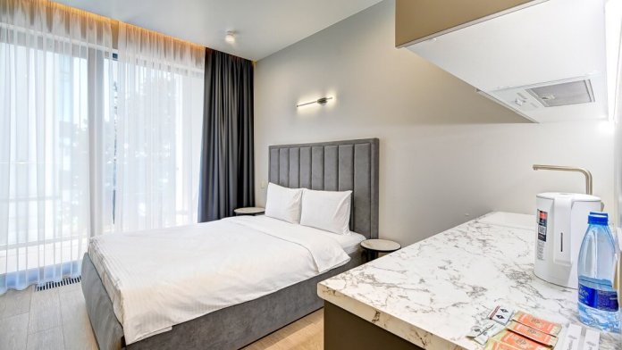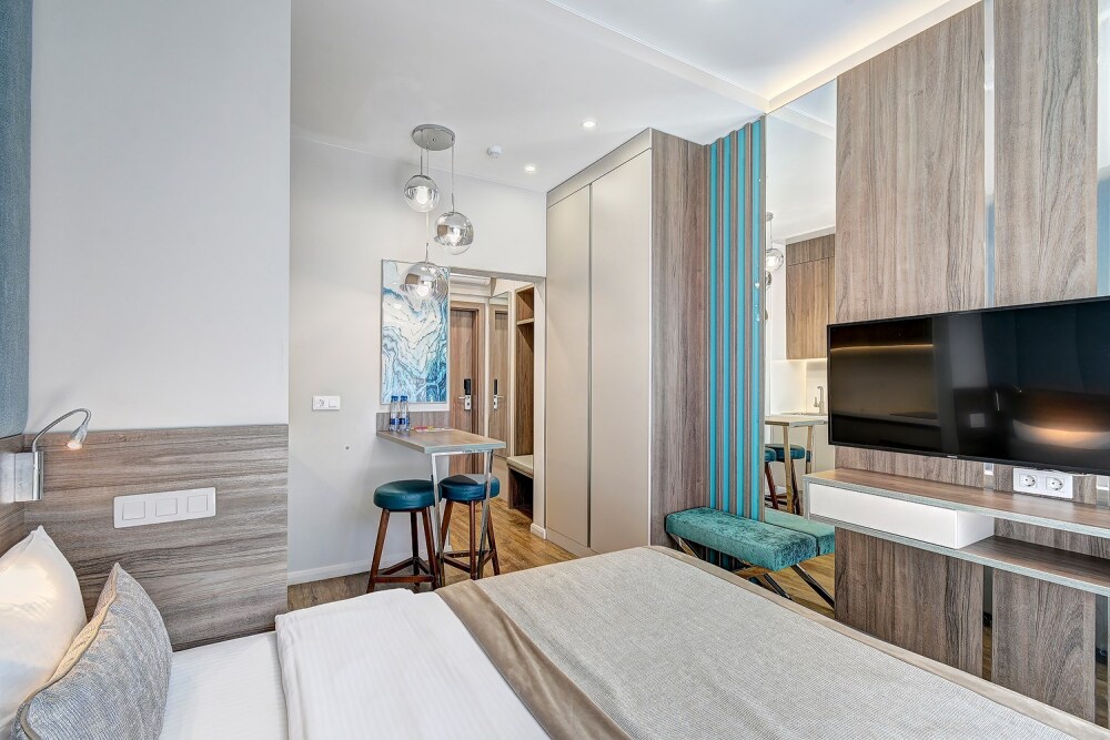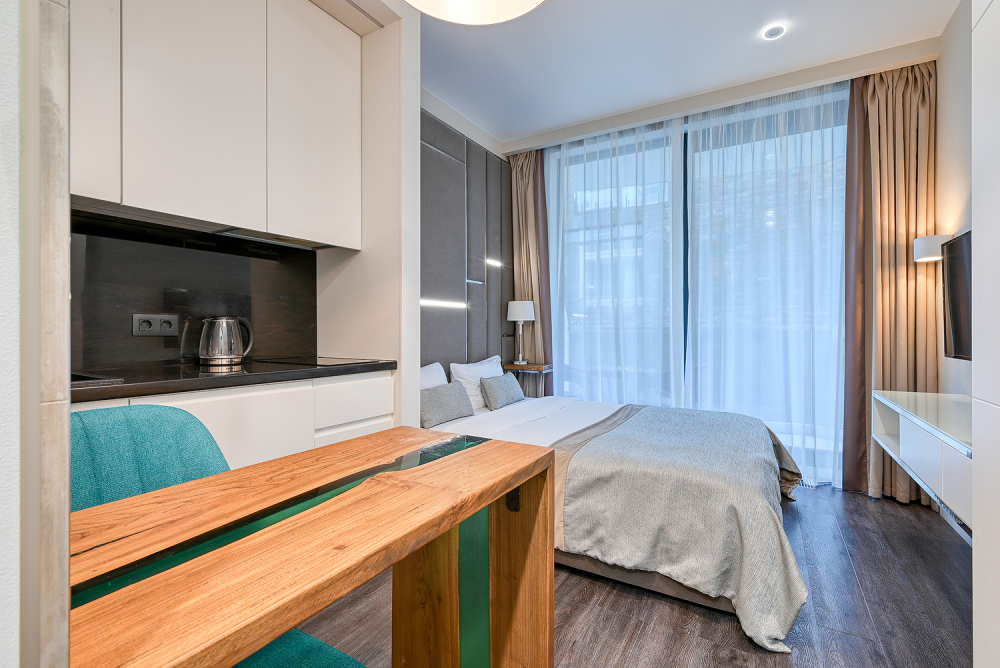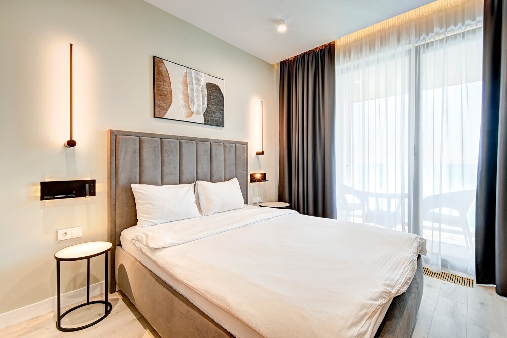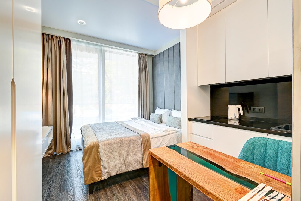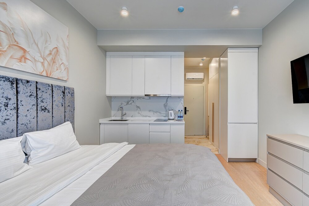 Широкий выбор апартаментов различного размера и конфигурации, чтобы соответствовать потребностям различных клиентов, будь то семьи, пары или деловые путешественники. От студий стандарт до номеров «Grand Luxe». Только высокое качество номеров с современным дизайном, удобствами и полным набором необходимых удобств для комфортного проживания. Полностью оборудованная мини-кухня, мягкая мебель из велюра, система кондиционирования и встроенного отопления, LCD-телевизор с цифровыми каналами и радио, фен, окна и двери с повышенной звукоизоляцией, высокоскоростной Wi-Fi, косметический набор.
