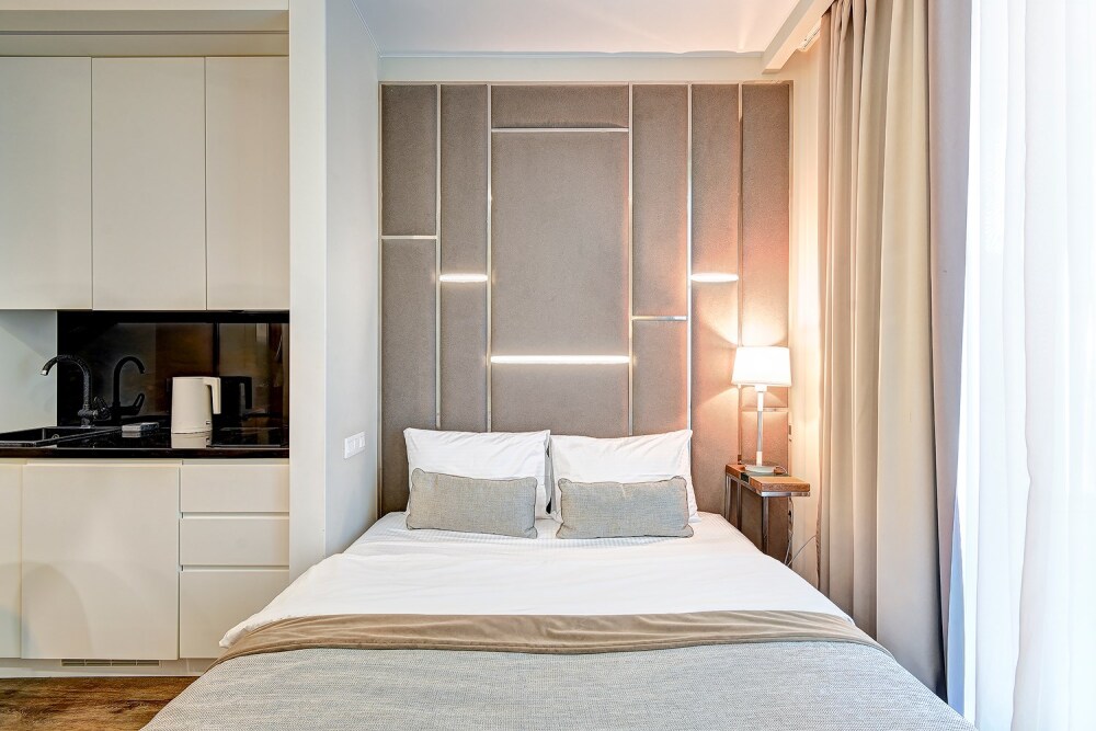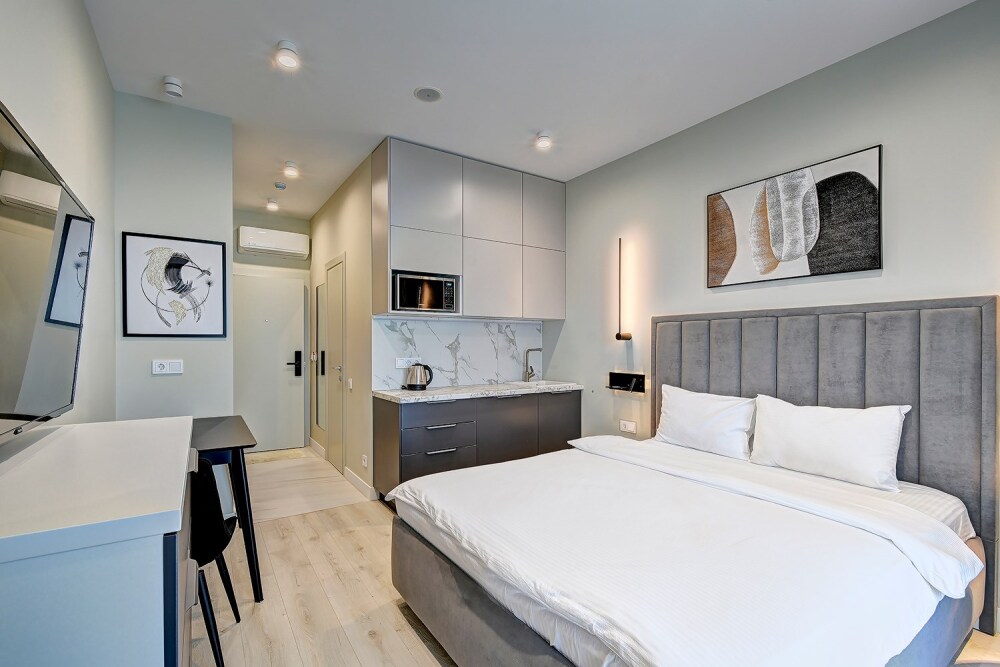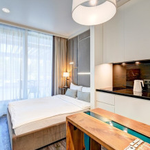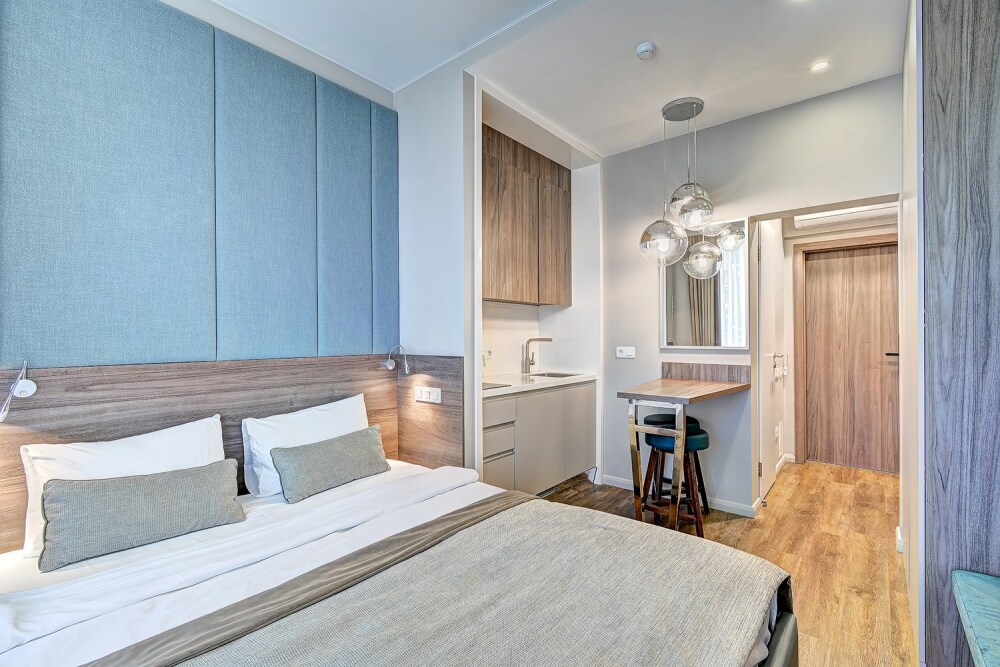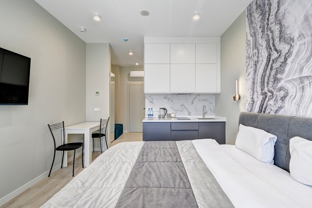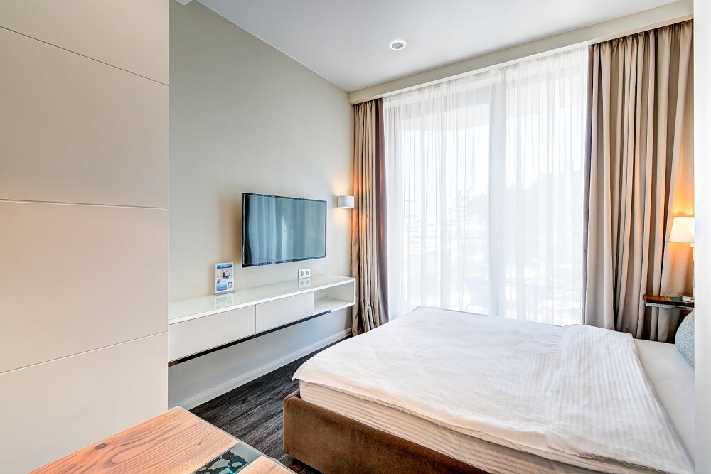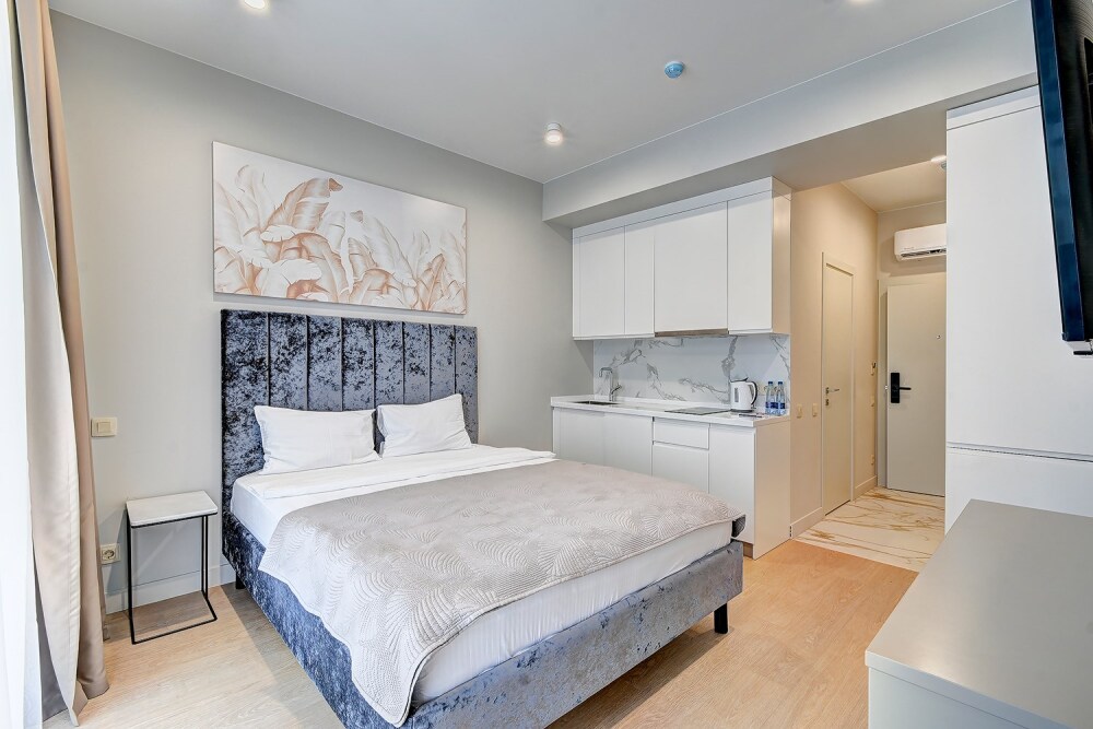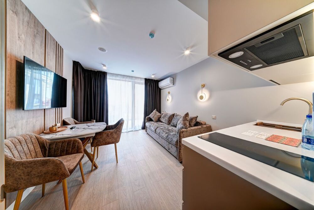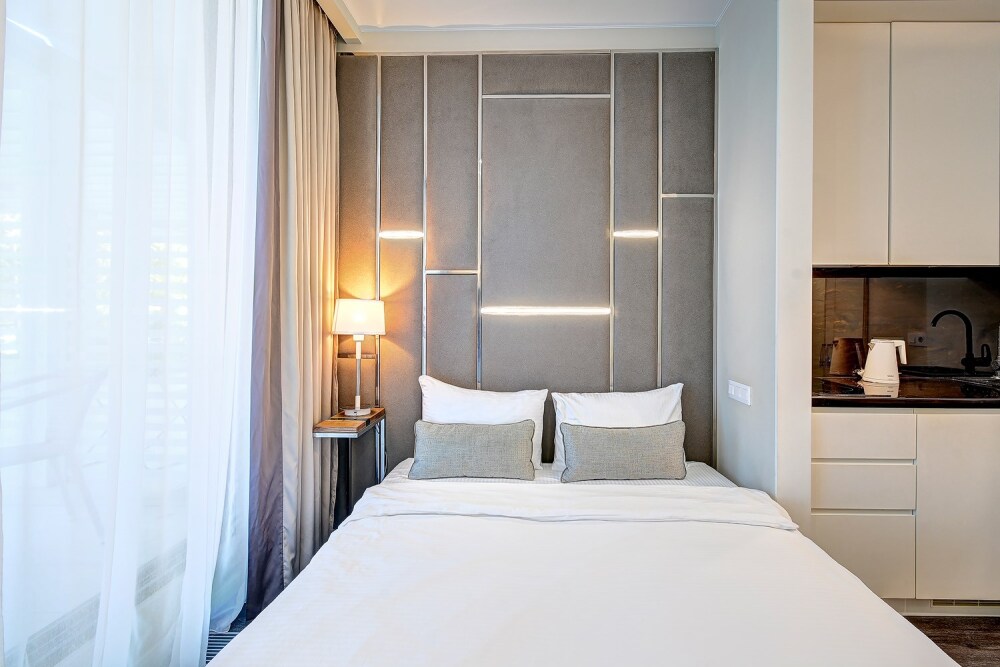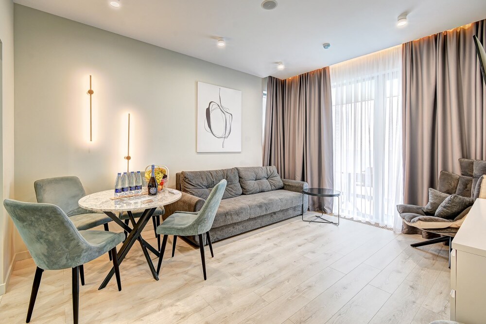 Широкий выбор апартаментов различного размера и конфигурации, чтобы соответствовать потребностям различных клиентов, будь то семьи, пары или деловые путешественники. От студий стандарт до номеров «Grand Luxe». Только высокое качество номеров с современным дизайном, удобствами и полным набором необходимых удобств для комфортного проживания. Полностью оборудованная мини-кухня, мягкая мебель из велюра, система кондиционирования и встроенного отопления, LCD-телевизор с цифровыми каналами и радио, фен, окна и двери с повышенной звукоизоляцией, высокоскоростной Wi-Fi, косметический набор.