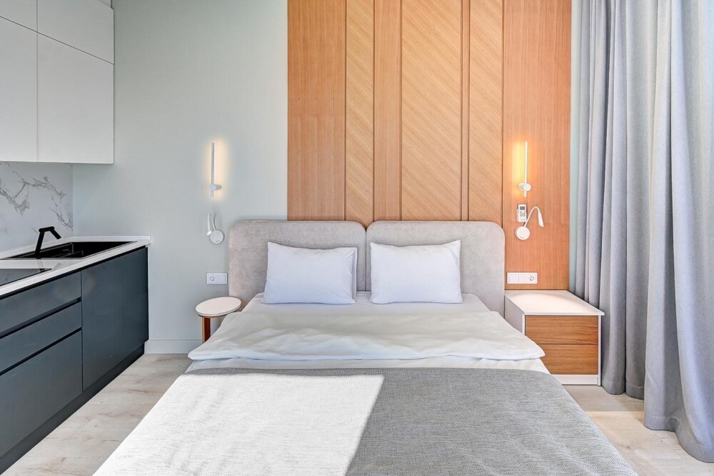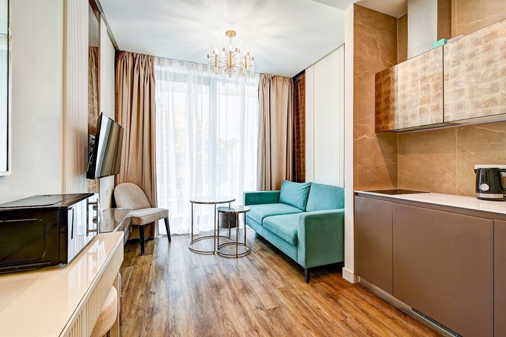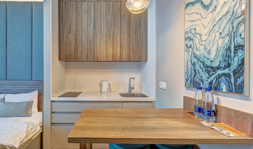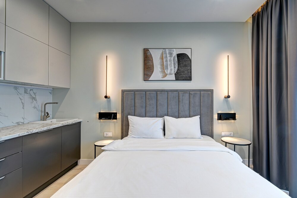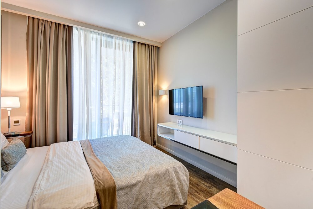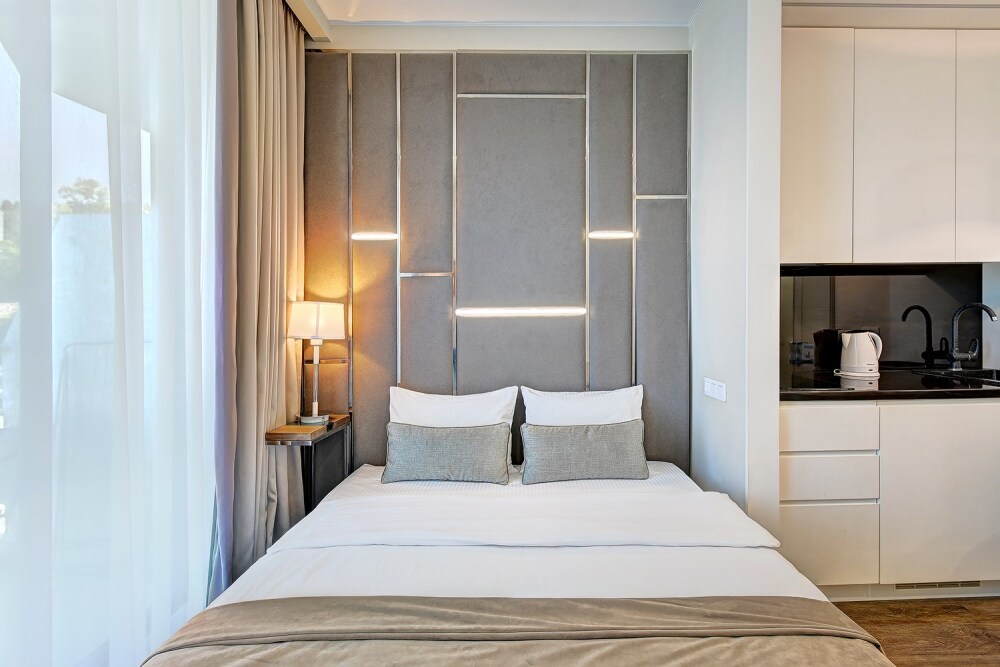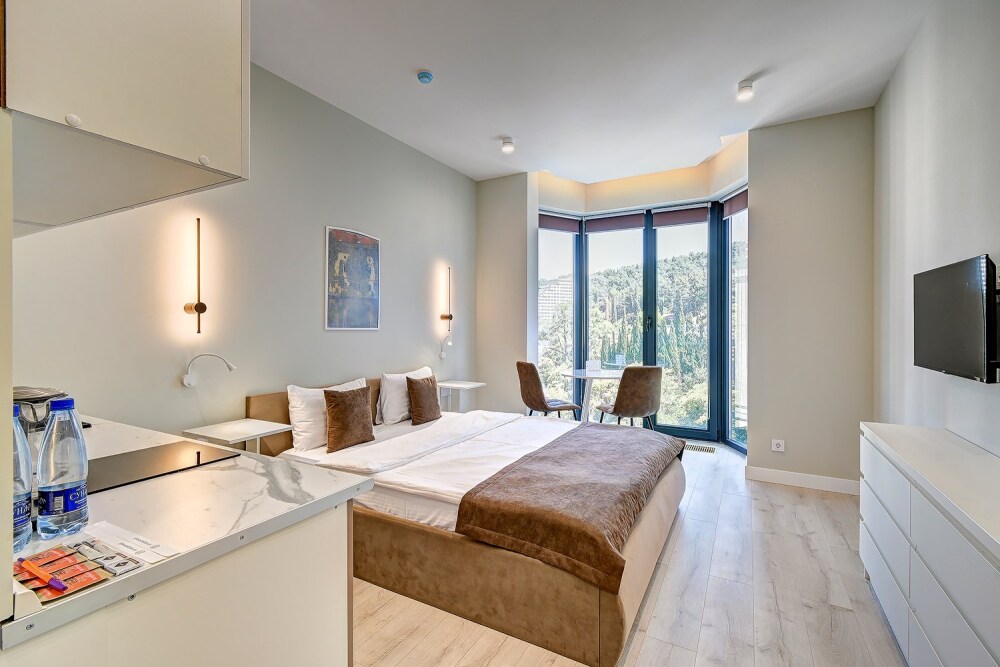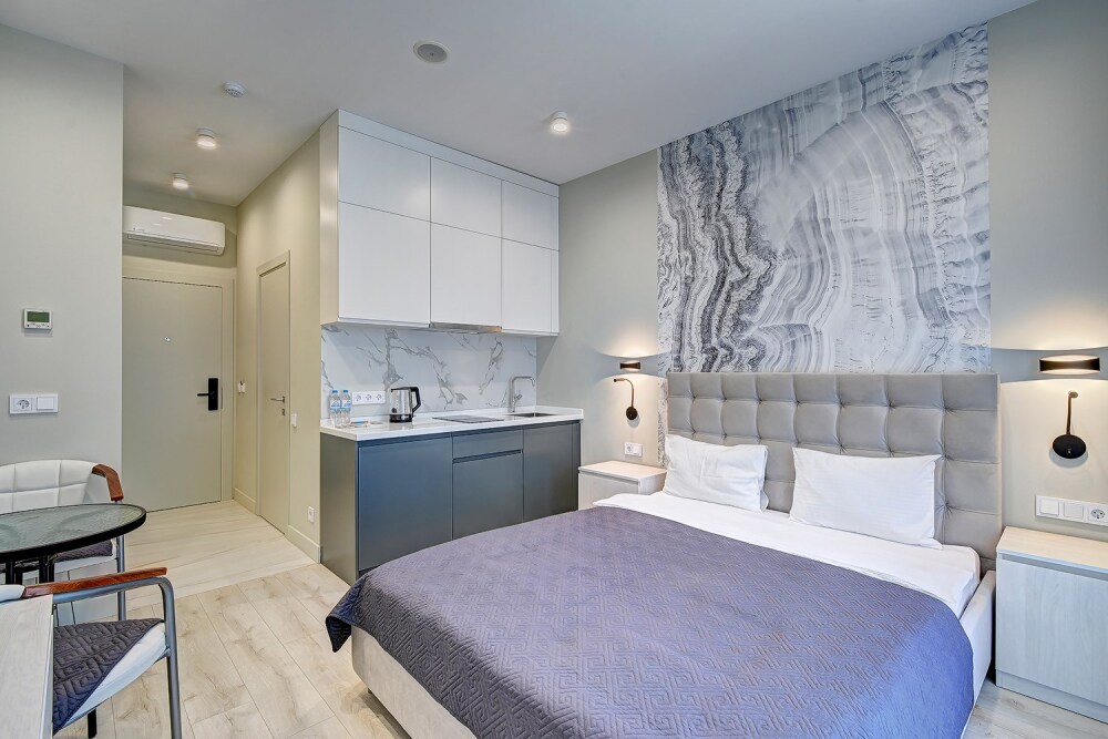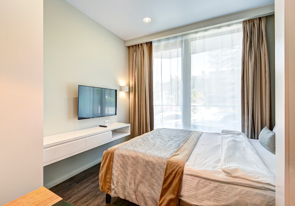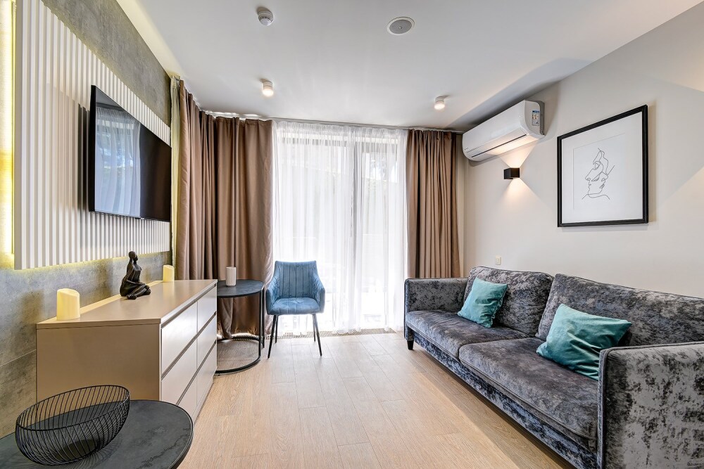 Широкий выбор апартаментов различного размера и конфигурации, чтобы соответствовать потребностям различных клиентов, будь то семьи, пары или деловые путешественники. От студий стандарт до номеров «Grand Luxe». Только высокое качество номеров с современным дизайном, удобствами и полным набором необходимых удобств для комфортного проживания. Полностью оборудованная мини-кухня, мягкая мебель из велюра, система кондиционирования и встроенного отопления, LCD-телевизор с цифровыми каналами и радио, фен, окна и двери с повышенной звукоизоляцией, высокоскоростной Wi-Fi, косметический набор.