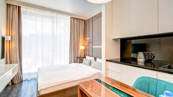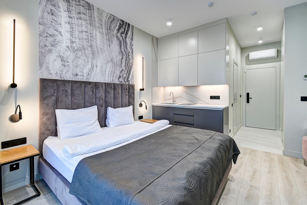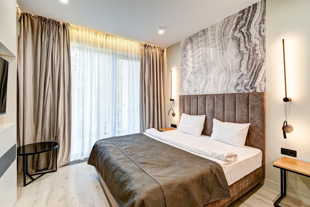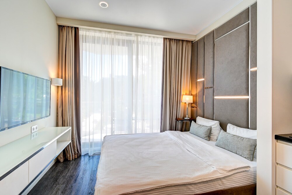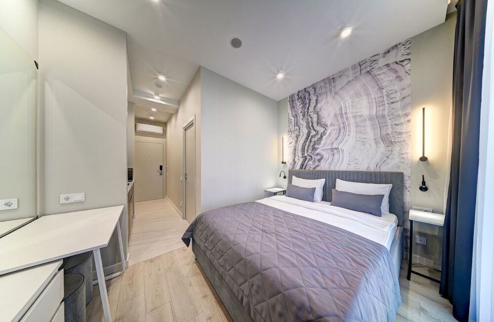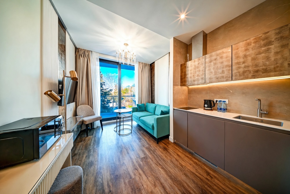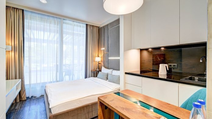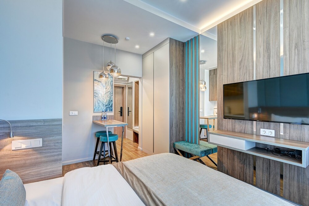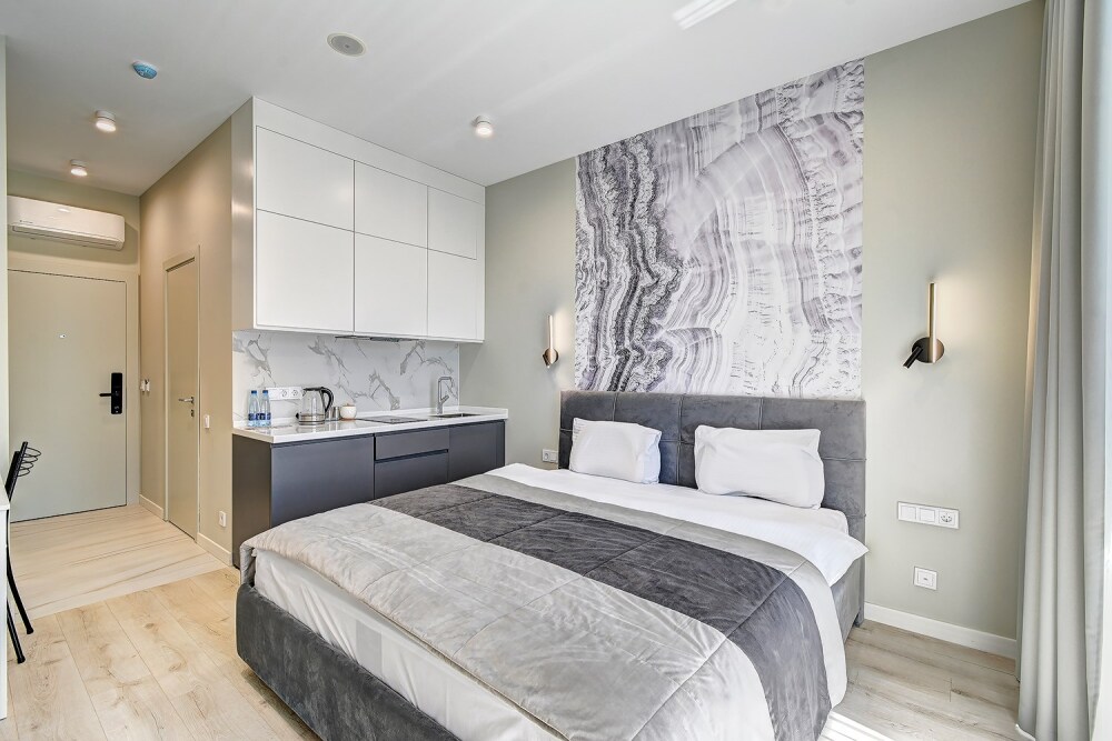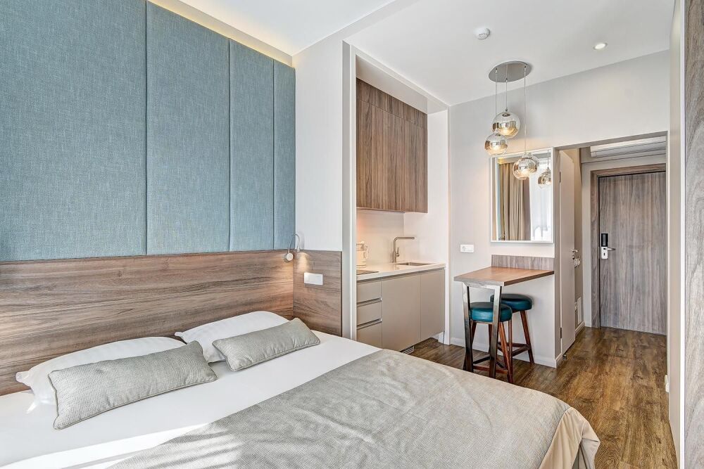 Широкий выбор апартаментов различного размера и конфигурации, чтобы соответствовать потребностям различных клиентов, будь то семьи, пары или деловые путешественники. От студий стандарт до номеров «Grand Luxe». Только высокое качество номеров с современным дизайном, удобствами и полным набором необходимых удобств для комфортного проживания. Полностью оборудованная мини-кухня, мягкая мебель из велюра, система кондиционирования и встроенного отопления, LCD-телевизор с цифровыми каналами и радио, фен, окна и двери с повышенной звукоизоляцией, высокоскоростной Wi-Fi, косметический набор.