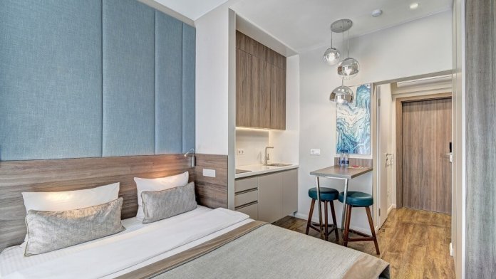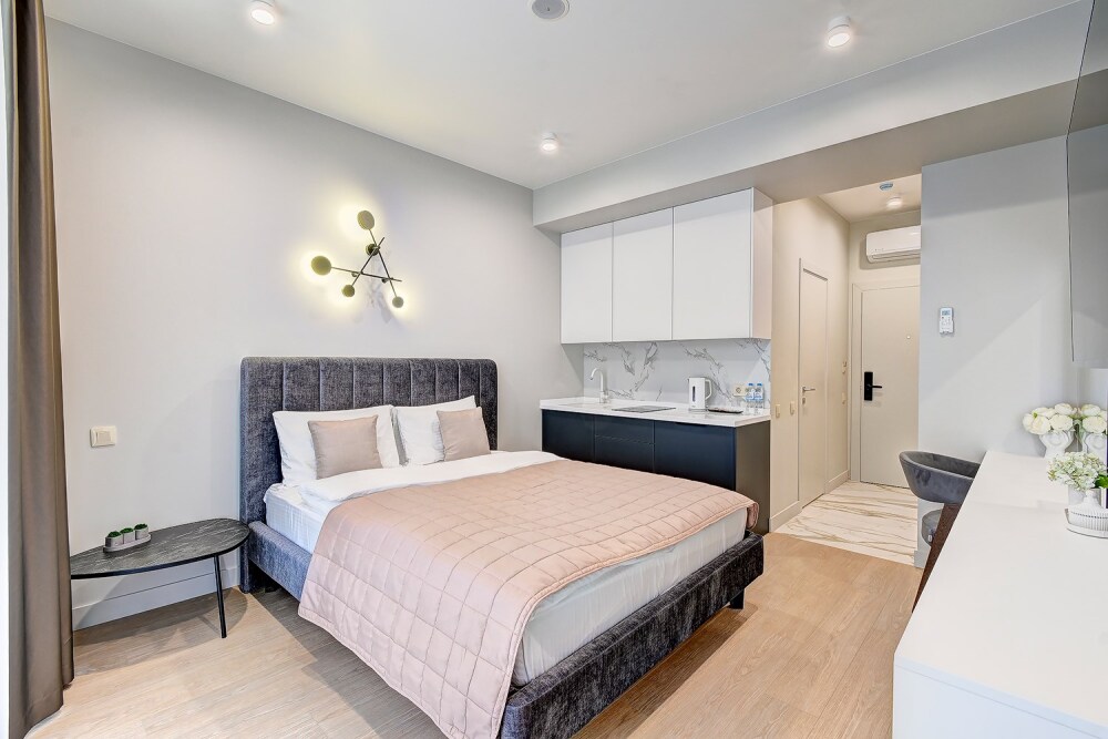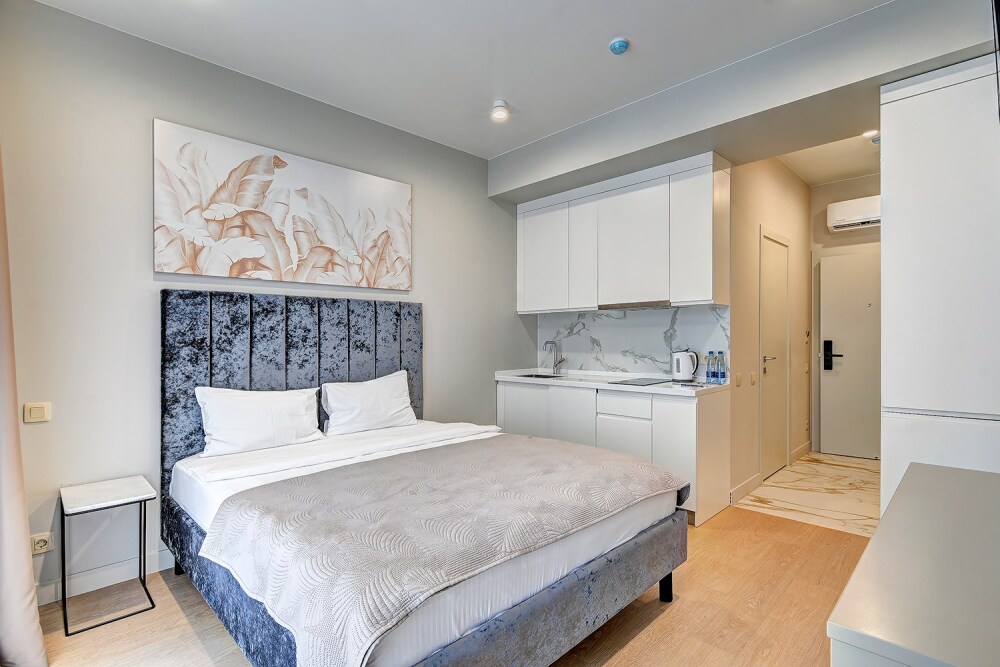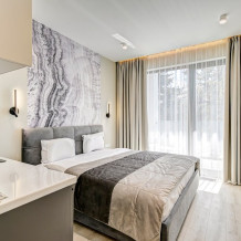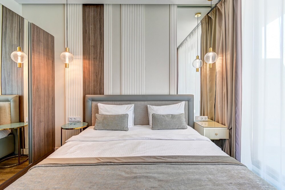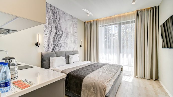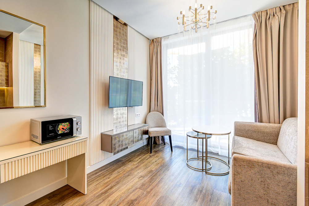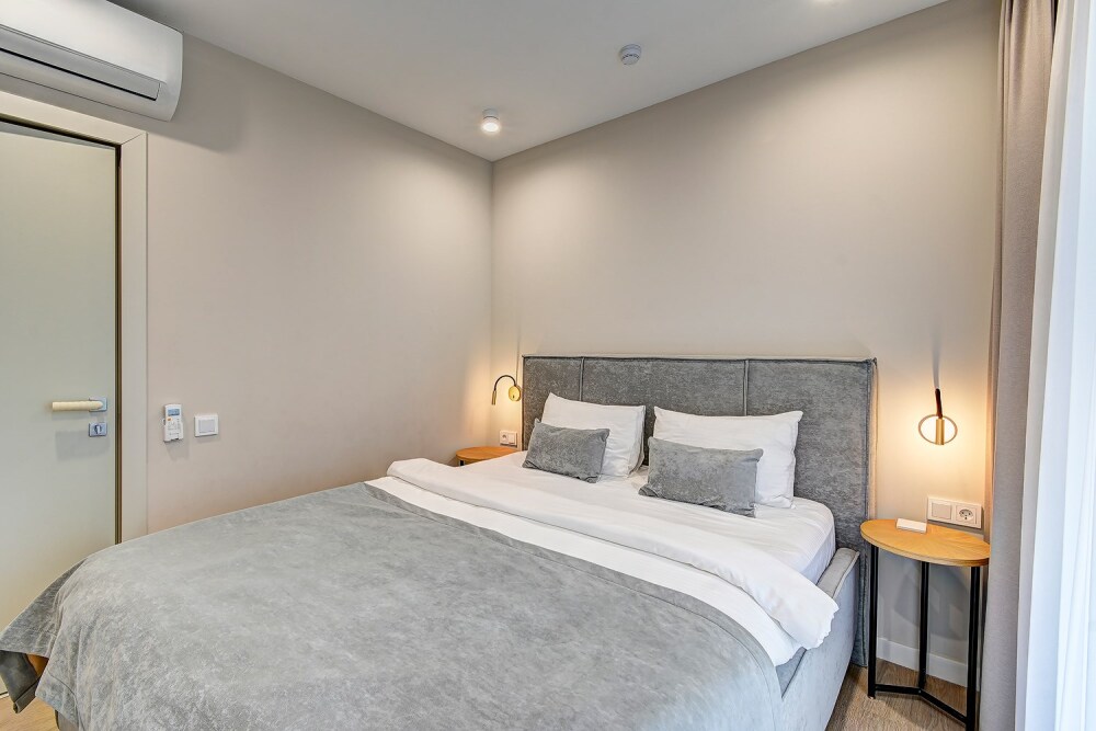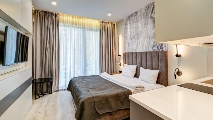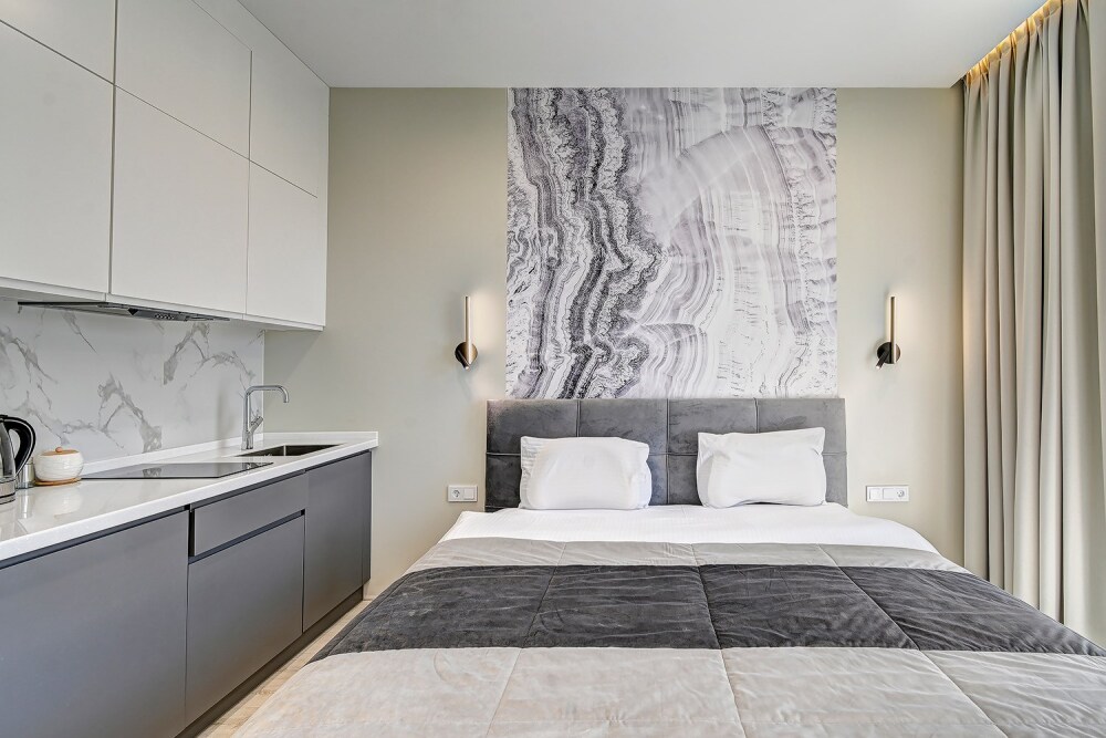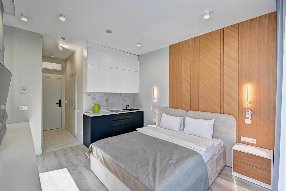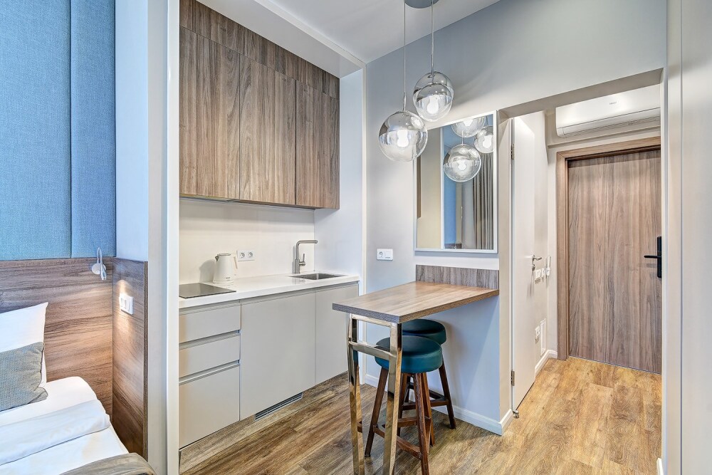 Широкий выбор апартаментов различного размера и конфигурации, чтобы соответствовать потребностям различных клиентов, будь то семьи, пары или деловые путешественники. От студий стандарт до номеров «Grand Luxe». Только высокое качество номеров с современным дизайном, удобствами и полным набором необходимых удобств для комфортного проживания. Полностью оборудованная мини-кухня, мягкая мебель из велюра, система кондиционирования и встроенного отопления, LCD-телевизор с цифровыми каналами и радио, фен, окна и двери с повышенной звукоизоляцией, высокоскоростной Wi-Fi, косметический набор.