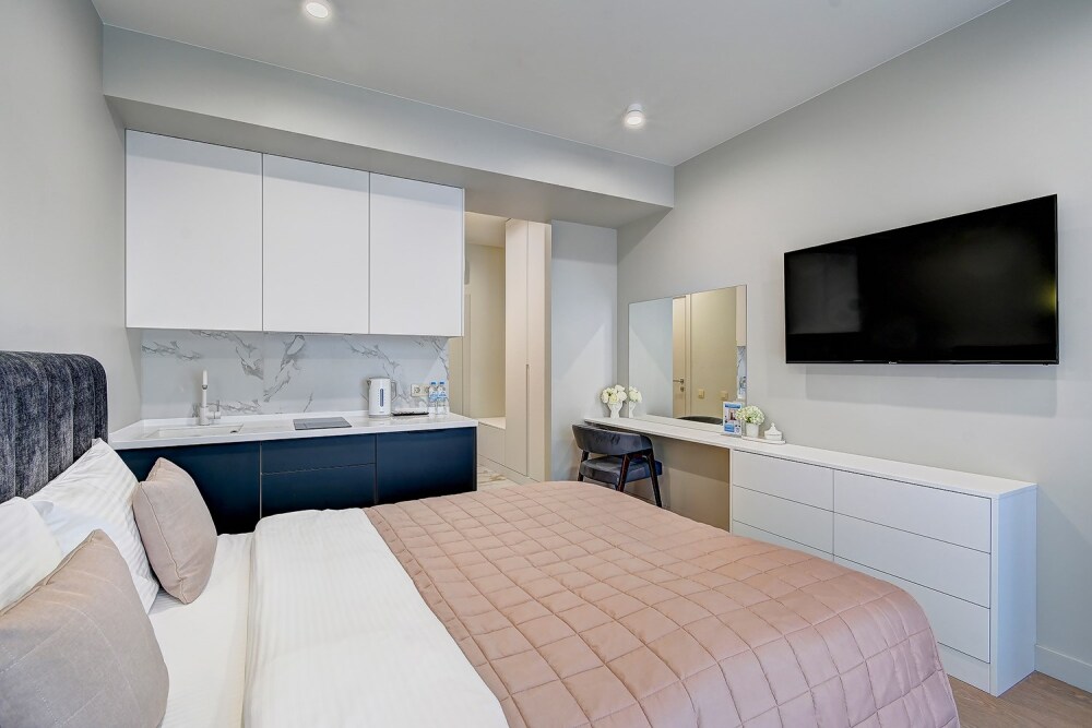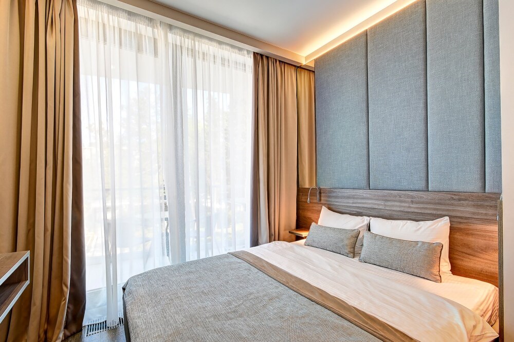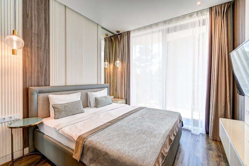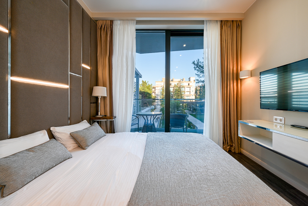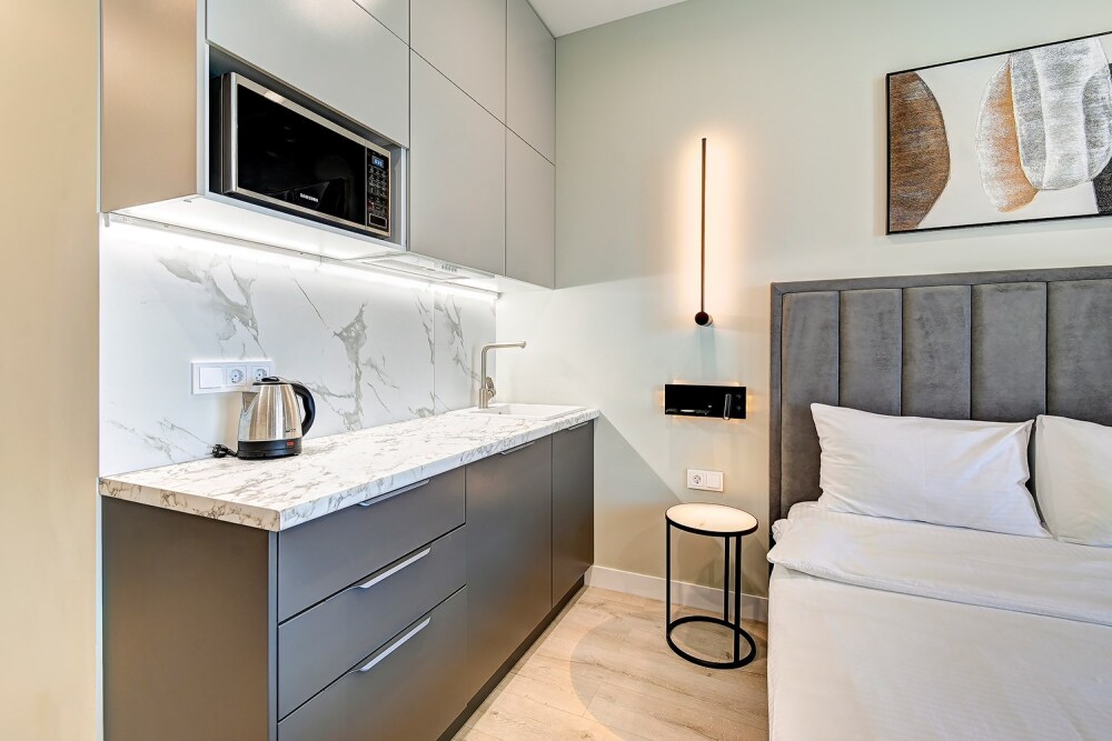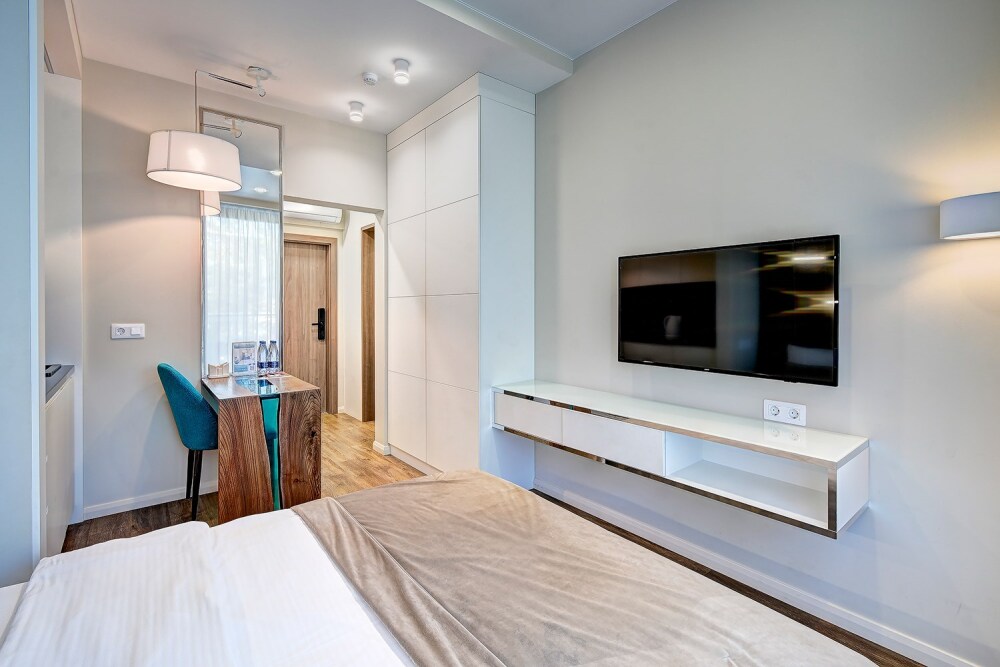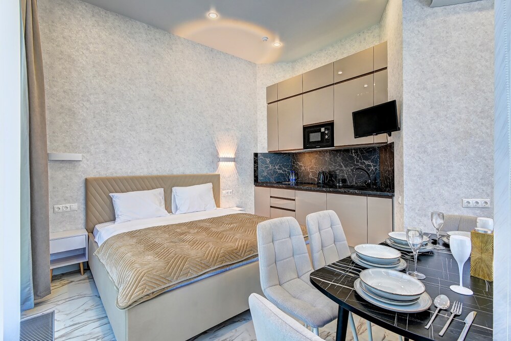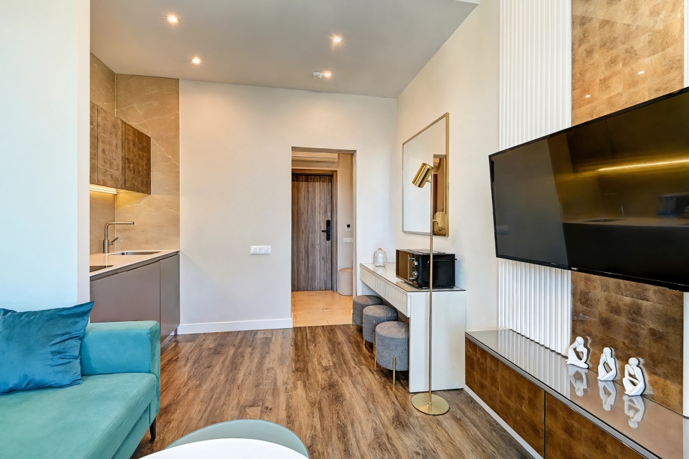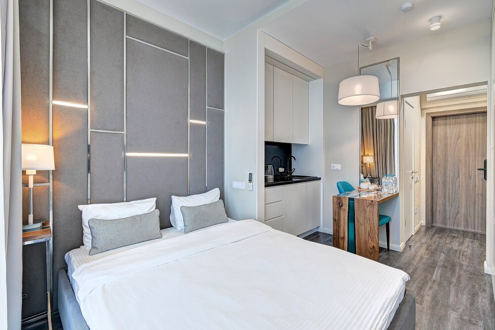 Широкий выбор апартаментов различного размера и конфигурации, чтобы соответствовать потребностям различных клиентов, будь то семьи, пары или деловые путешественники. От студий стандарт до номеров «Grand Luxe». Только высокое качество номеров с современным дизайном, удобствами и полным набором необходимых удобств для комфортного проживания. Полностью оборудованная мини-кухня, мягкая мебель из велюра, система кондиционирования и встроенного отопления, LCD-телевизор с цифровыми каналами и радио, фен, окна и двери с повышенной звукоизоляцией, высокоскоростной Wi-Fi, косметический набор.