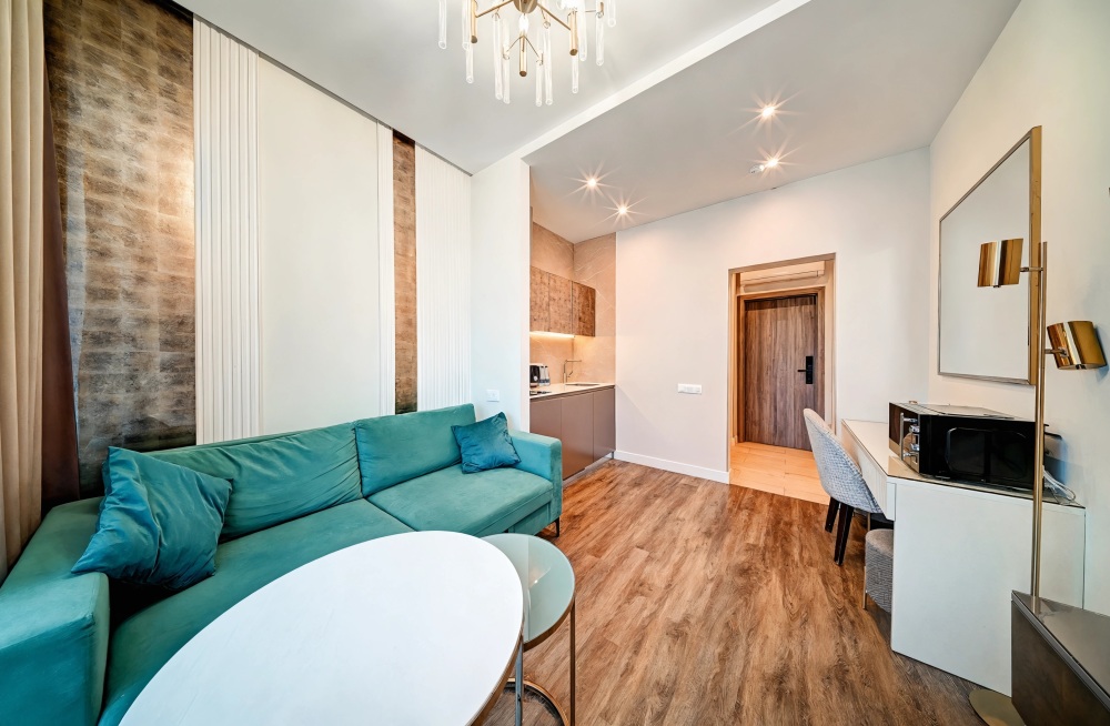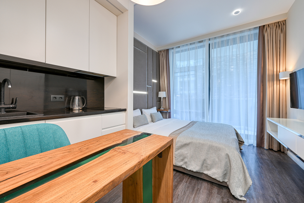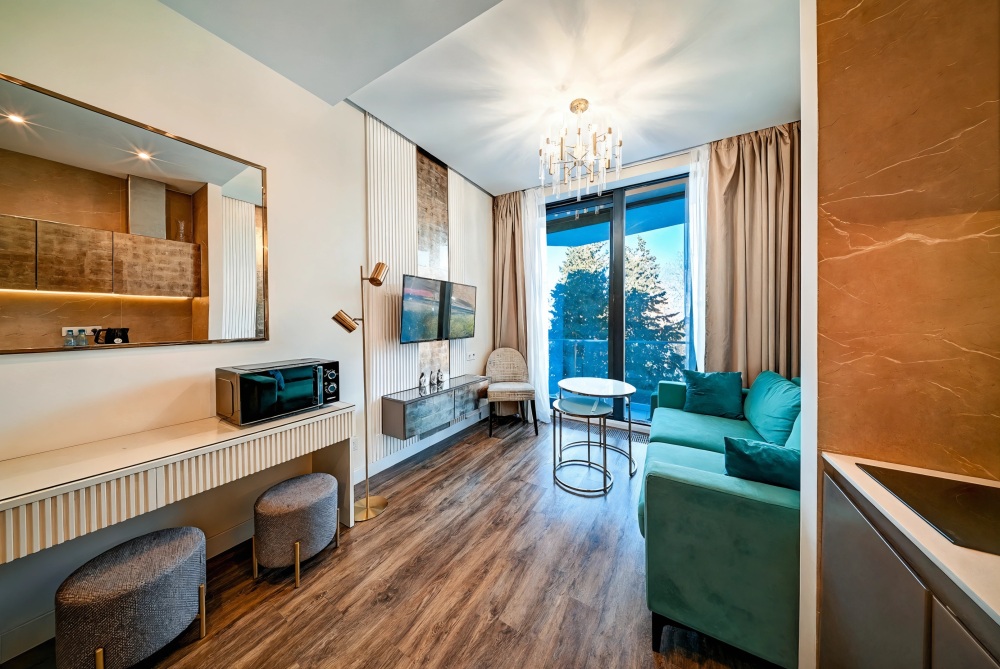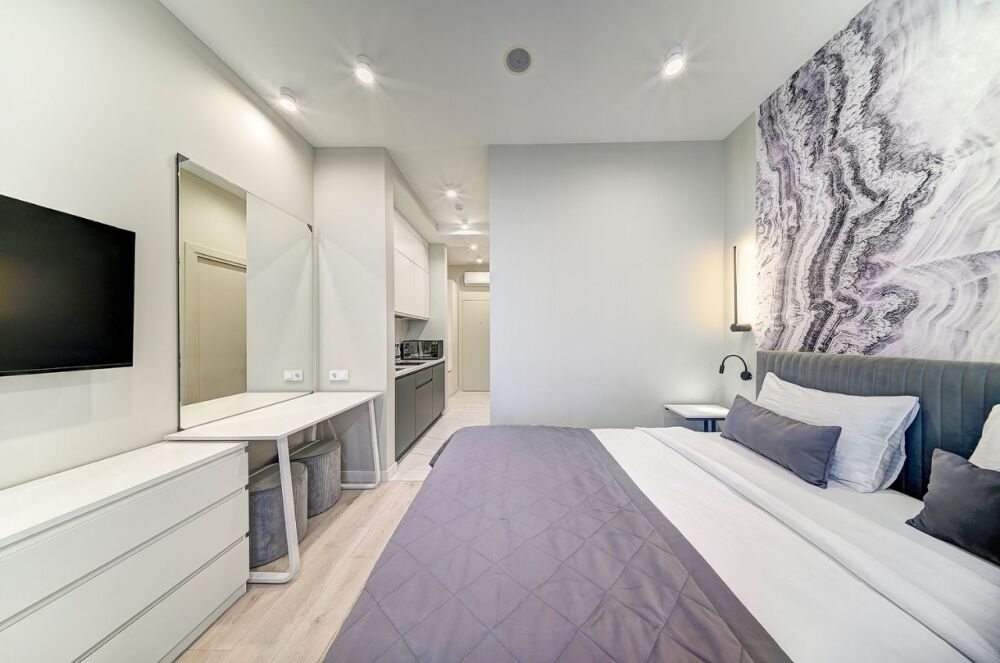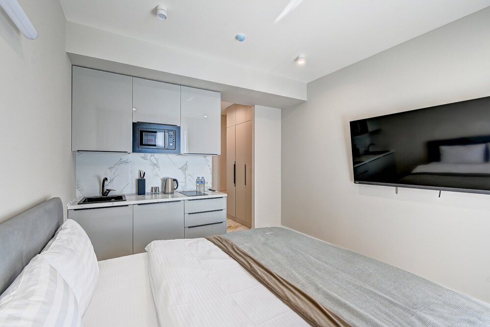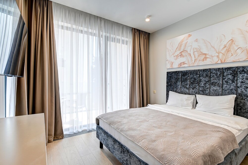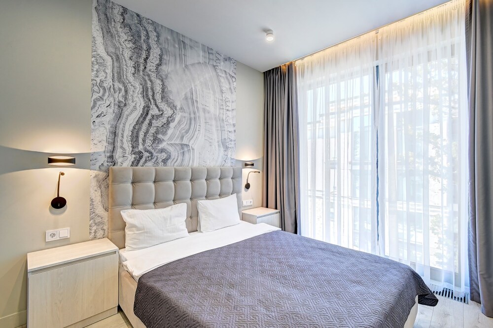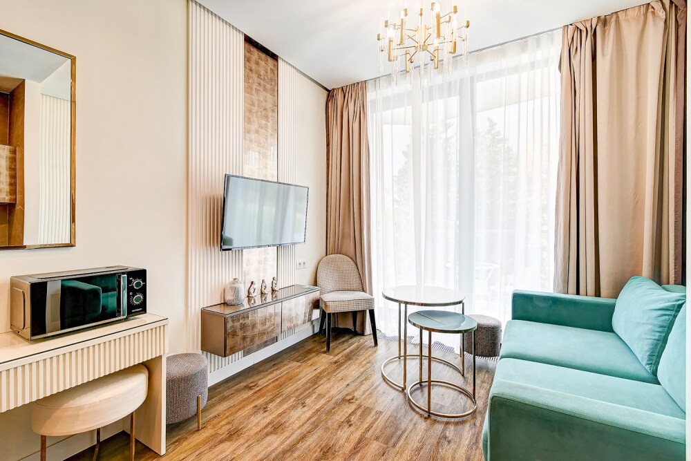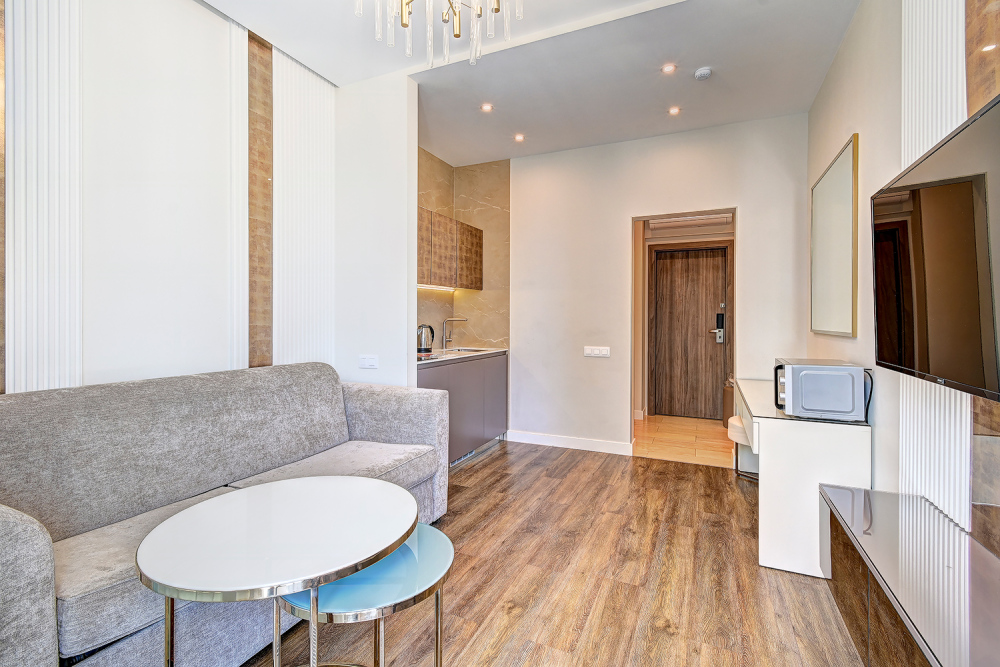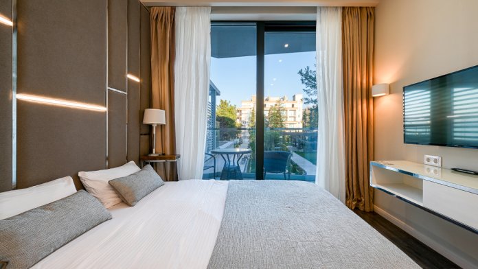 Широкий выбор апартаментов различного размера и конфигурации, чтобы соответствовать потребностям различных клиентов, будь то семьи, пары или деловые путешественники. От студий стандарт до номеров «Grand Luxe». Только высокое качество номеров с современным дизайном, удобствами и полным набором необходимых удобств для комфортного проживания. Полностью оборудованная мини-кухня, мягкая мебель из велюра, система кондиционирования и встроенного отопления, LCD-телевизор с цифровыми каналами и радио, фен, окна и двери с повышенной звукоизоляцией, высокоскоростной Wi-Fi, косметический набор.