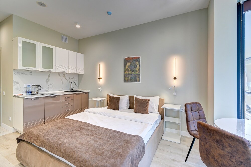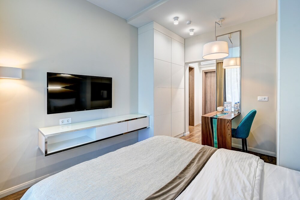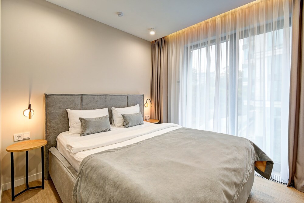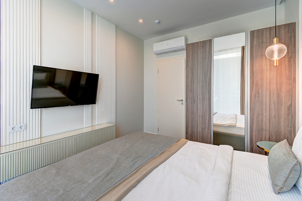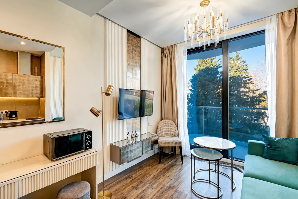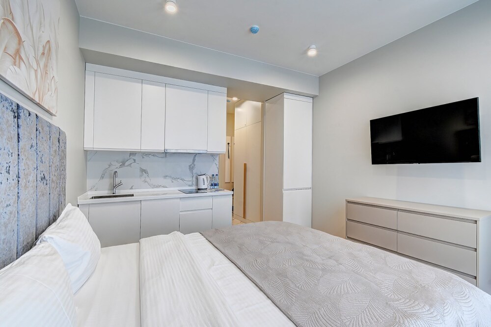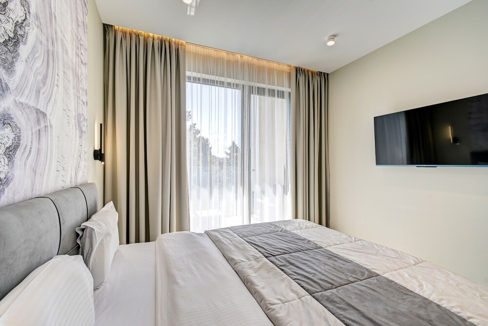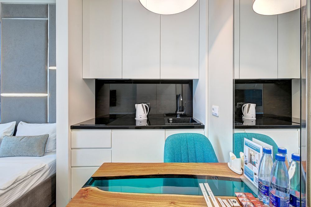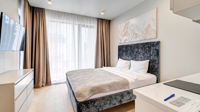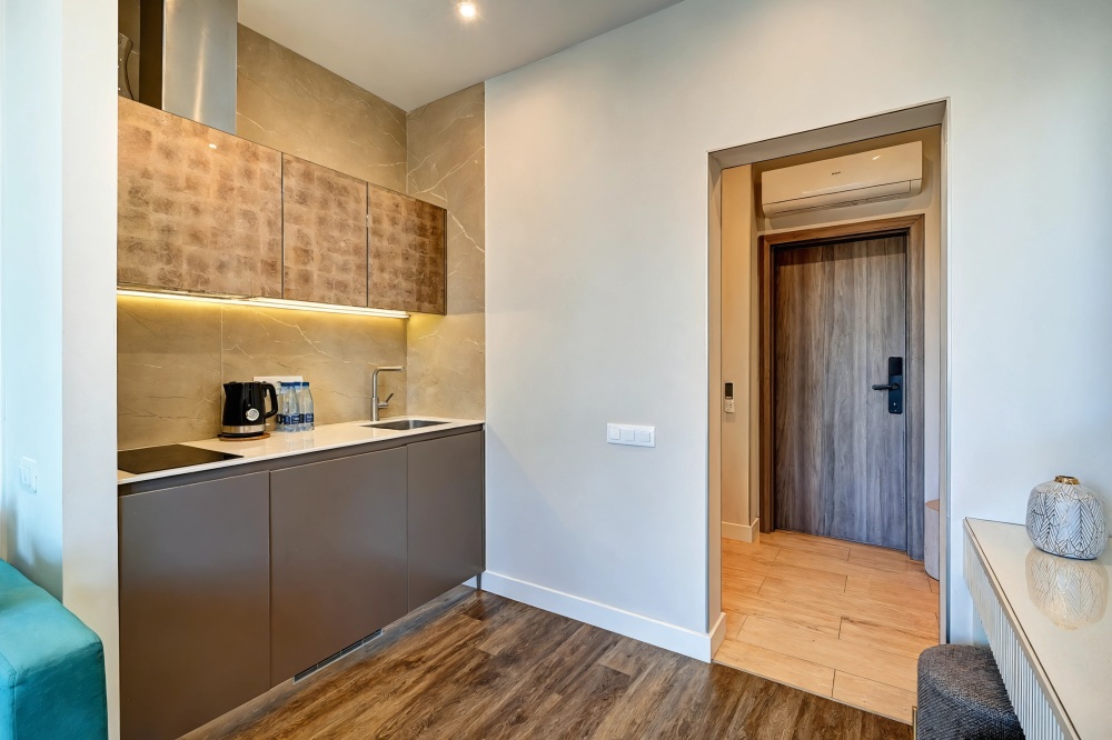 Широкий выбор апартаментов различного размера и конфигурации, чтобы соответствовать потребностям различных клиентов, будь то семьи, пары или деловые путешественники. От студий стандарт до номеров «Grand Luxe». Только высокое качество номеров с современным дизайном, удобствами и полным набором необходимых удобств для комфортного проживания. Полностью оборудованная мини-кухня, мягкая мебель из велюра, система кондиционирования и встроенного отопления, LCD-телевизор с цифровыми каналами и радио, фен, окна и двери с повышенной звукоизоляцией, высокоскоростной Wi-Fi, косметический набор.