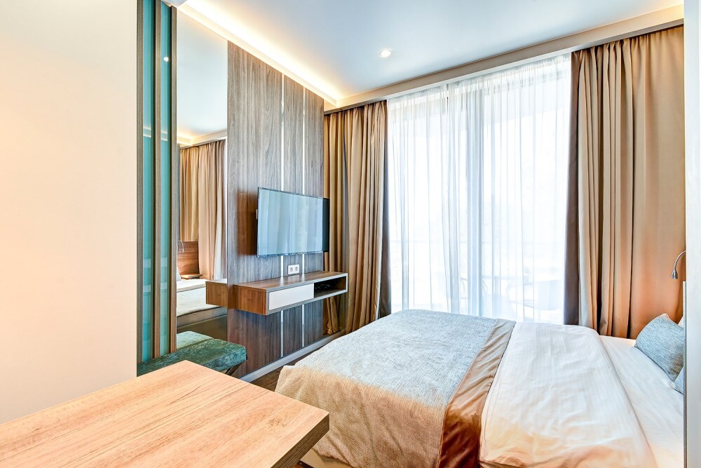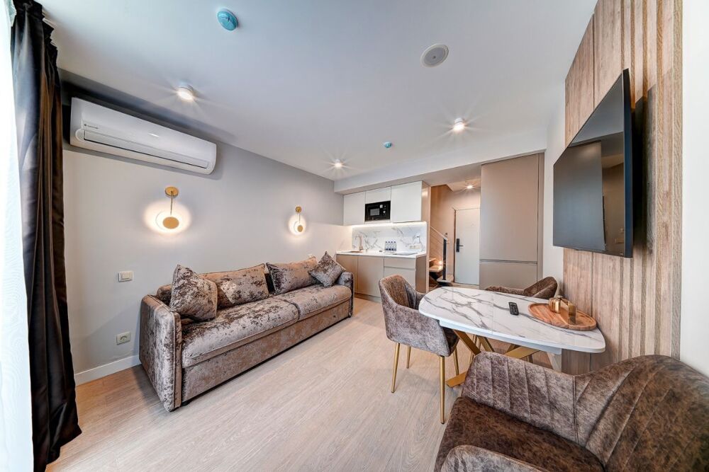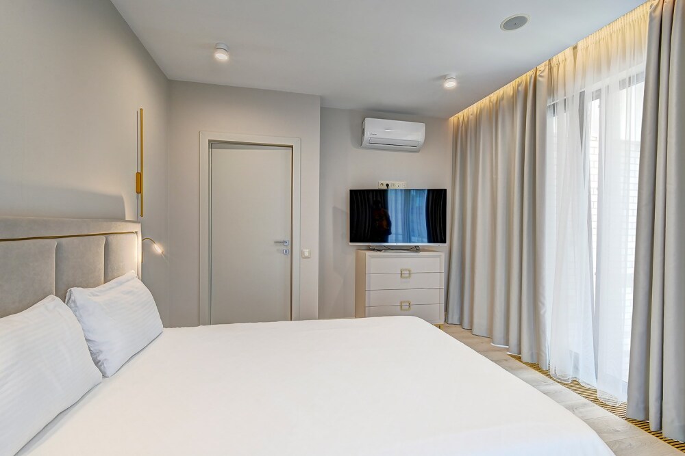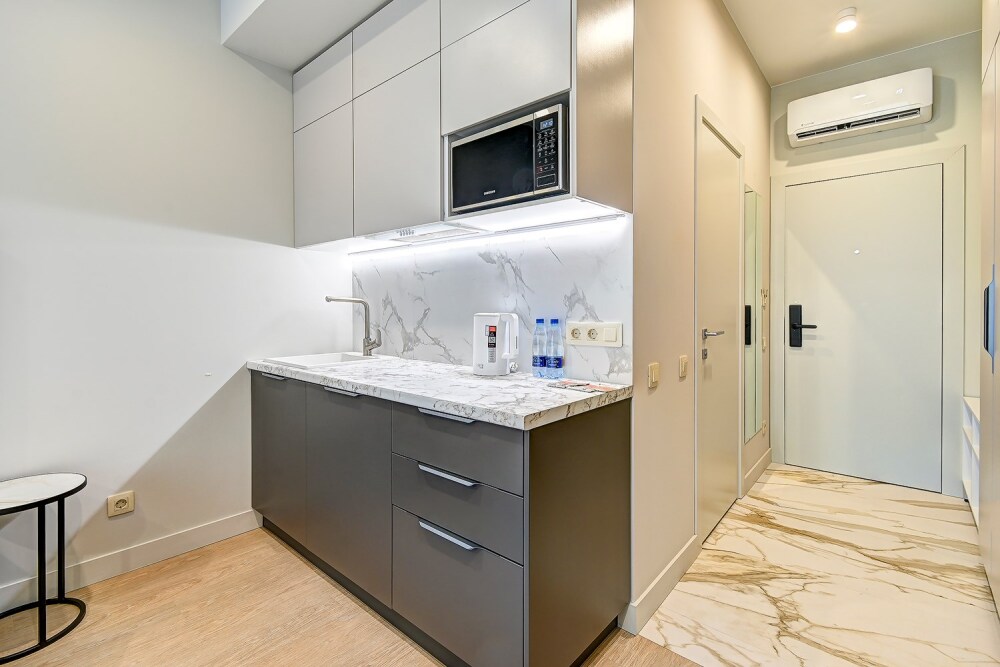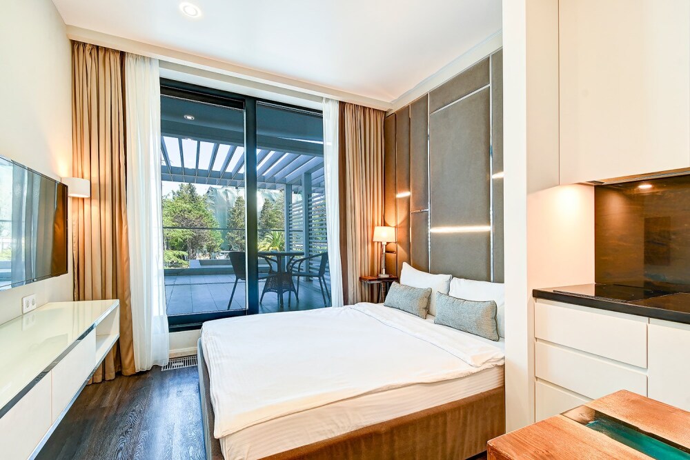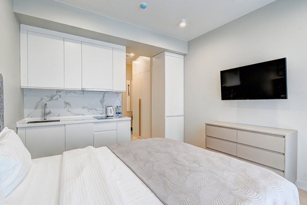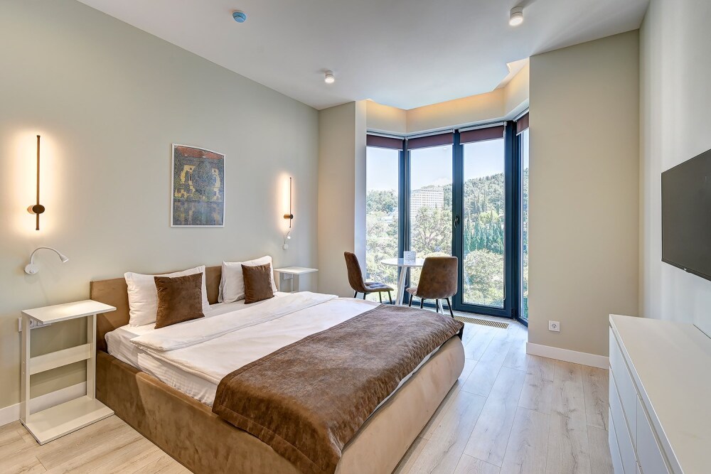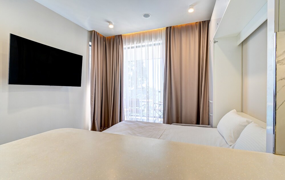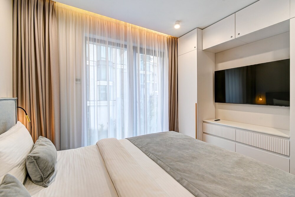 Широкий выбор апартаментов различного размера и конфигурации, чтобы соответствовать потребностям различных клиентов, будь то семьи, пары или деловые путешественники. От студий стандарт до номеров «Grand Luxe». Только высокое качество номеров с современным дизайном, удобствами и полным набором необходимых удобств для комфортного проживания. Полностью оборудованная мини-кухня, мягкая мебель из велюра, система кондиционирования и встроенного отопления, LCD-телевизор с цифровыми каналами и радио, фен, окна и двери с повышенной звукоизоляцией, высокоскоростной Wi-Fi, косметический набор.