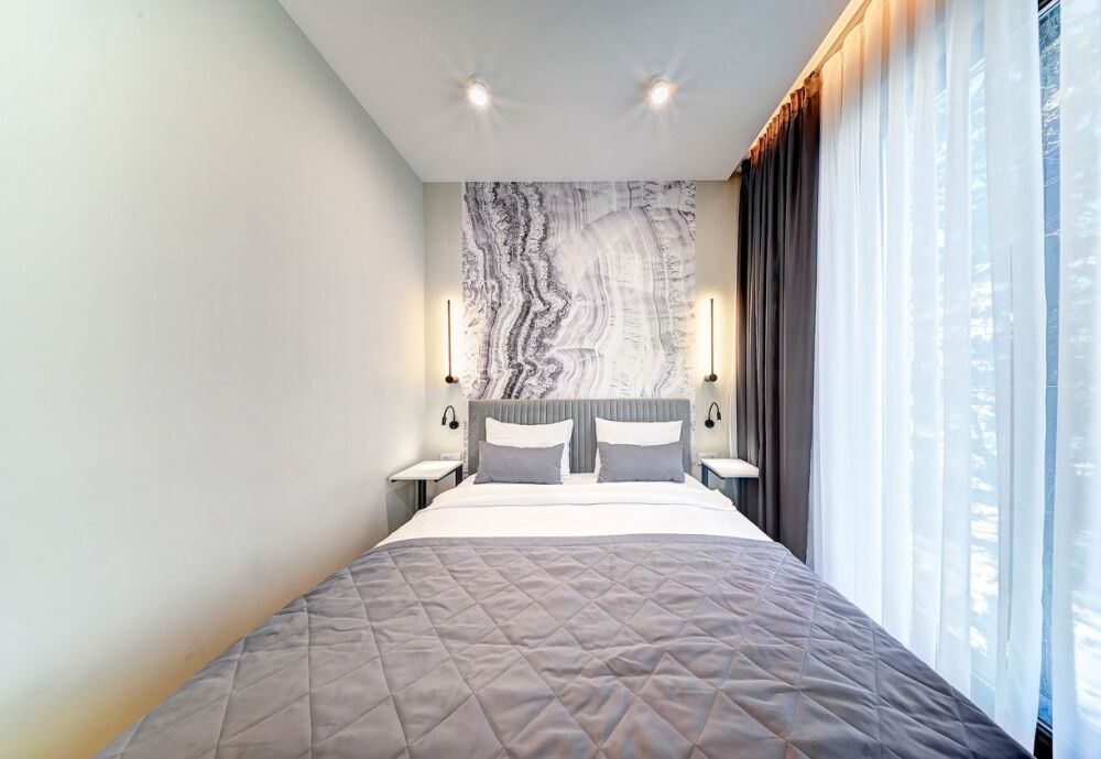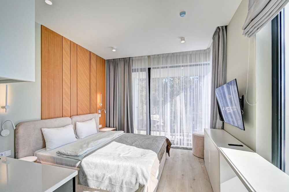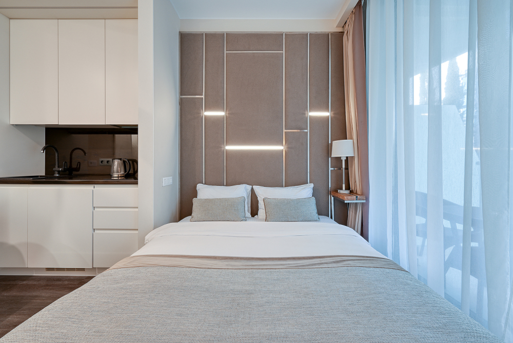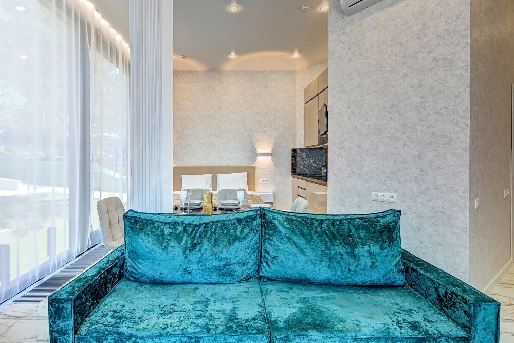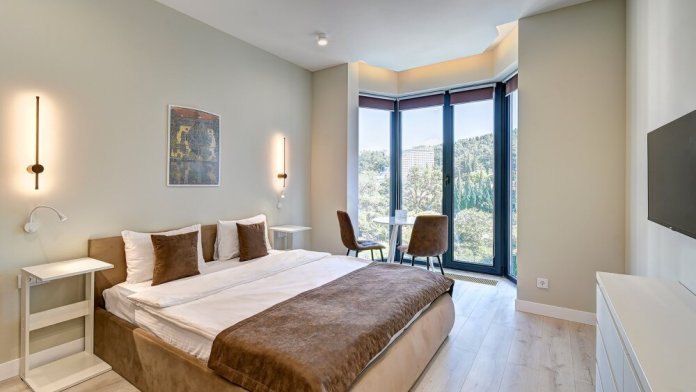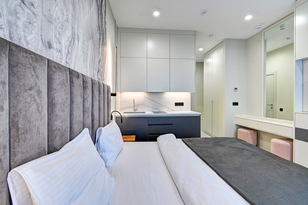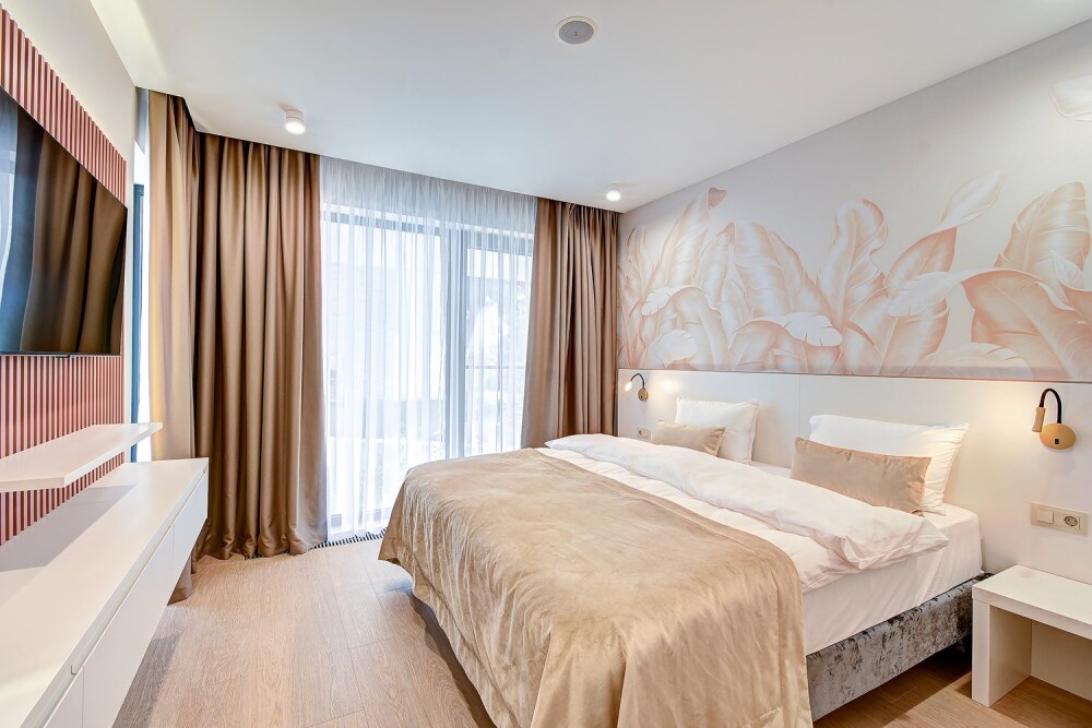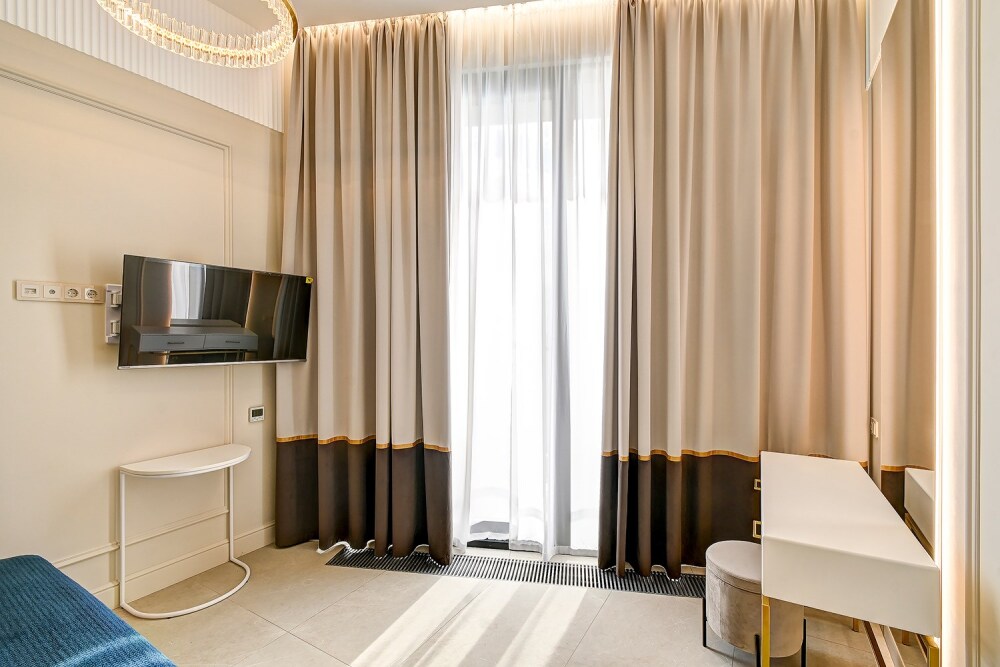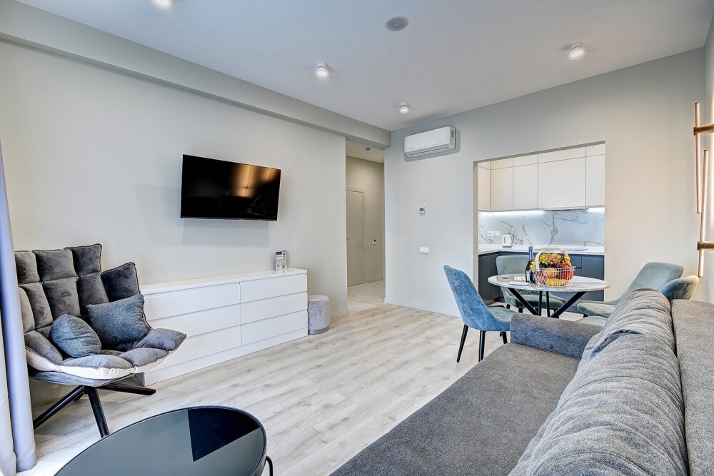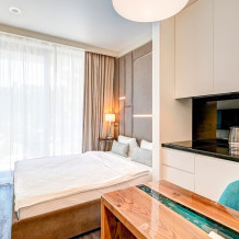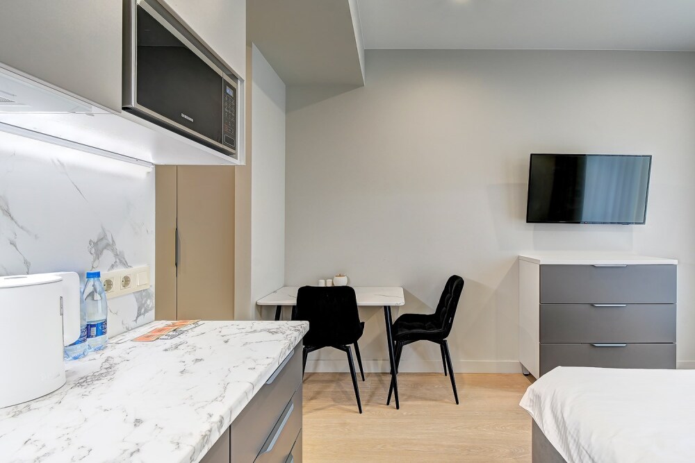 Широкий выбор апартаментов различного размера и конфигурации, чтобы соответствовать потребностям различных клиентов, будь то семьи, пары или деловые путешественники. От студий стандарт до номеров «Grand Luxe». Только высокое качество номеров с современным дизайном, удобствами и полным набором необходимых удобств для комфортного проживания. Полностью оборудованная мини-кухня, мягкая мебель из велюра, система кондиционирования и встроенного отопления, LCD-телевизор с цифровыми каналами и радио, фен, окна и двери с повышенной звукоизоляцией, высокоскоростной Wi-Fi, косметический набор.