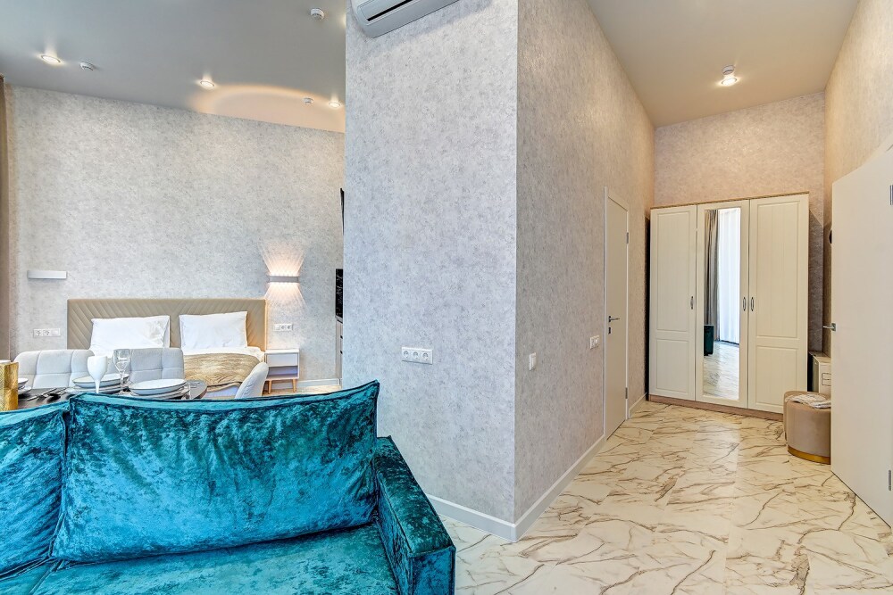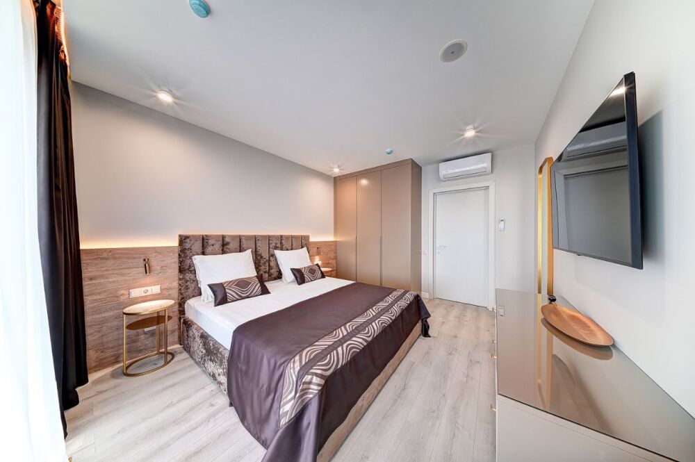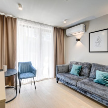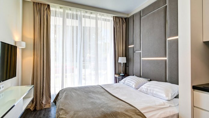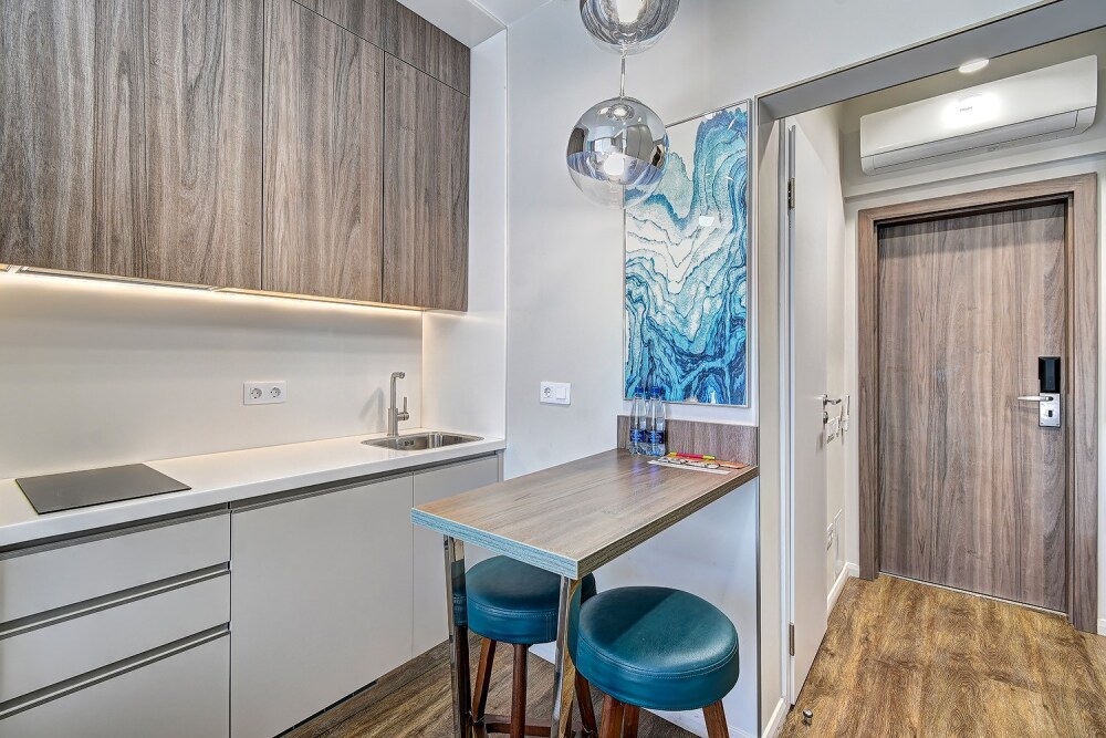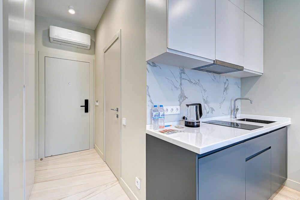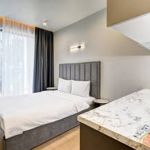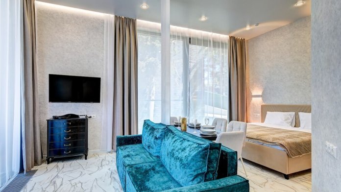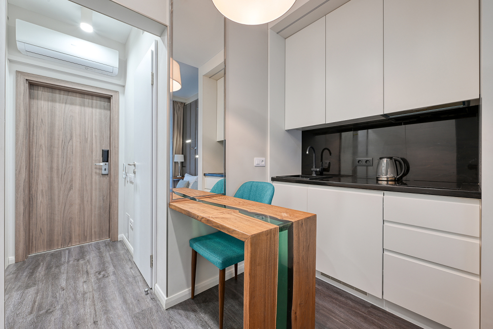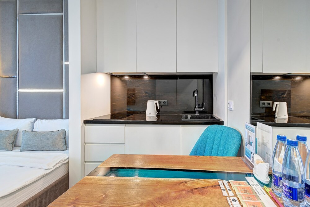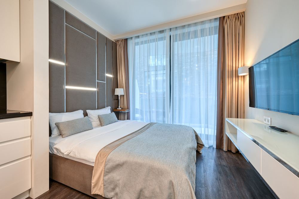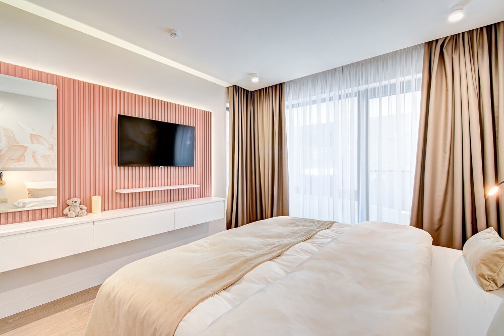 Широкий выбор апартаментов различного размера и конфигурации, чтобы соответствовать потребностям различных клиентов, будь то семьи, пары или деловые путешественники. От студий стандарт до номеров «Grand Luxe». Только высокое качество номеров с современным дизайном, удобствами и полным набором необходимых удобств для комфортного проживания. Полностью оборудованная мини-кухня, мягкая мебель из велюра, система кондиционирования и встроенного отопления, LCD-телевизор с цифровыми каналами и радио, фен, окна и двери с повышенной звукоизоляцией, высокоскоростной Wi-Fi, косметический набор.