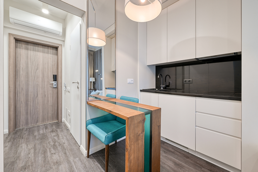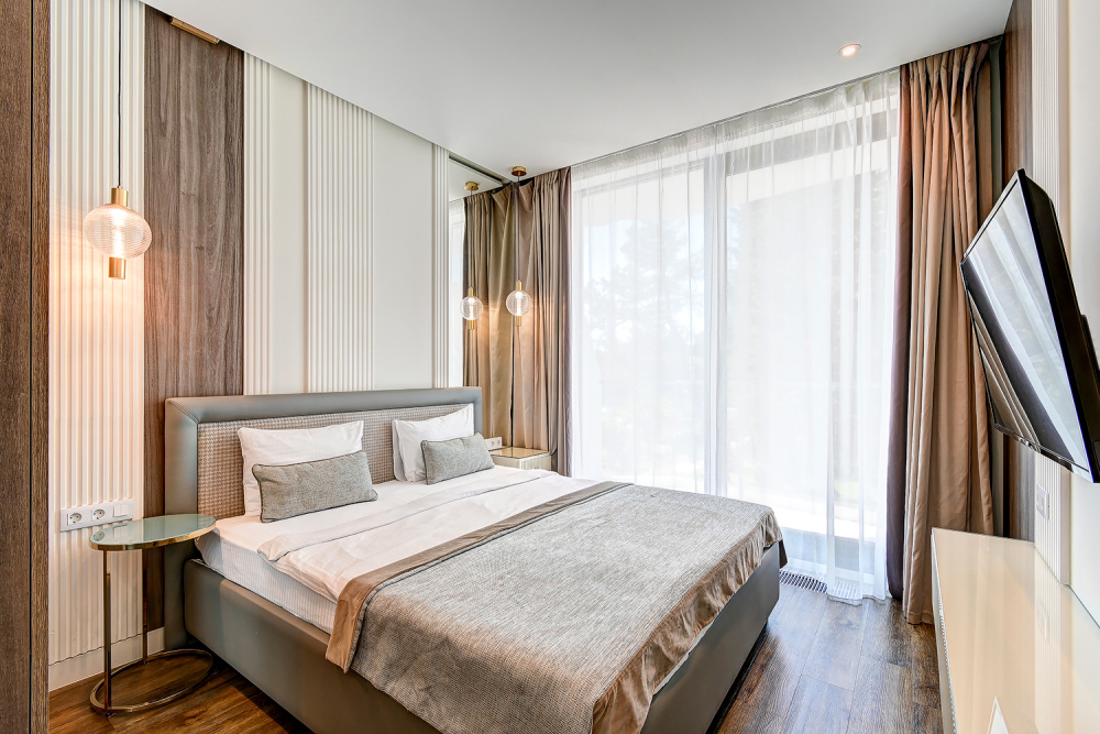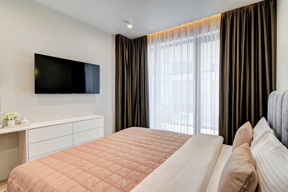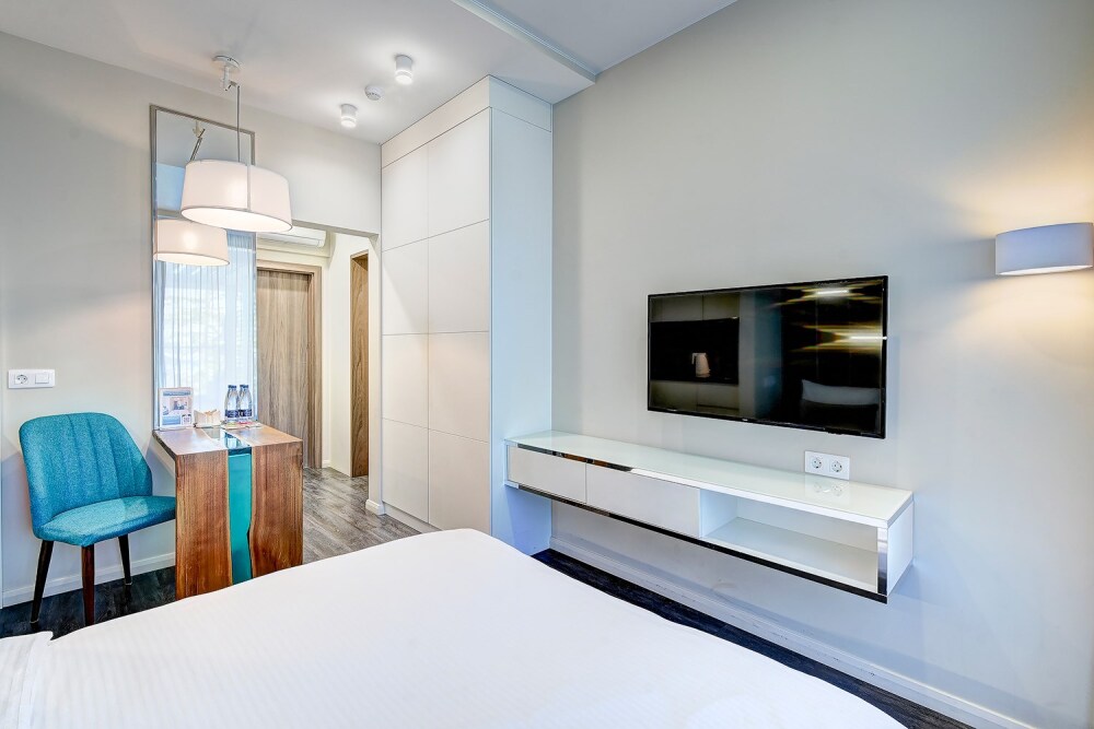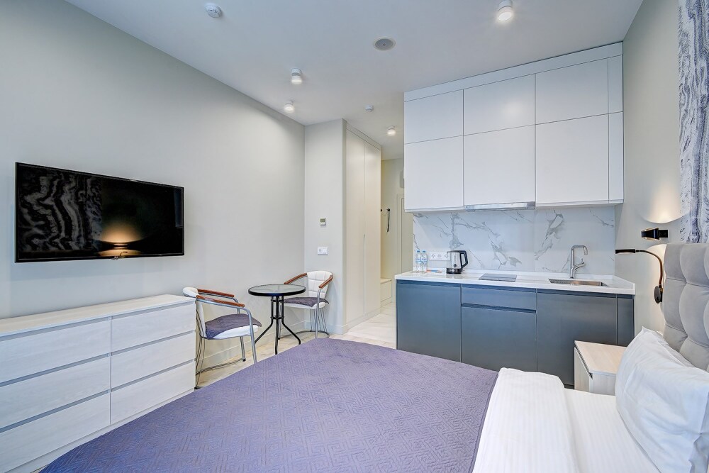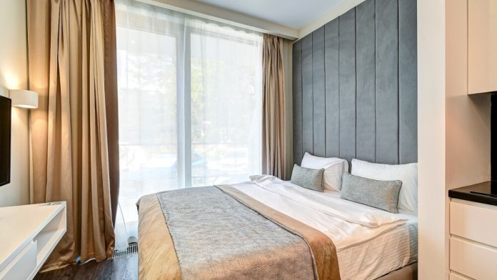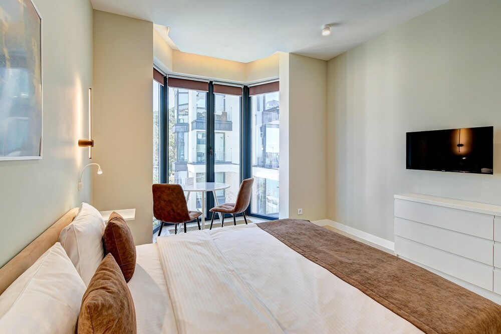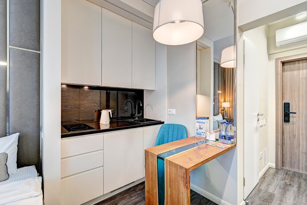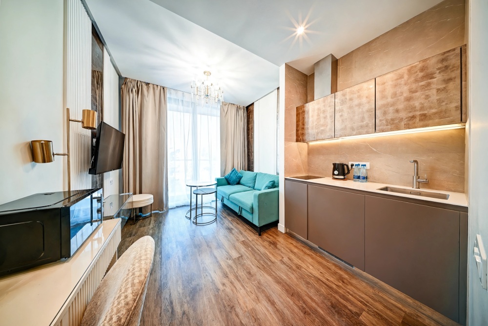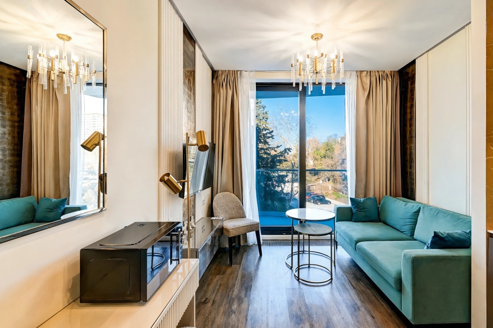 Широкий выбор апартаментов различного размера и конфигурации, чтобы соответствовать потребностям различных клиентов, будь то семьи, пары или деловые путешественники. От студий стандарт до номеров «Grand Luxe». Только высокое качество номеров с современным дизайном, удобствами и полным набором необходимых удобств для комфортного проживания. Полностью оборудованная мини-кухня, мягкая мебель из велюра, система кондиционирования и встроенного отопления, LCD-телевизор с цифровыми каналами и радио, фен, окна и двери с повышенной звукоизоляцией, высокоскоростной Wi-Fi, косметический набор.