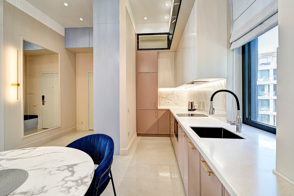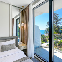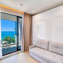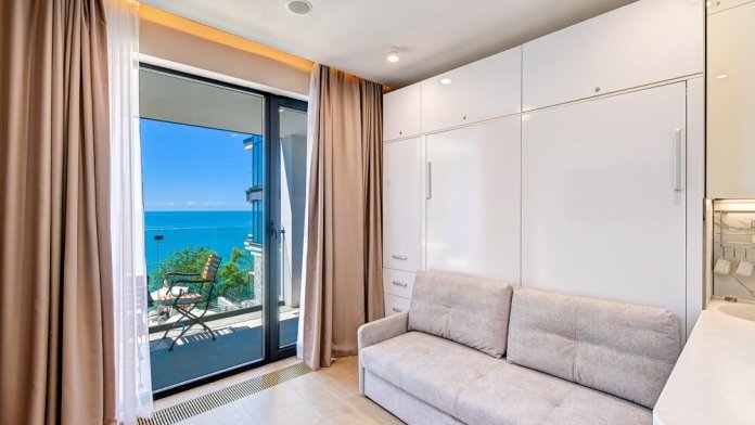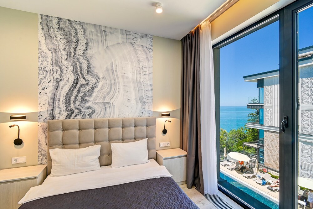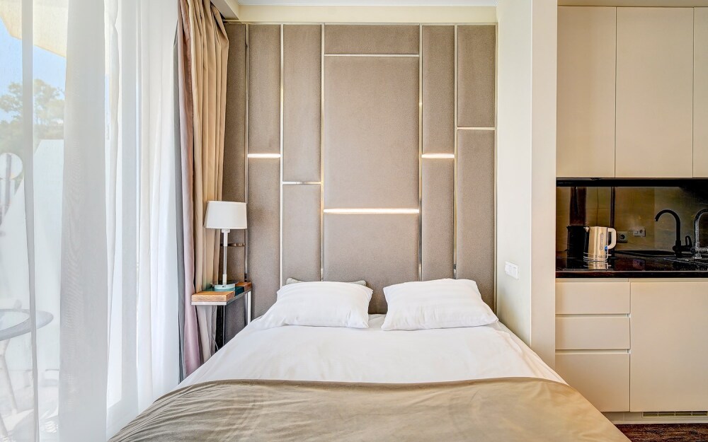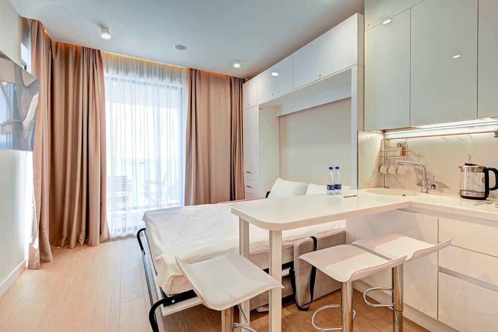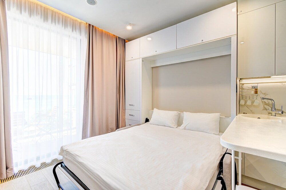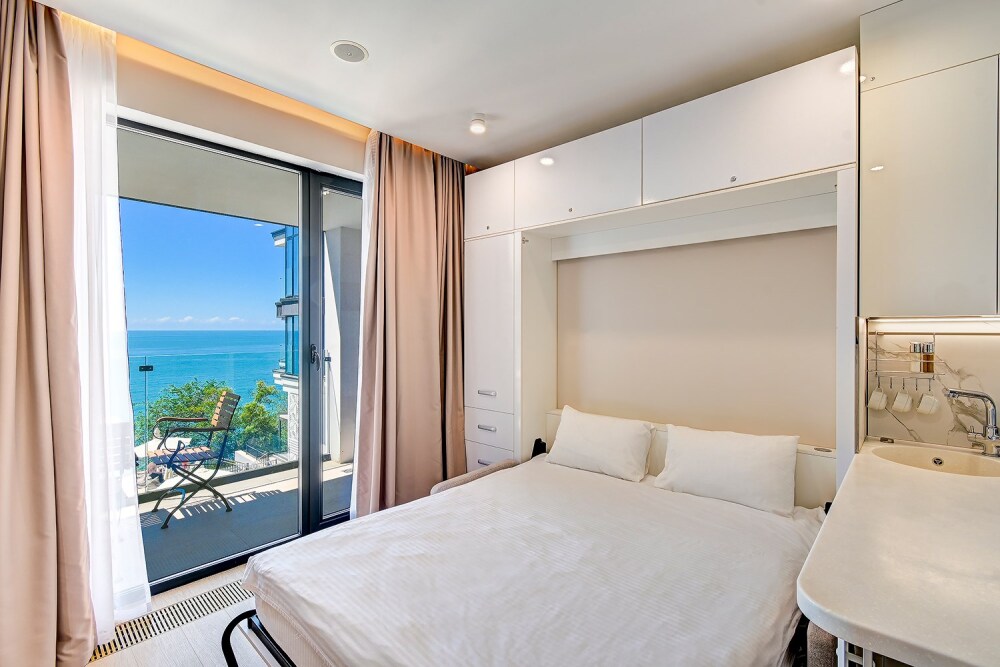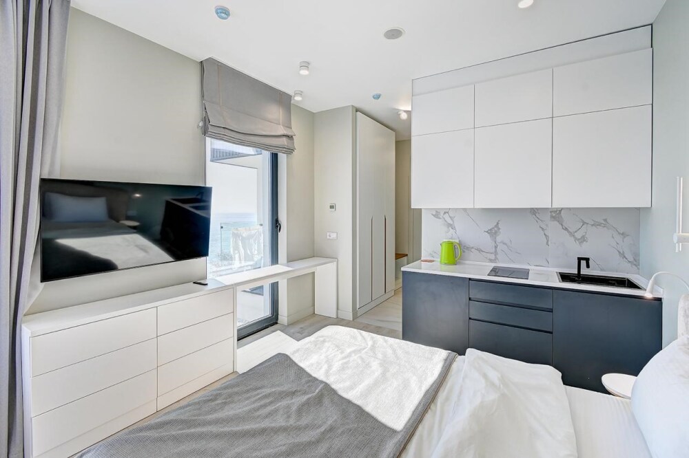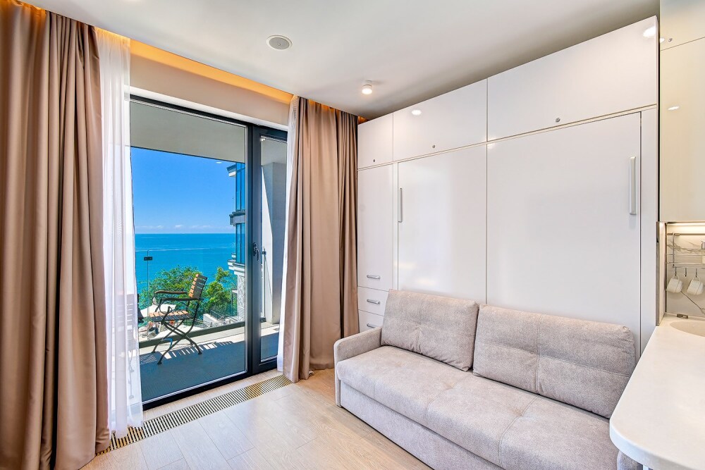 Студия с современным и эргономичным дизайном, прямым видом на море и бассейн.