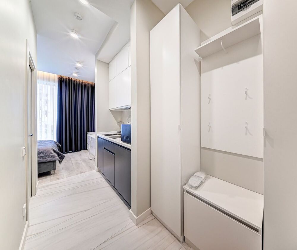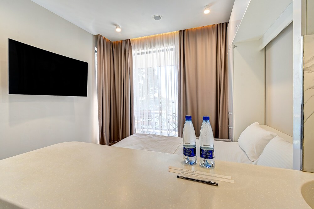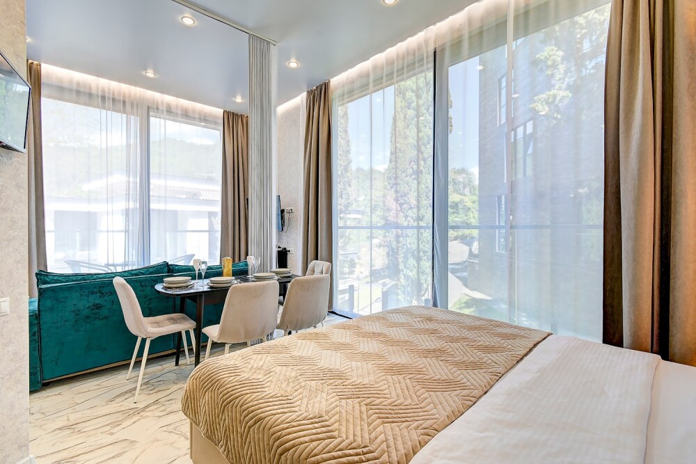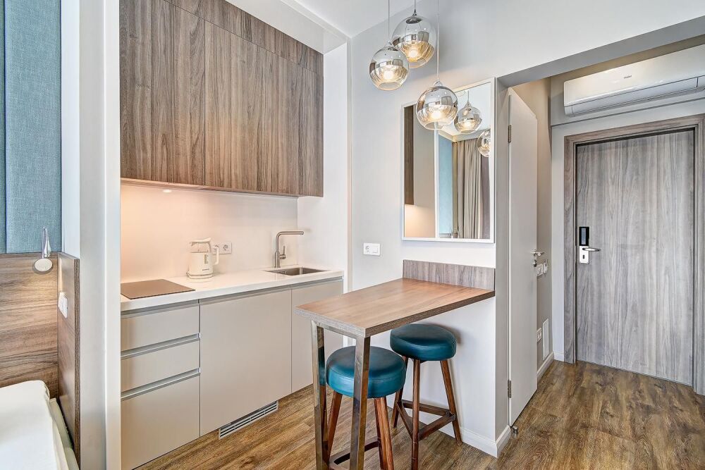 Номер категории Студия располагаются во 2 корпусе отеля. Номер оснащен мини-кухней, бытовой техникой, комплектом посуды, чайным набором. К услугам гостей халаты, тапочки, пляжные полотенца, набор гигиенических принадлежностей, а также утюг и гладильная доска.