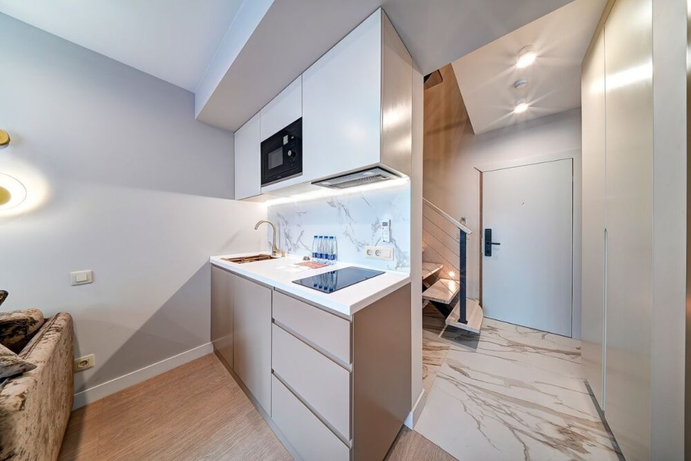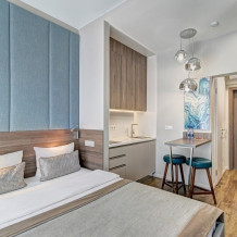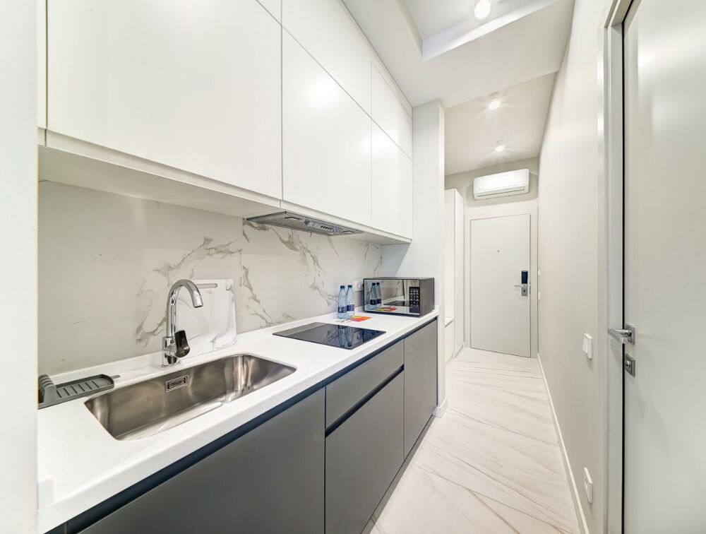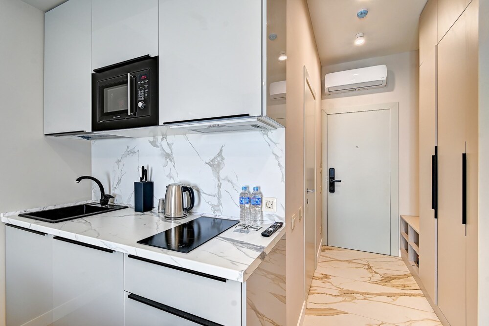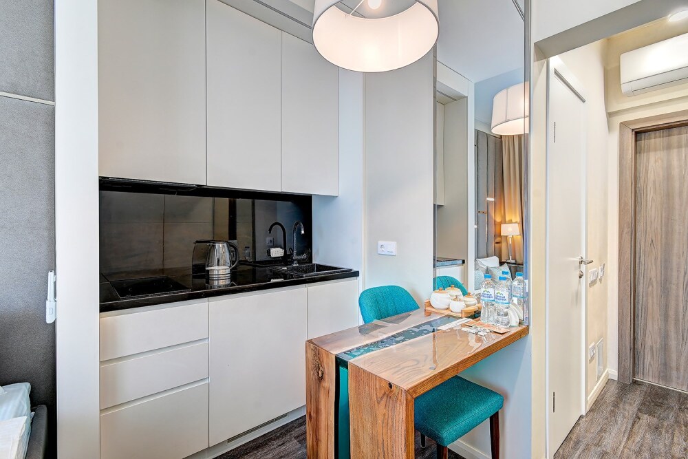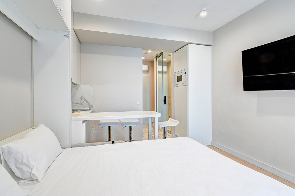 Номер категории Студия располагаются во 2 корпусе отеля. Номер оснащен мини-кухней, бытовой техникой, комплектом посуды, чайным набором. К услугам гостей халаты, тапочки, пляжные полотенца, набор гигиенических принадлежностей, а также утюг и гладильная доска.