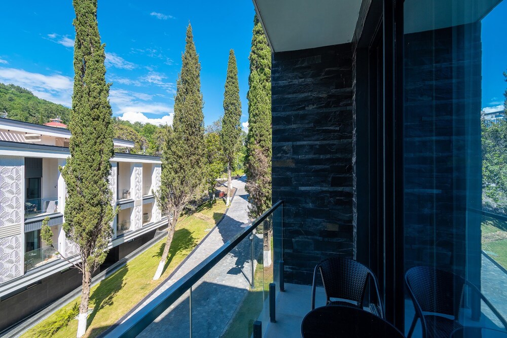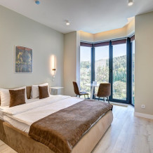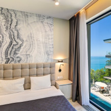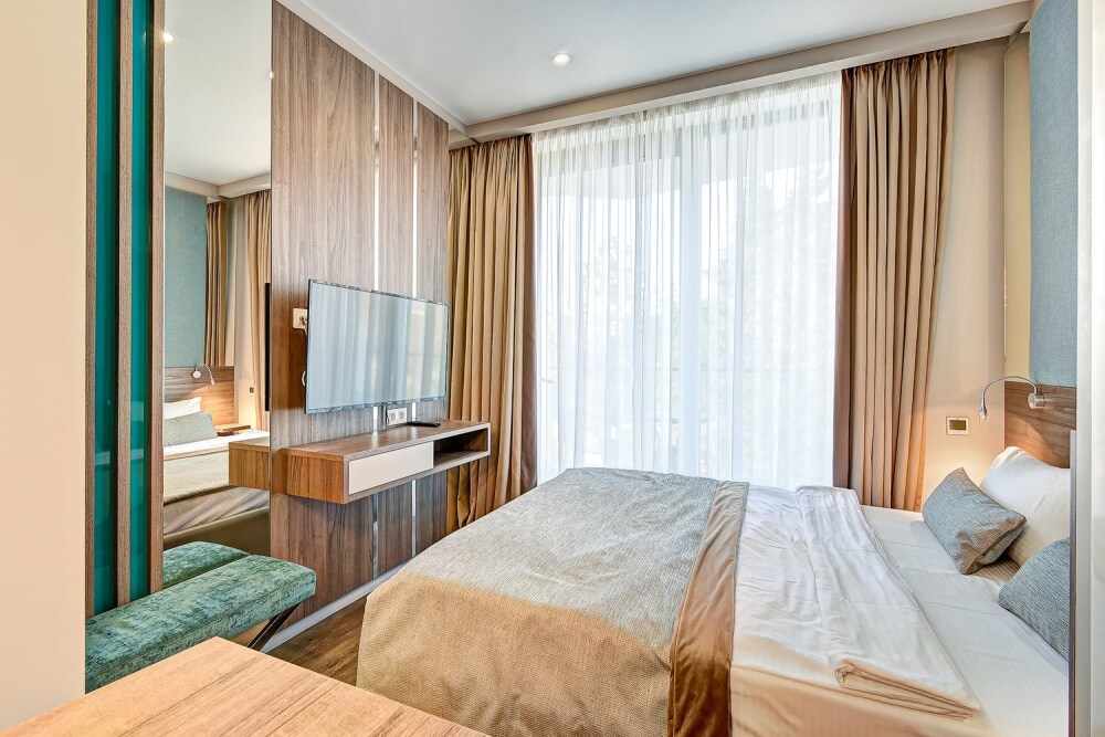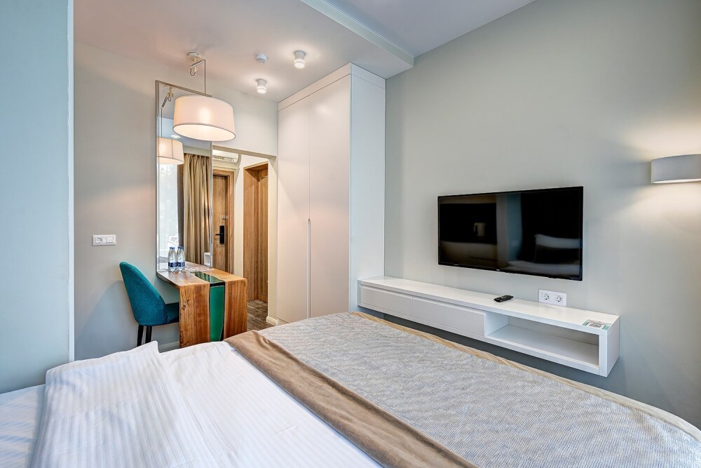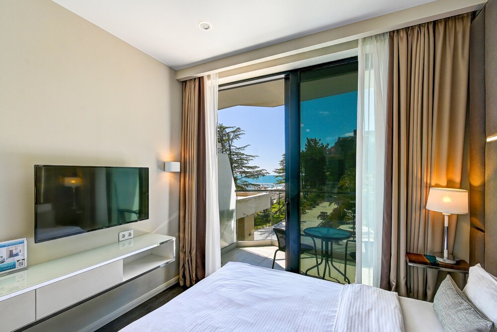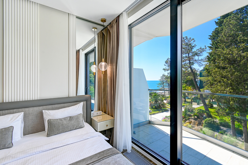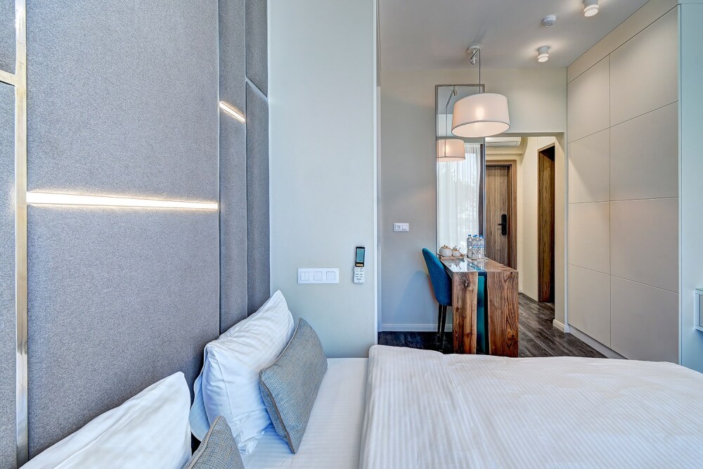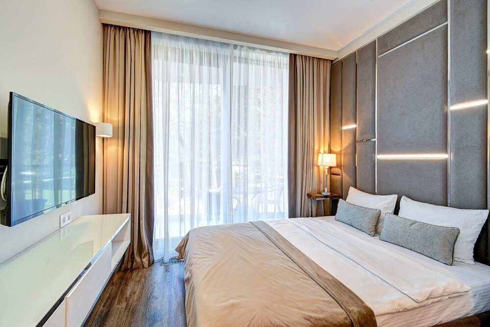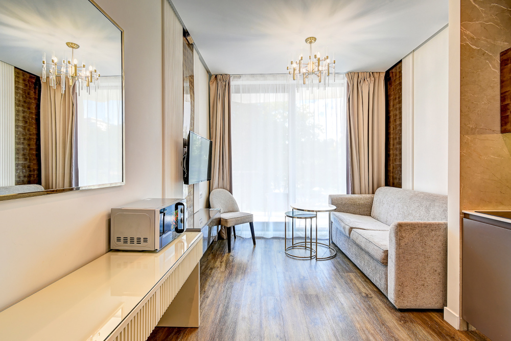 Номер категории Делюкс располагается в главном (1) корпусе отеля. Номер оснащен мини-кухней, бытовой техникой, комплектом посуды, чайным набором. К услугам гостей халаты, тапочки, пляжные полотенца, набор гигиенических принадлежностей, а также утюг и гладильная доска. В номерах отелях, как и на всей территории, доступен высокоскоростной Wi-Fi.