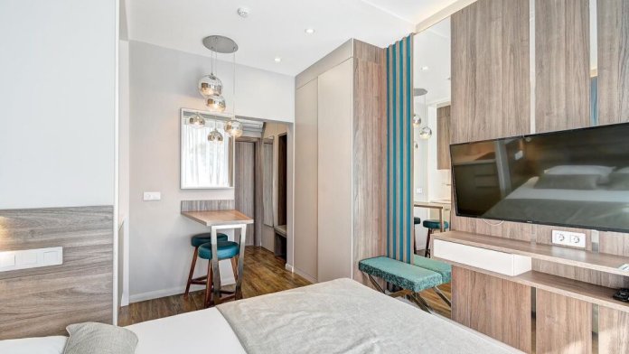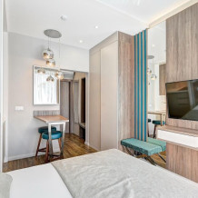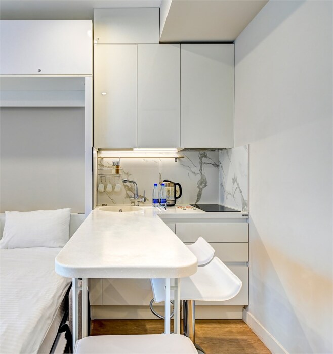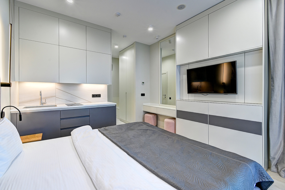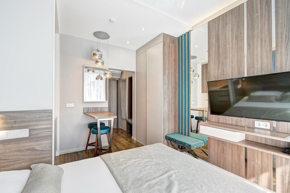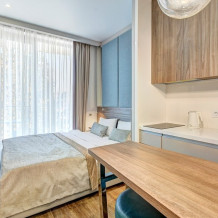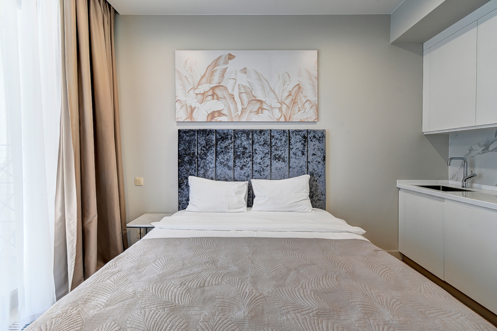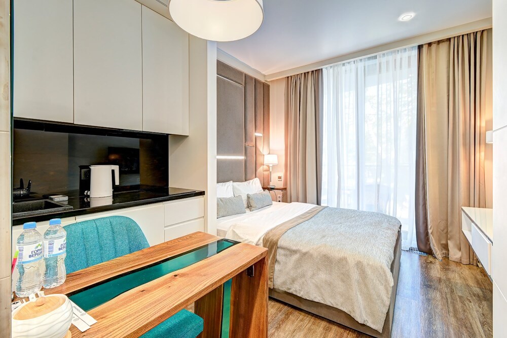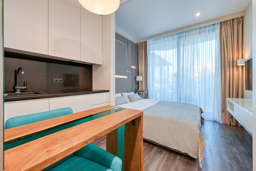 Номер категории Студия располагаются в 4 корпусе отеля. Номер оснащен мини-кухней, бытовой техникой, комплектом посуды, чайным набором. К услугам гостей халаты, тапочки, пляжные полотенца, набор гигиенических принадлежностей, а также утюг и гладильная доска.