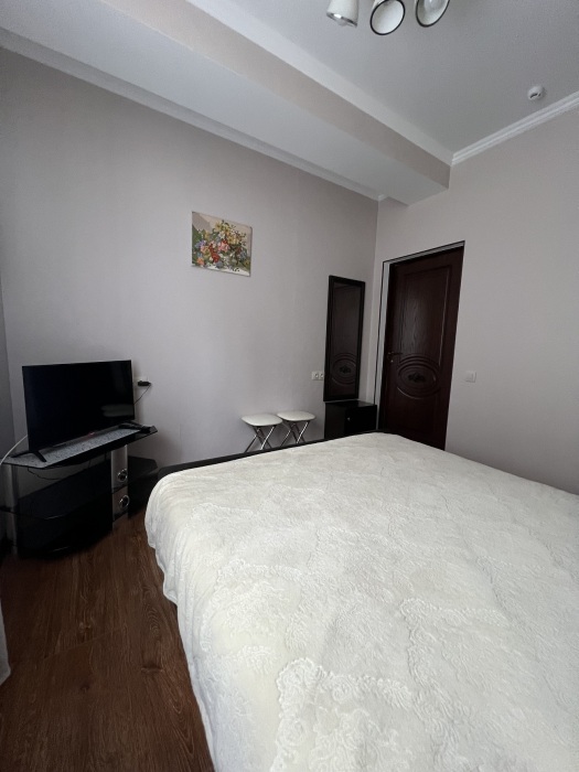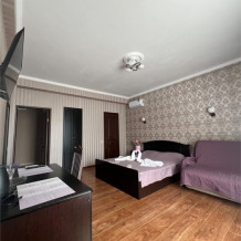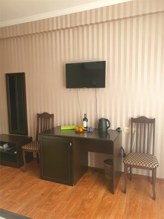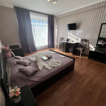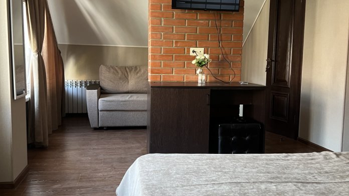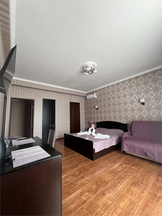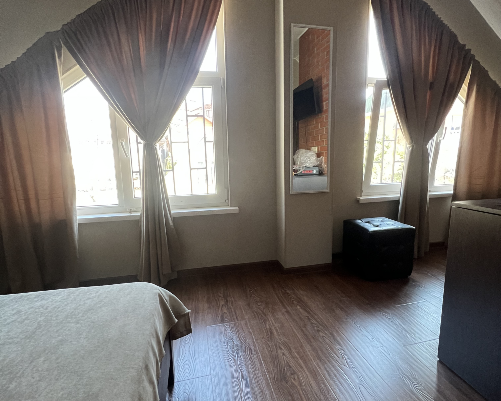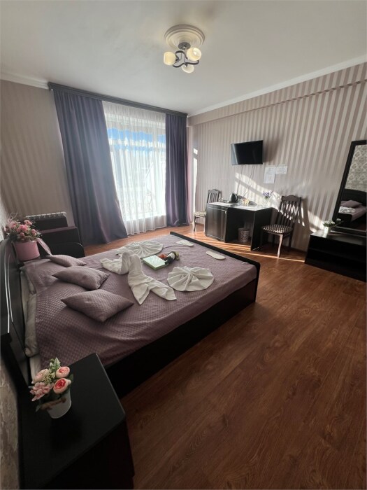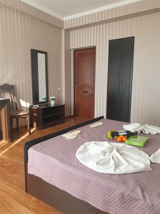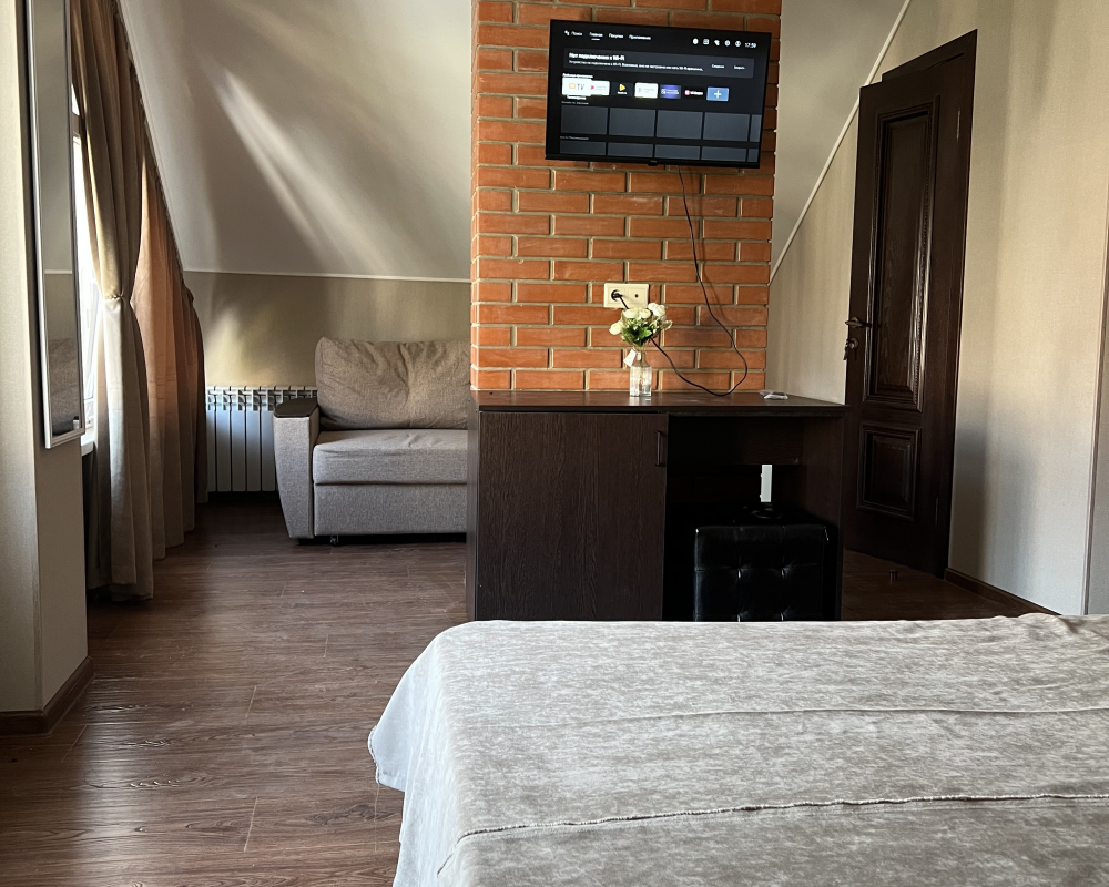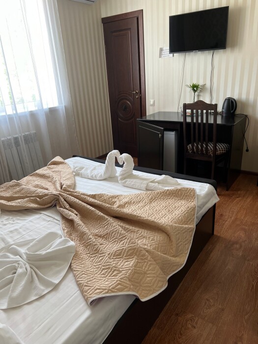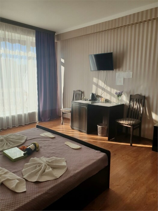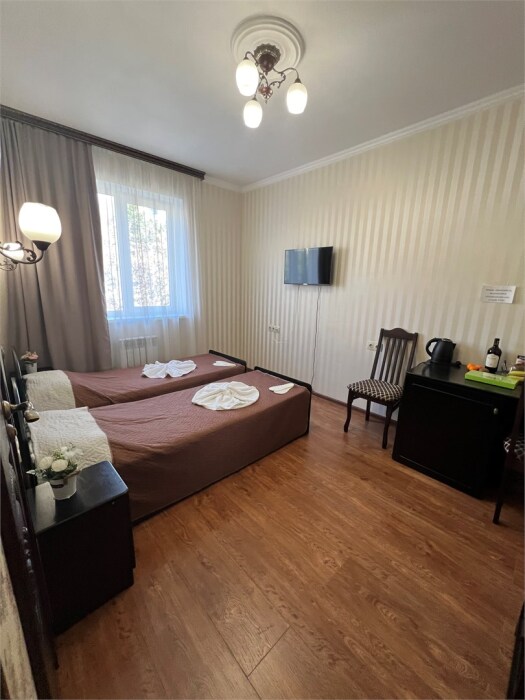 Трехместный новый номер на 4 этаже гостевого дома.Номер укомплектован мебелью: кровать двуспальная, кресло-кровать, письменный стол, плазменный телевизор, тумбочка.В номере есть холодильник, чайник, кружки, гигиенические средства, халаты, полотенце.