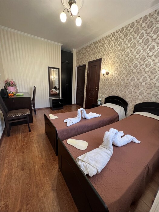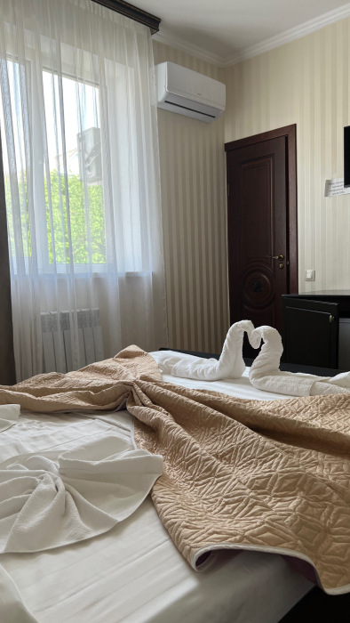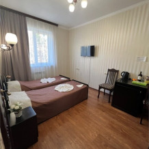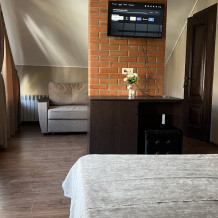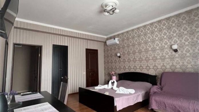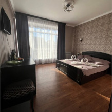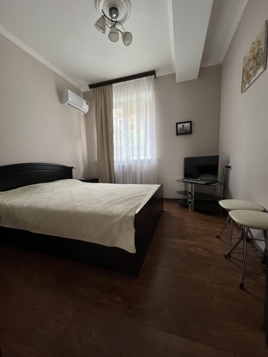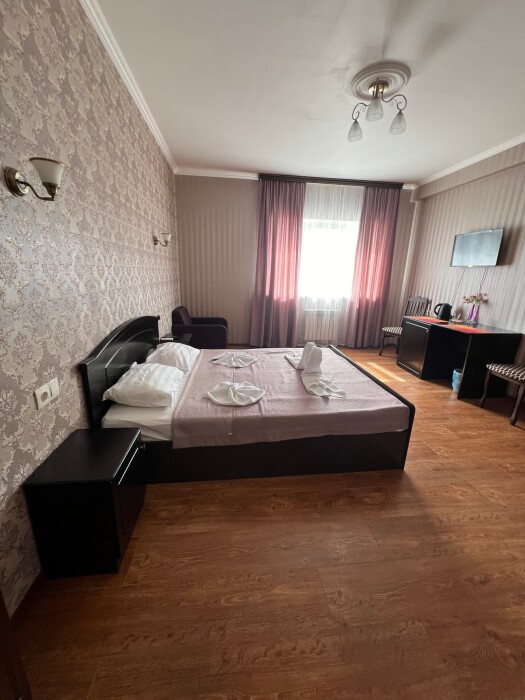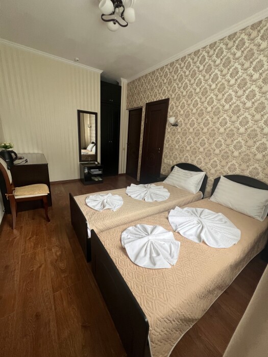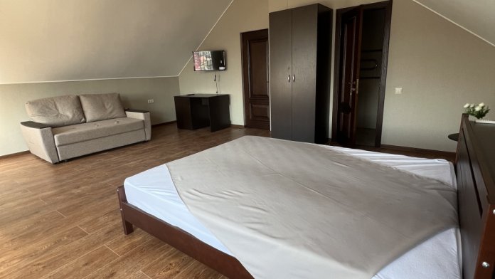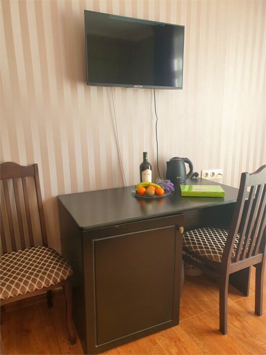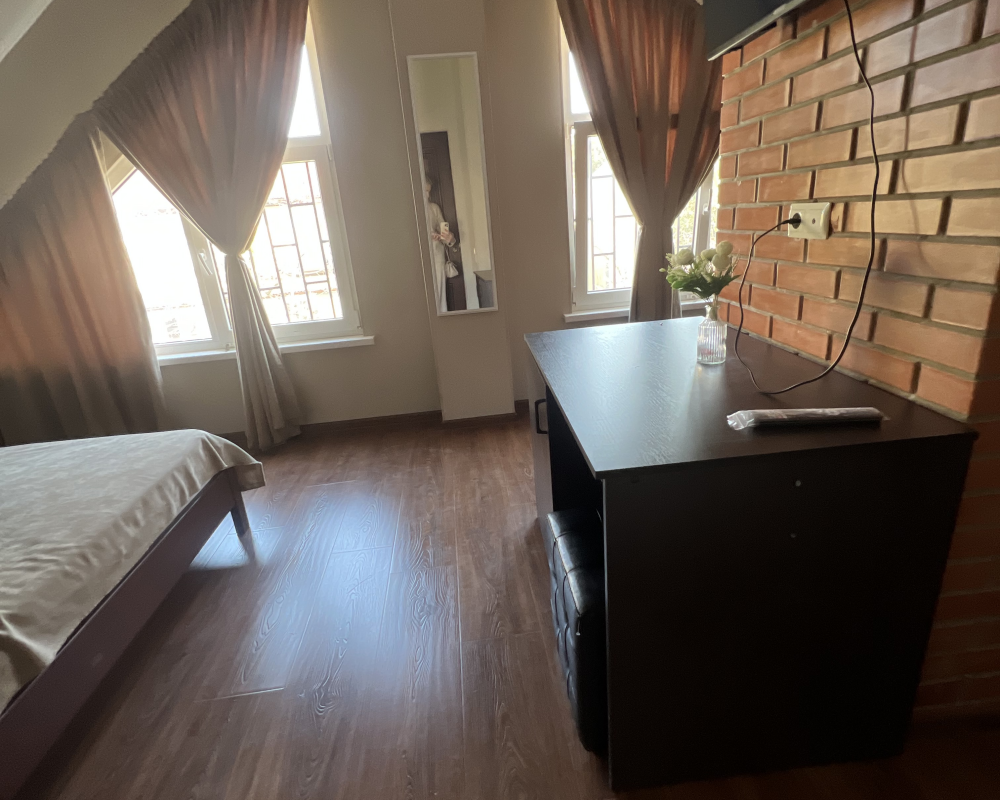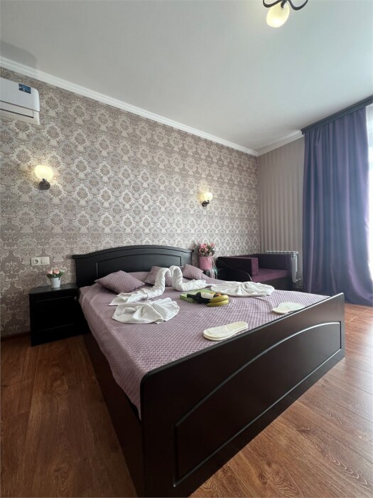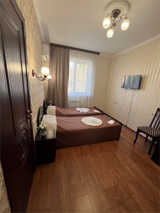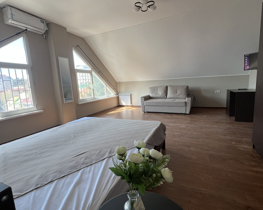 Трехместный новый номер на 4 этаже гостевого дома.Номер укомплектован мебелью: кровать двуспальная, кресло-кровать, письменный стол, плазменный телевизор, тумбочка.В номере есть холодильник, чайник, кружки, гигиенические средства, халаты, полотенце.