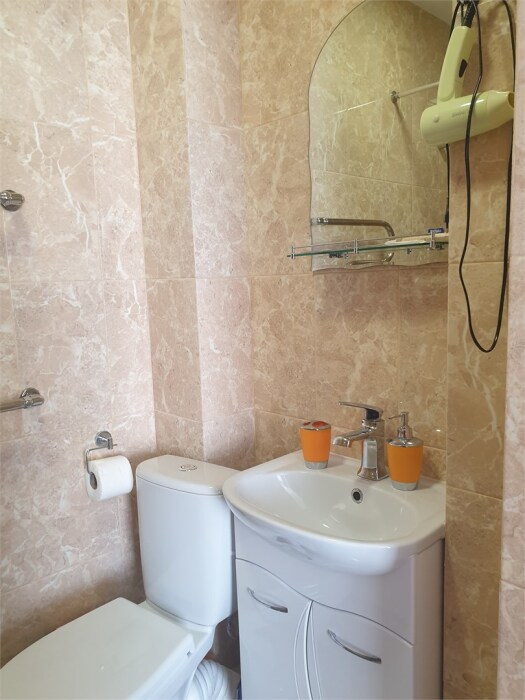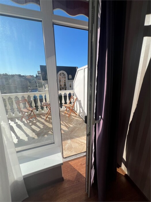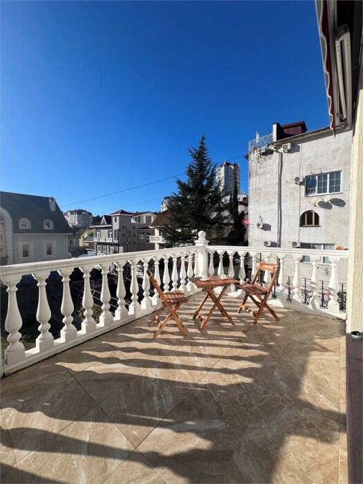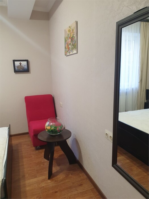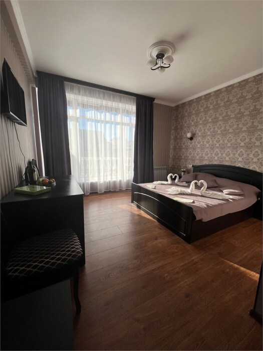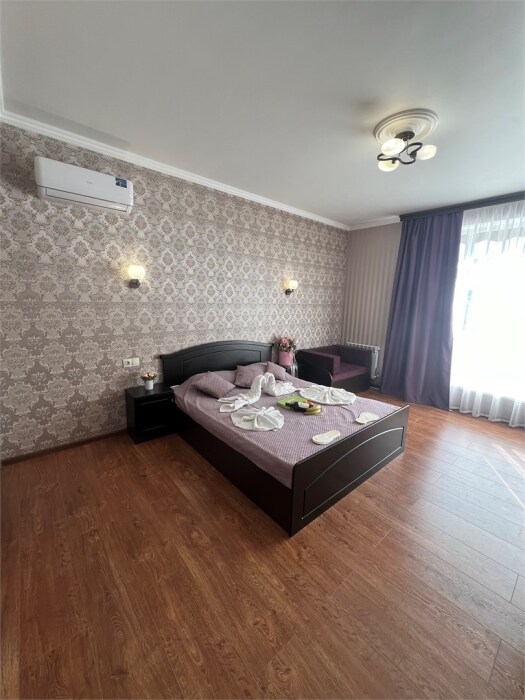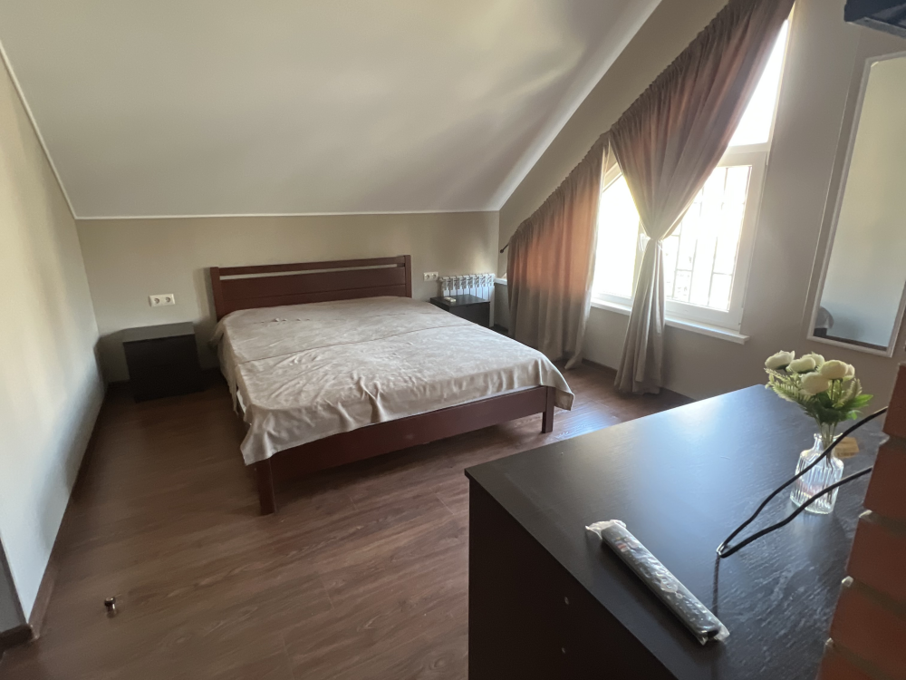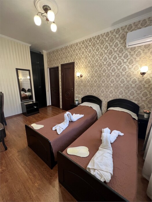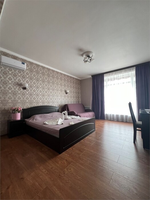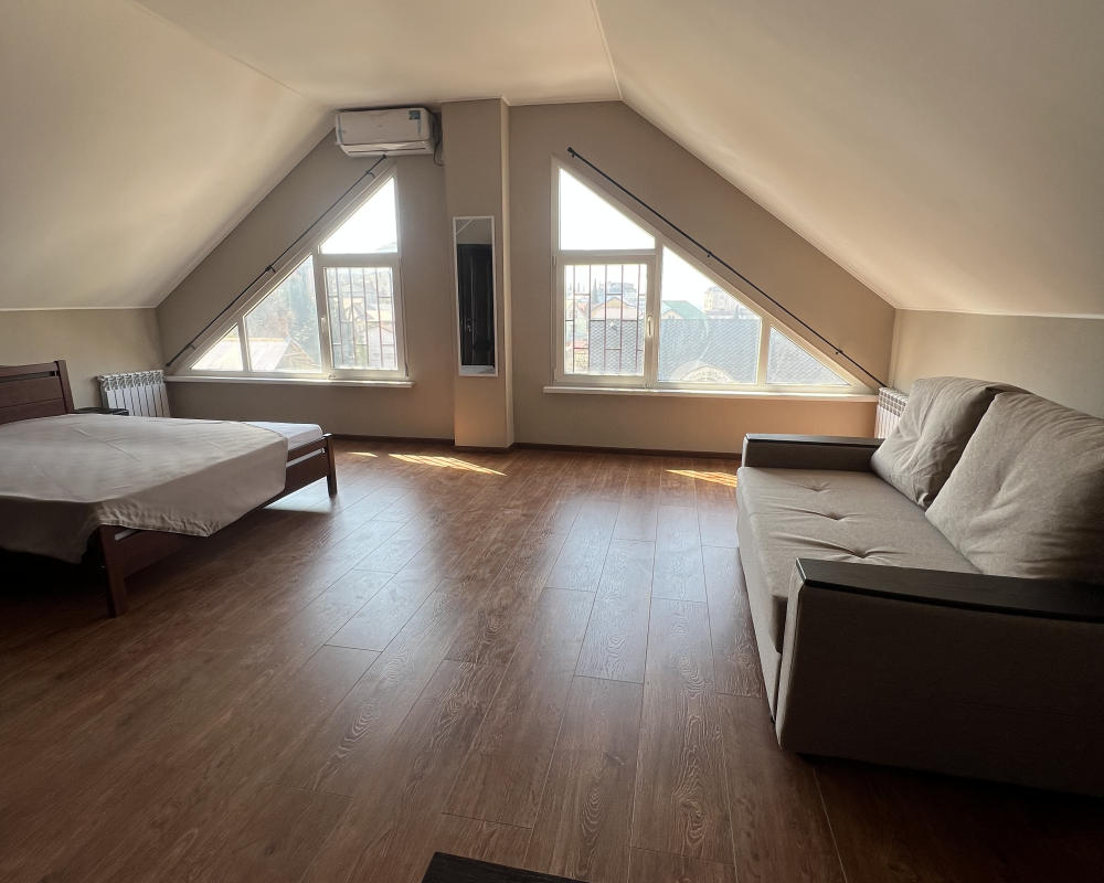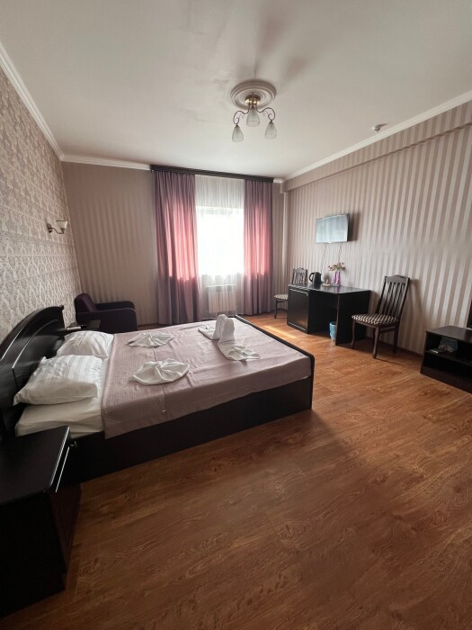 Трехместный новый номер на 4 этаже гостевого дома.Номер укомплектован мебелью: кровать двуспальная, кресло-кровать, письменный стол, плазменный телевизор, тумбочка.В номере есть холодильник, чайник, кружки, гигиенические средства, халаты, полотенце.