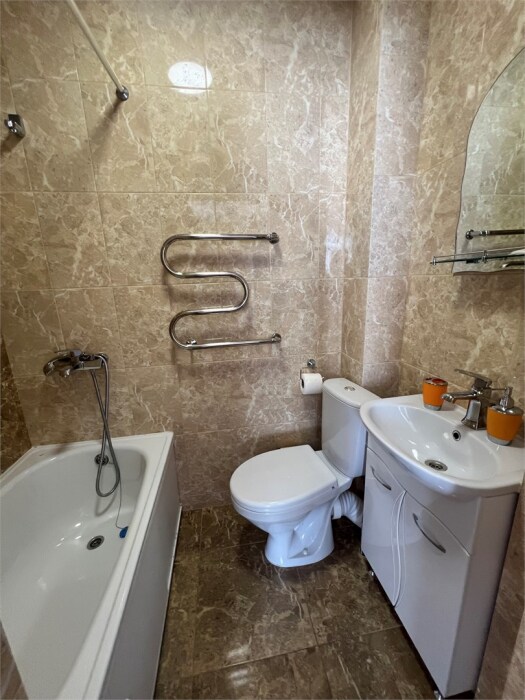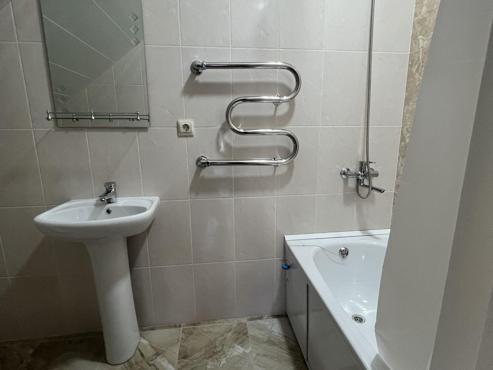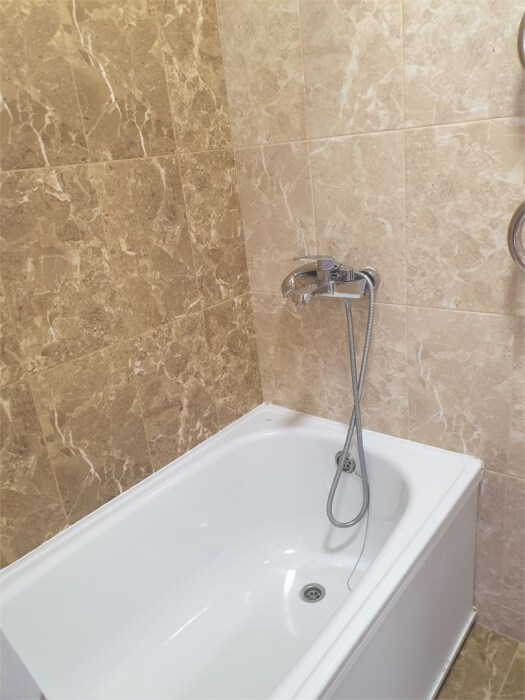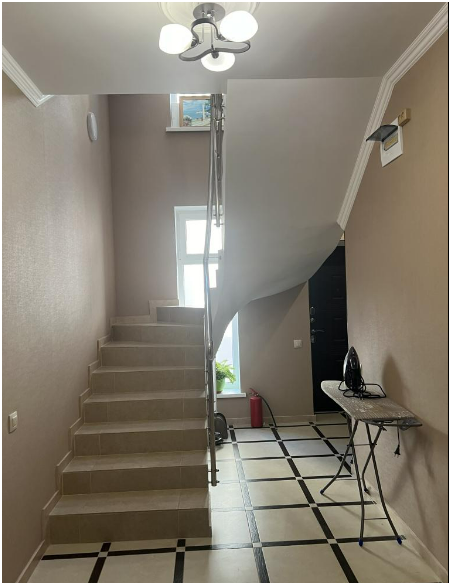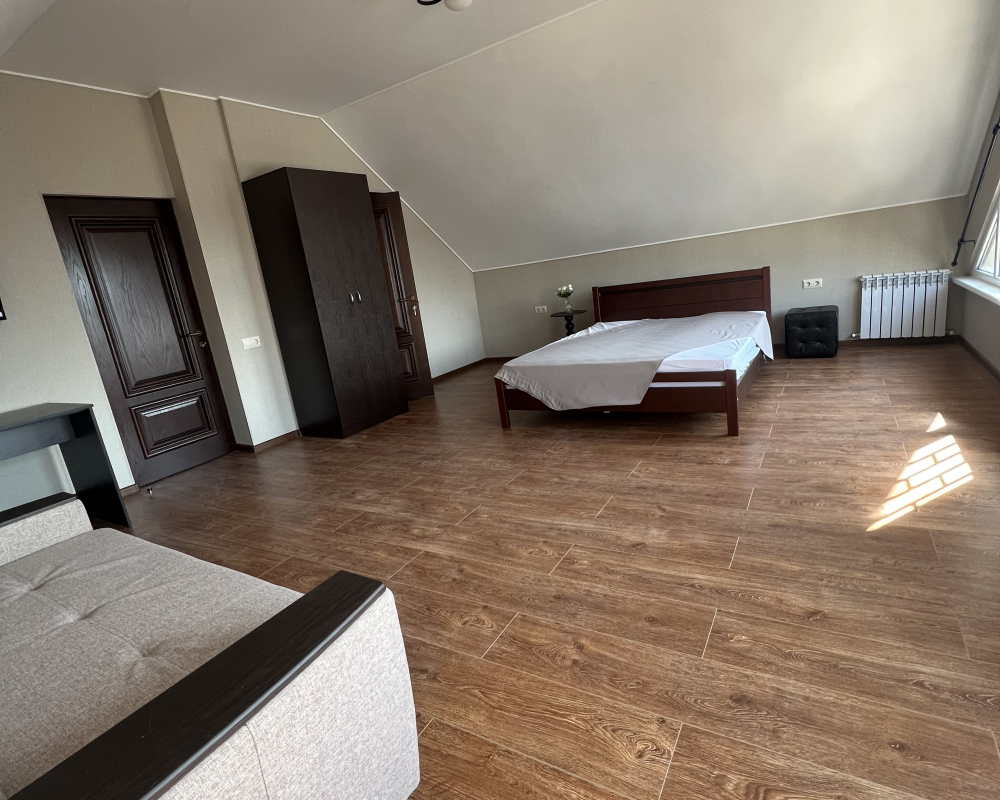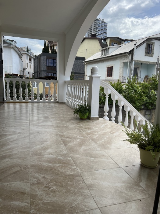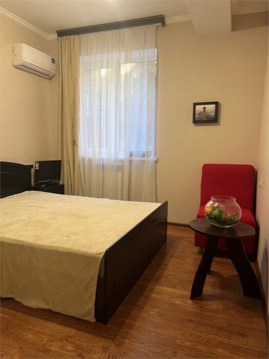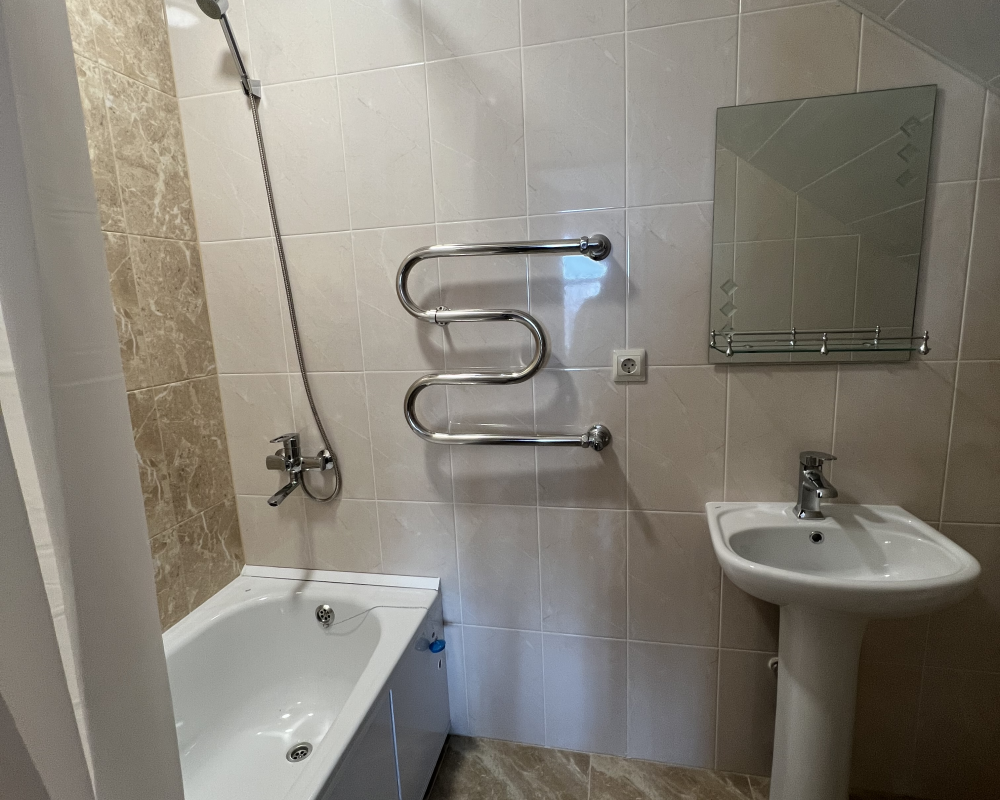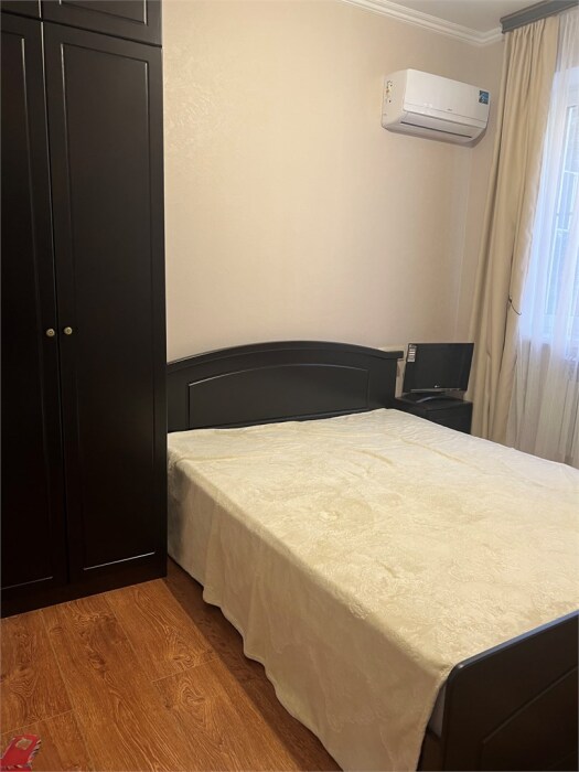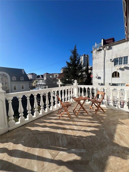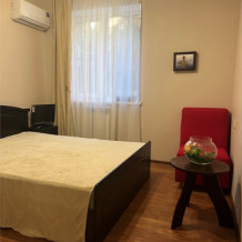 Трехместный новый номер на 4 этаже гостевого дома.Номер укомплектован мебелью: кровать двуспальная, кресло-кровать, письменный стол, плазменный телевизор, тумбочка.В номере есть холодильник, чайник, кружки, гигиенические средства, халаты, полотенце.