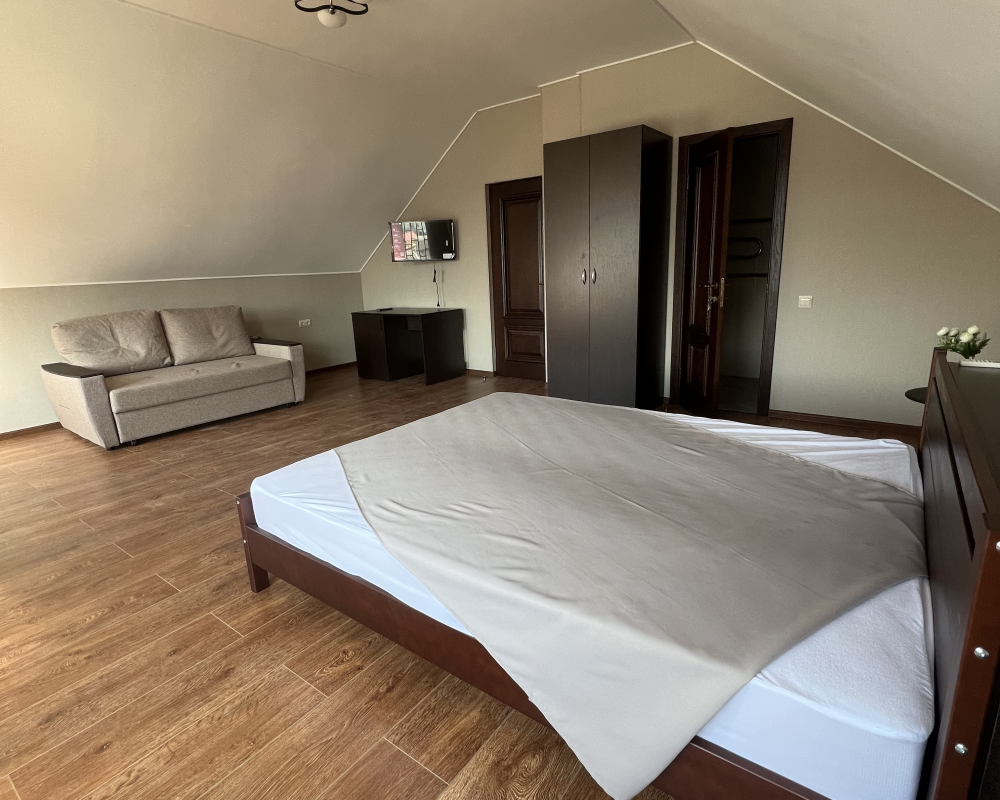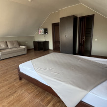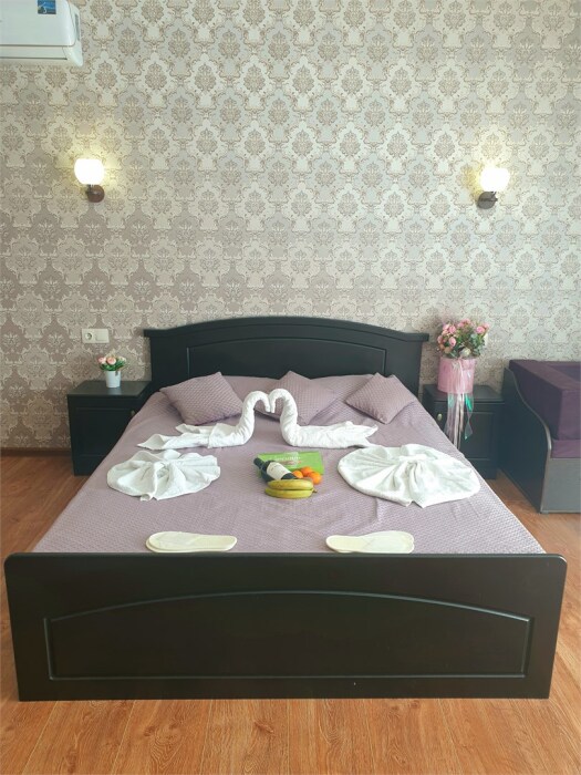 В номере: 1 двуспальная кровать и 1-диван двуспальный.