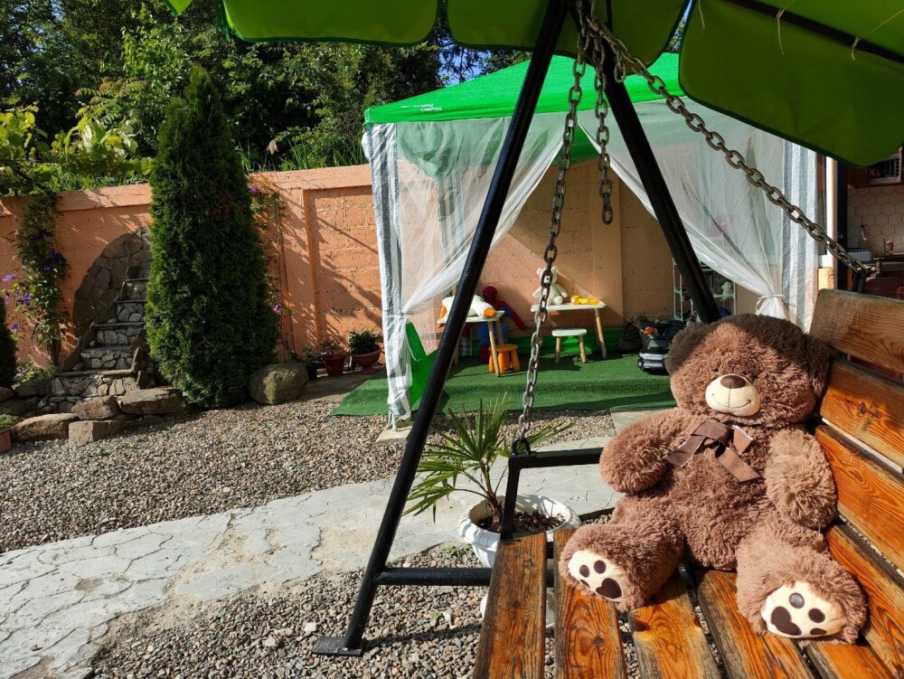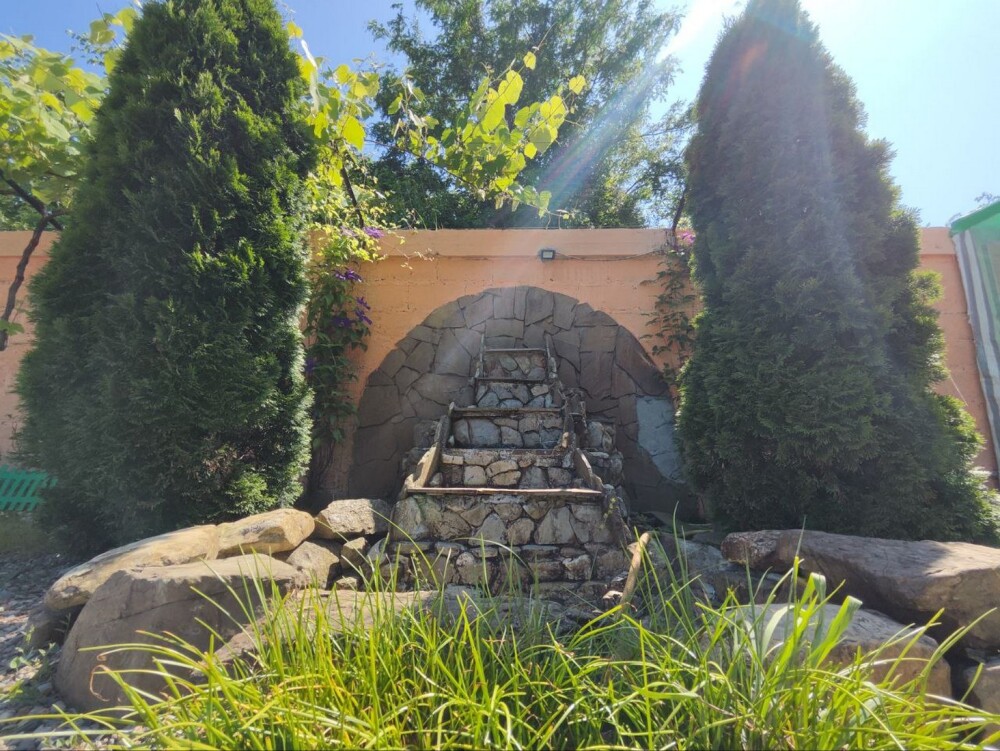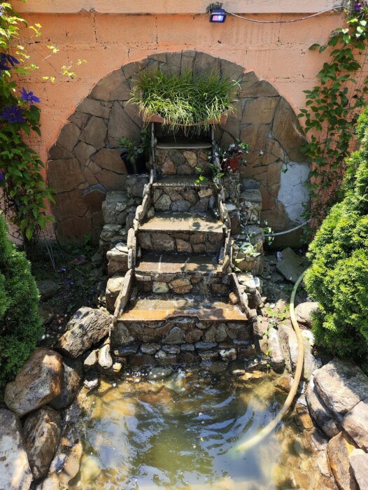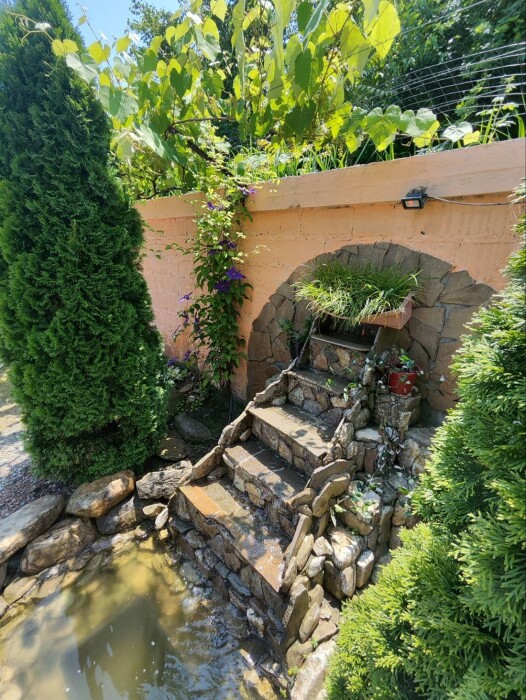 - Ухоженная территория, украшенная цветами и декоративными фигурками