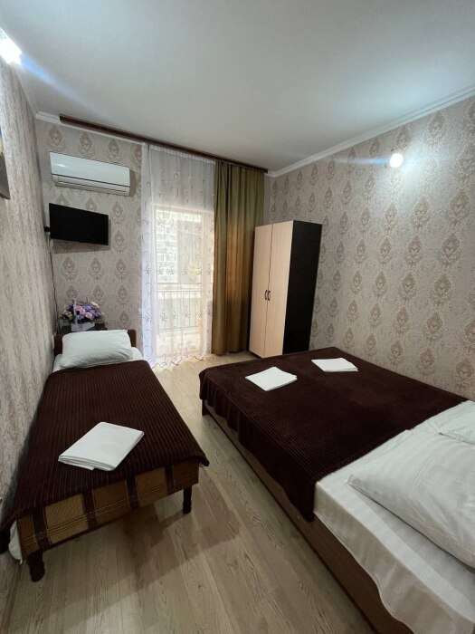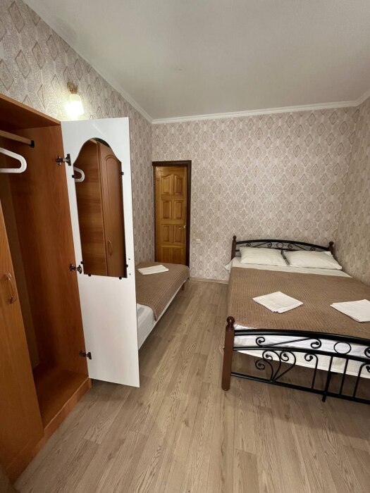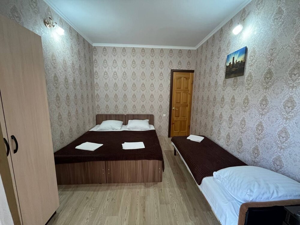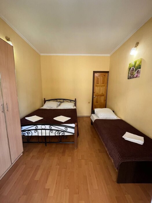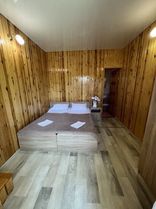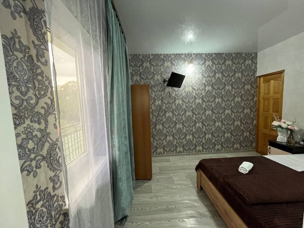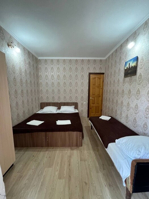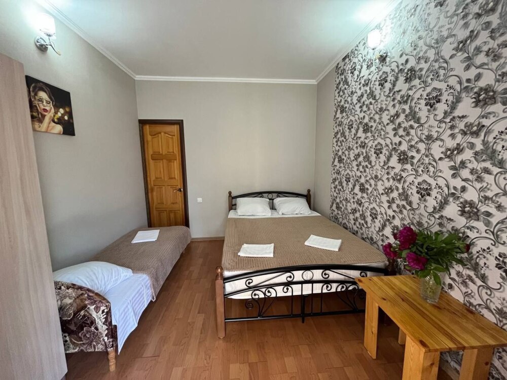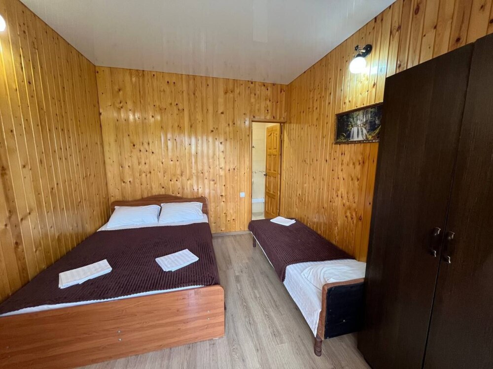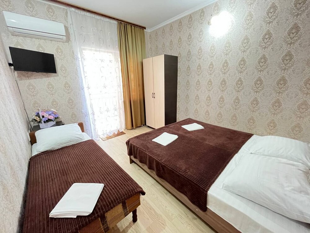 Подходит для размещения 5 человек. (2 основных места и 3 дополнительных) Имеет спальню с приятным интерьером. В номере: 1 двуспальная кровать, 1 двуспальный диван, 1 односпальная кровать. Имеется телевизор, кондиционер, шкаф, вешалка, обеденный стол, рабочий стол, стулья, кухня, посуда, столовые приборы, чайник, холодильник, электрическая плита.