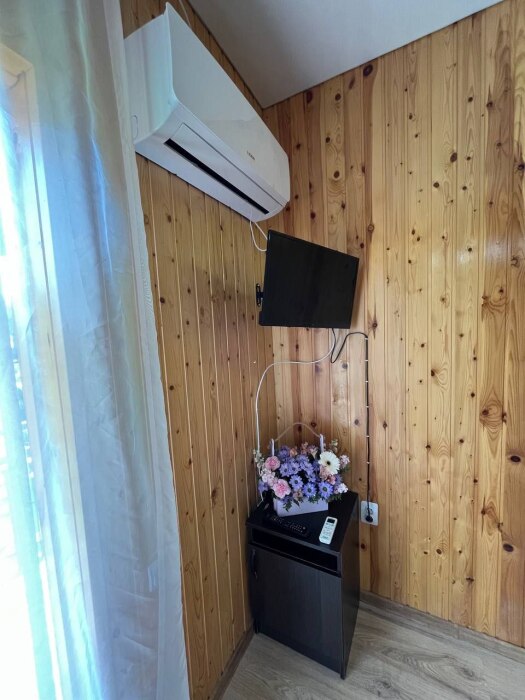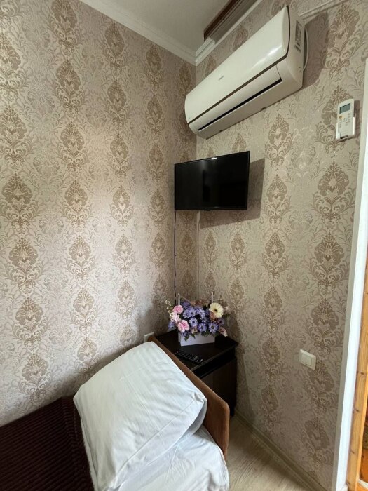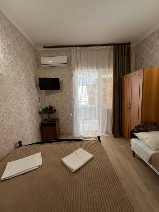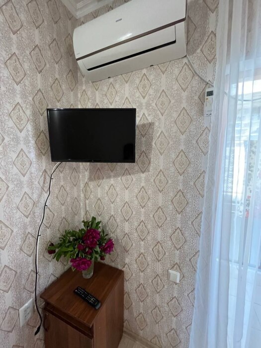 Имеется телевизор, кондиционер, шкаф, вешалка, журнальный столик, стулья.