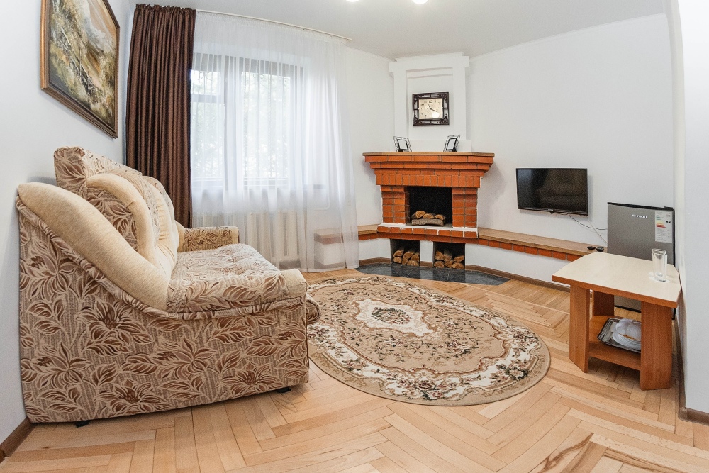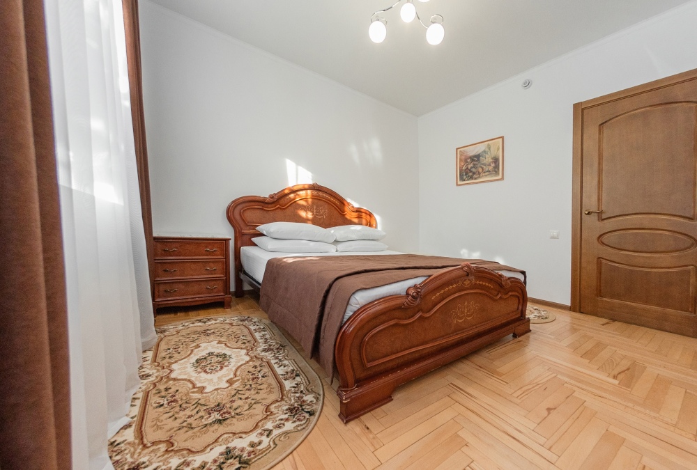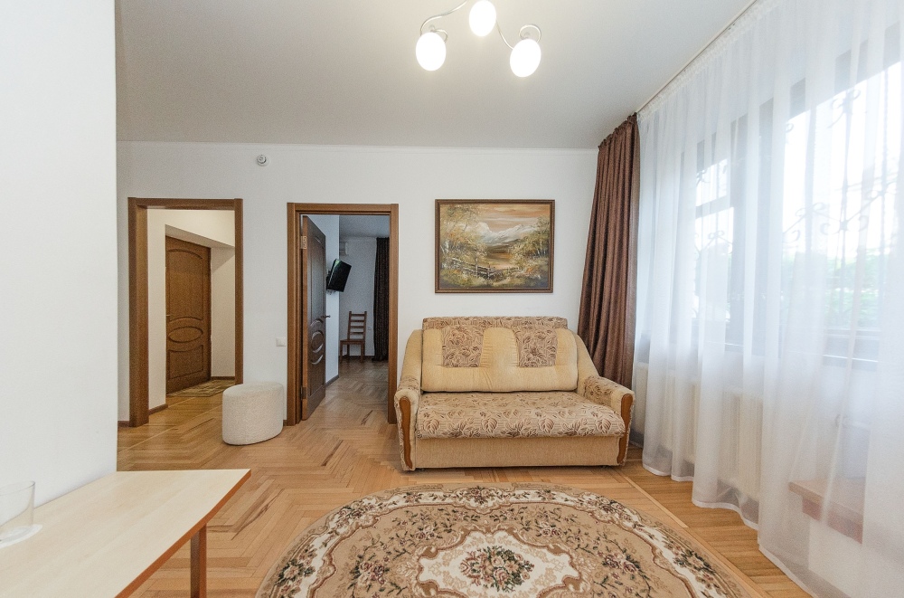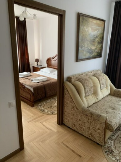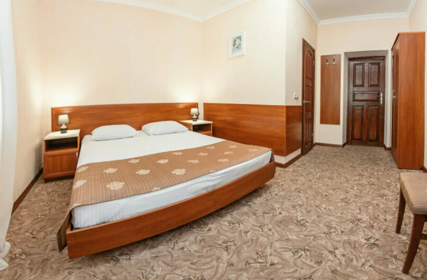 Номера категории «Люкс» двухкомнатные. В номере есть все необходимые удобства: двуспальная кровать, набор мягкой мебели, шкаф, прикроватные тумбочки, телевизоры, холодильник, кондиционер. В ванной комнате установлен душ, гостям предоставляется набор туалетных принадлежностей.