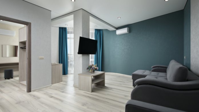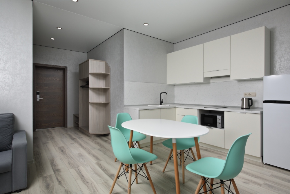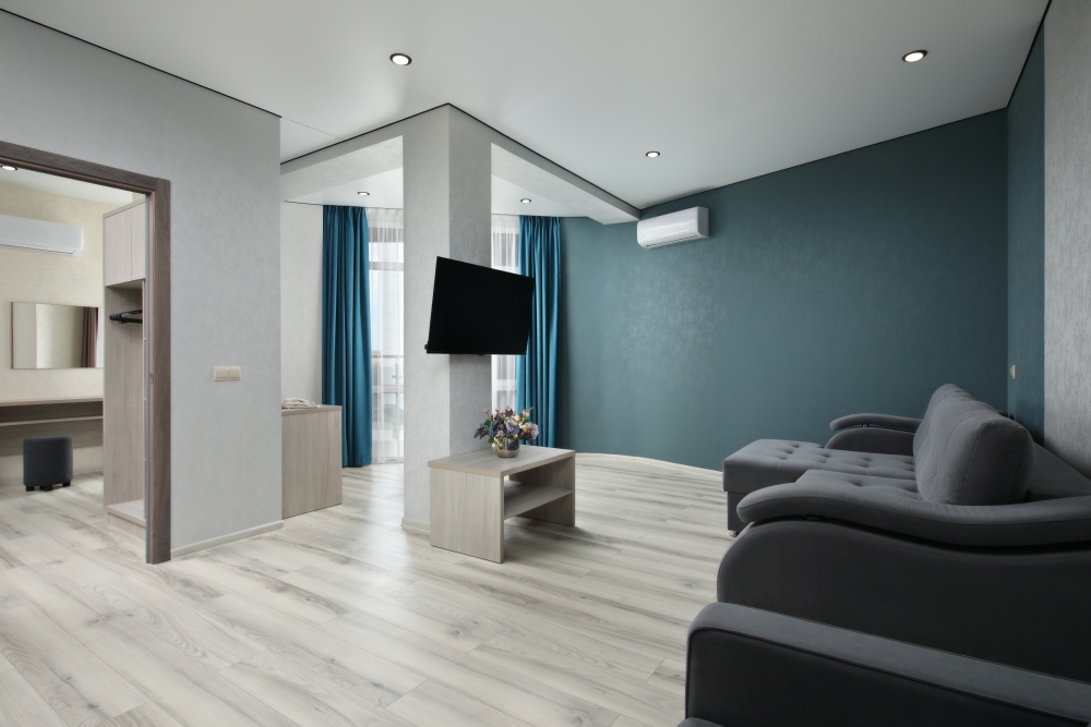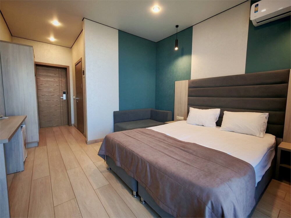Просторный двухкомнатный номер с двуспальной кроватью, двухместным раскладным диваном и двумя креслами-кроватями.