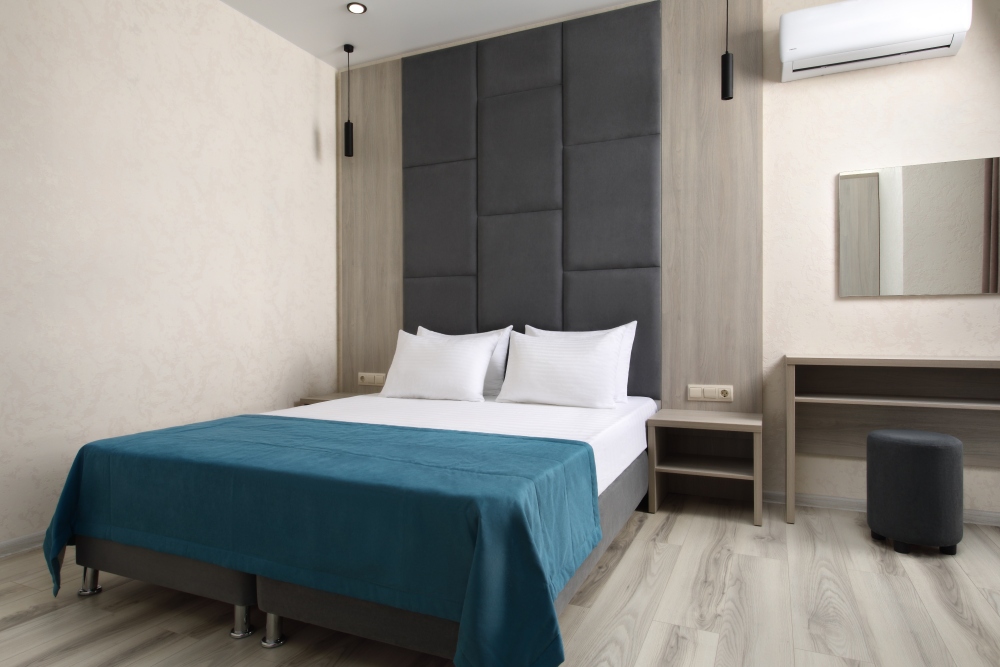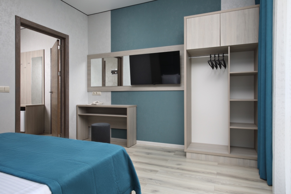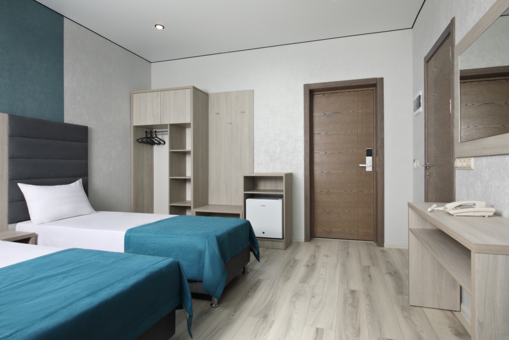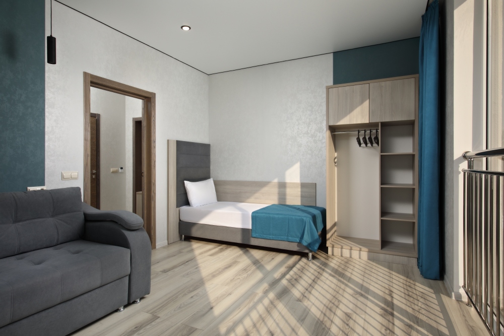 Уютный однокомнатный номер с двуспальной и односпальной кроватями, либо с 3 односпальными кроватями и балконом.