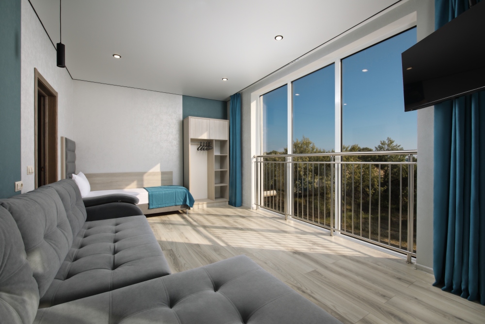 Просторный двухкомнатный номер с двуспальной и 2 односпальными кроватями и тахтой. С балконом.