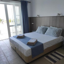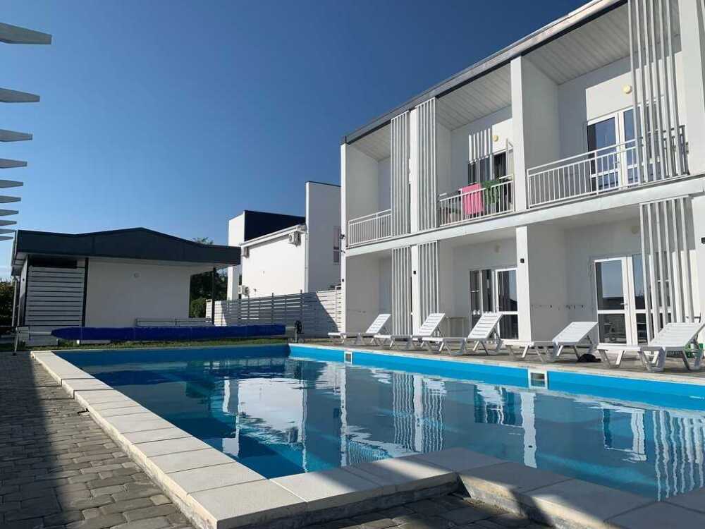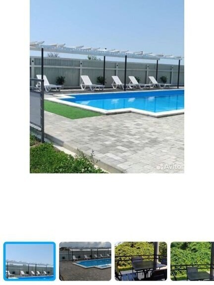 На территории большой бассейн, мангальная зона с принадлежностями для барбекю, оборудованная кухня с большой террасой и видом на море, парковка.