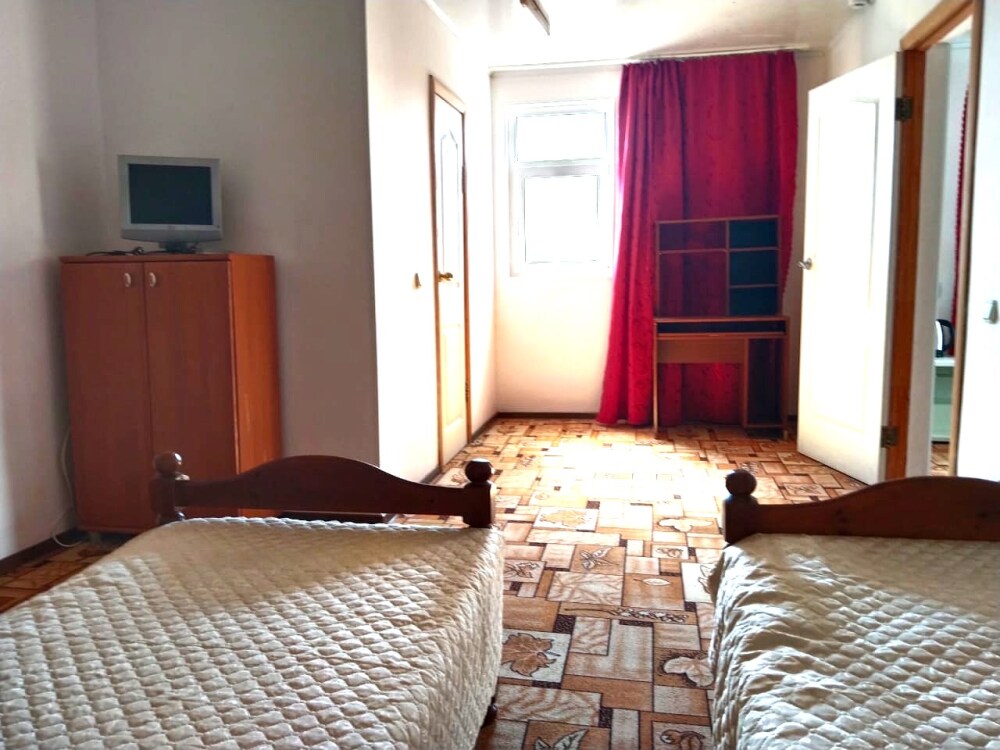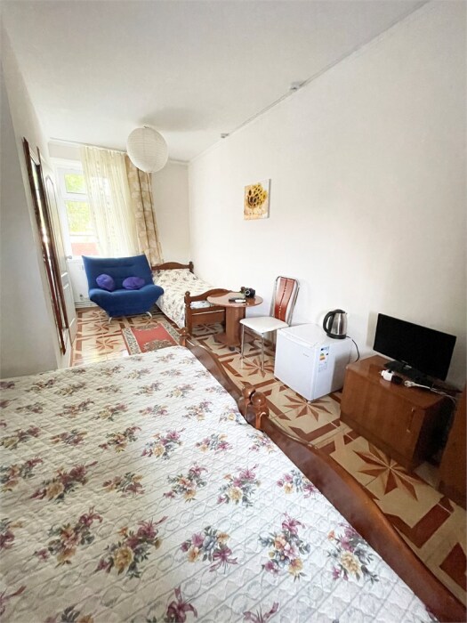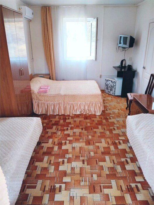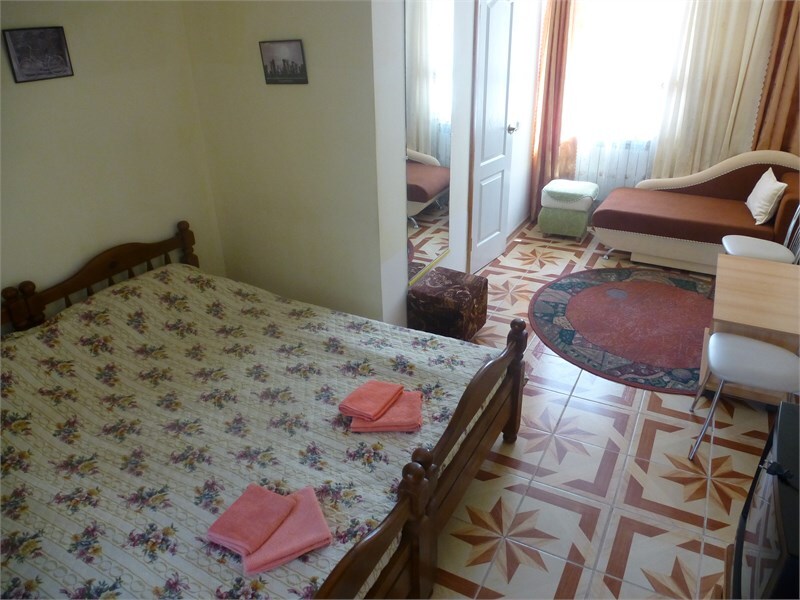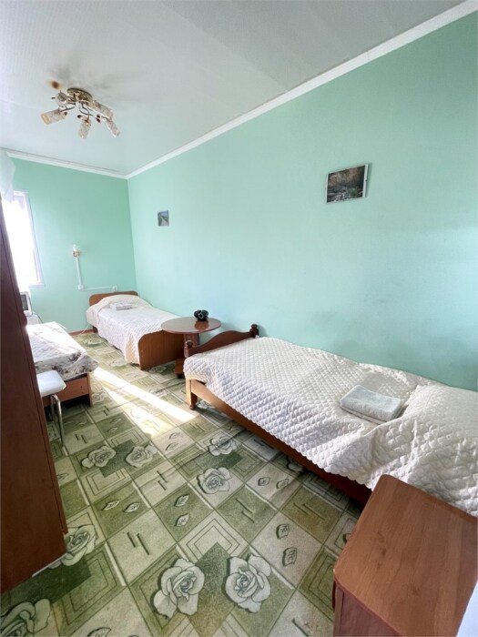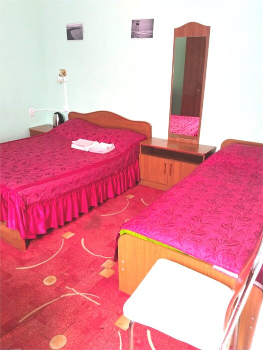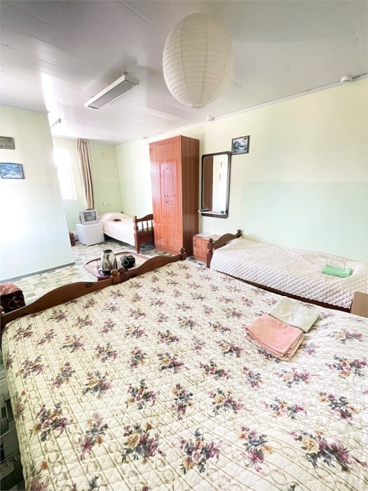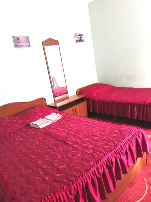 В номере одна двуспальная и две односпальные кровати или четыре односпальные кровати.