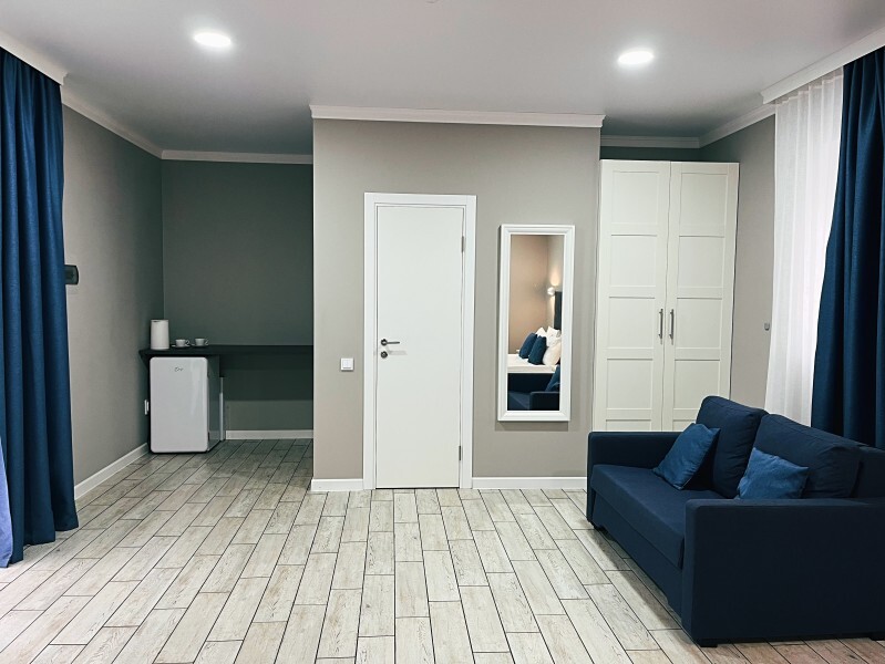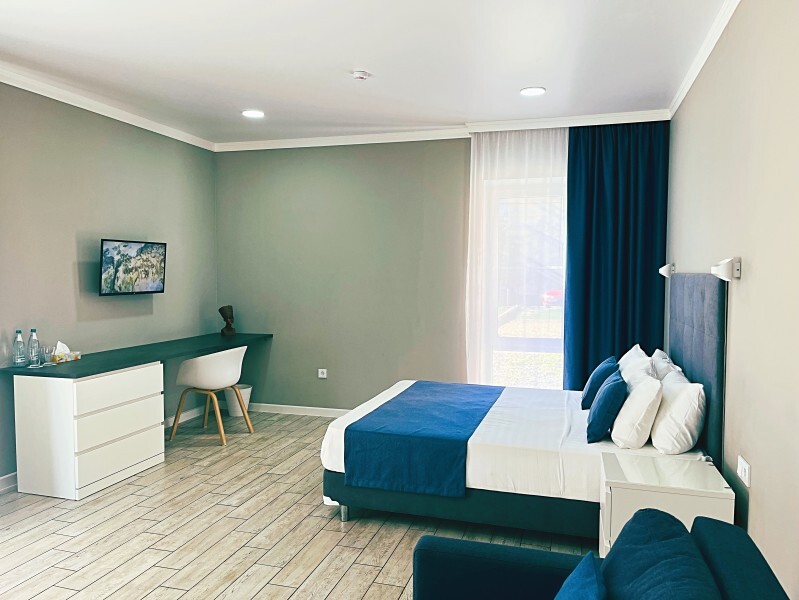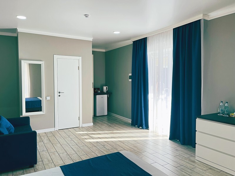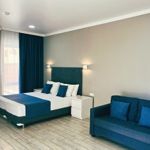 Семейный номер категории «Люкс». Расположен на первом этаже отеля, имеет собственную террасу с обеденным столом и креслами. Оснащен всем необходимым для комфортного проживания самых искушенных гостей.