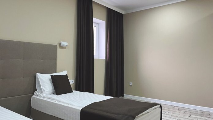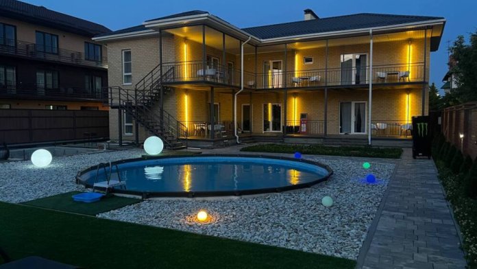 Территория отеля занимает 800 кв.м и представляет собой локацию с бассейном, костровой и барбекю зоной.