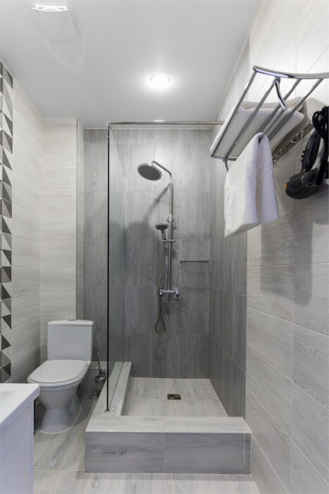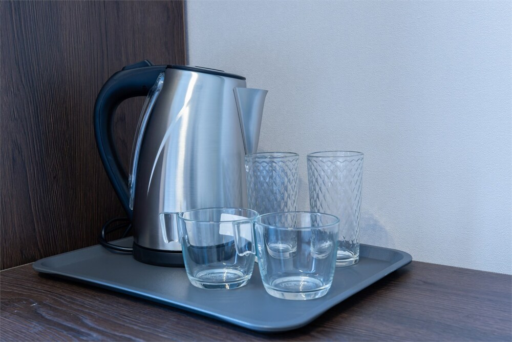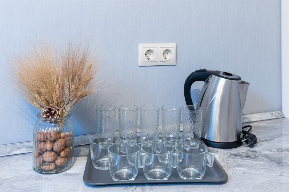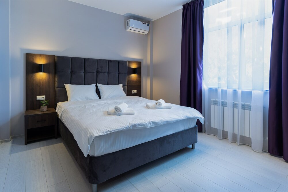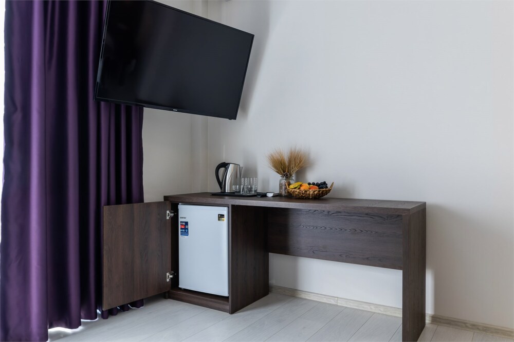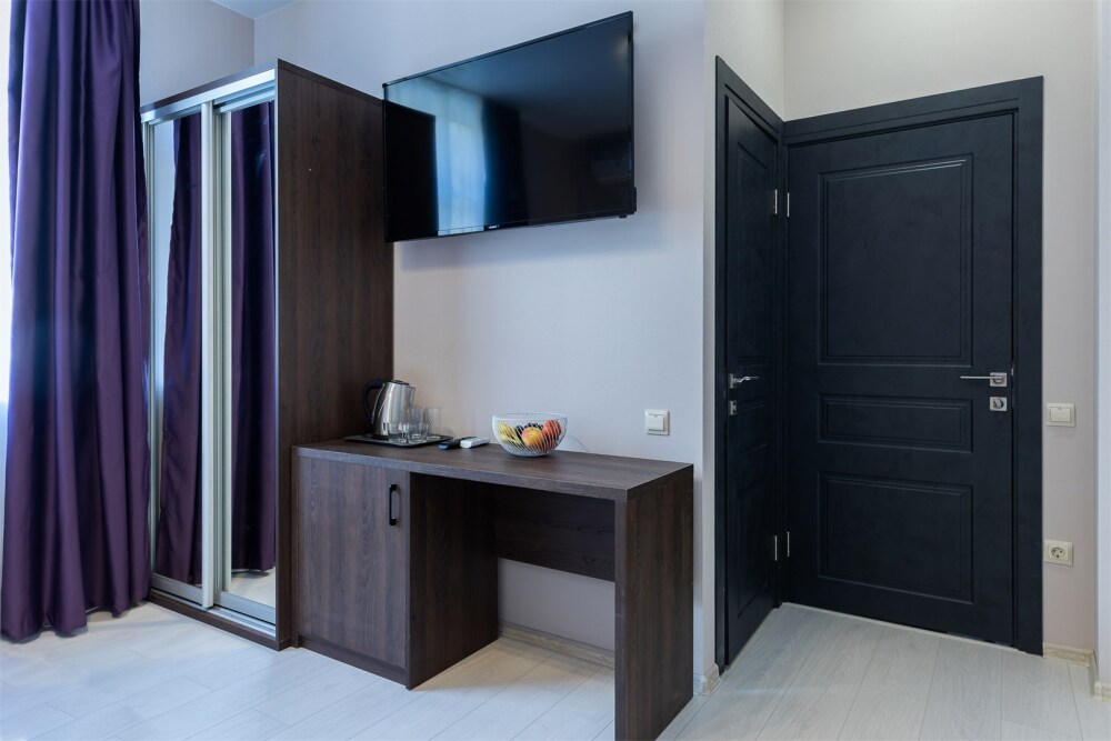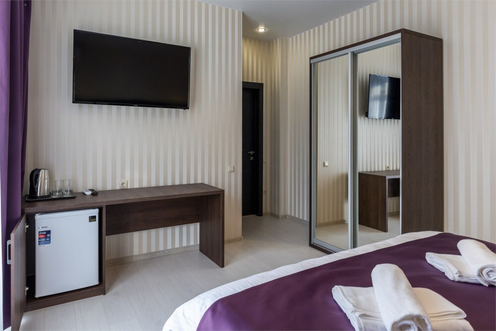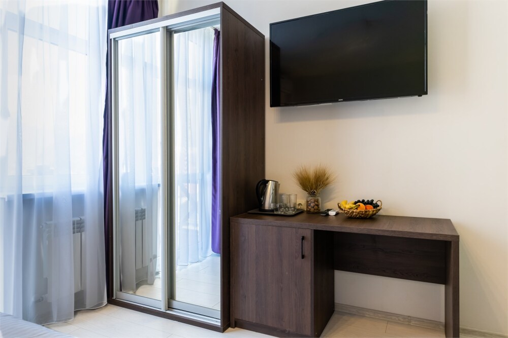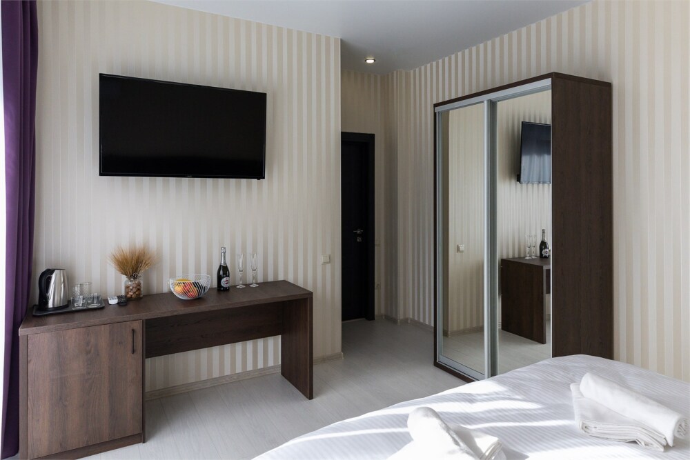 Двухместный номер. Комфортная двухспальная кровать «king-size» с ортопедическим матрасом и постельным бельем премиум-качества. Душевая с банными принадлежностями. В номере: телевизор, душ, фен, банные принадлежности, холодильник, рабочий стол,стул, чайник, кружки/стаканы, чай, кофе, шкаф с зеркалом во весь рост.