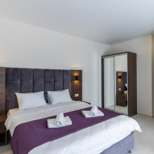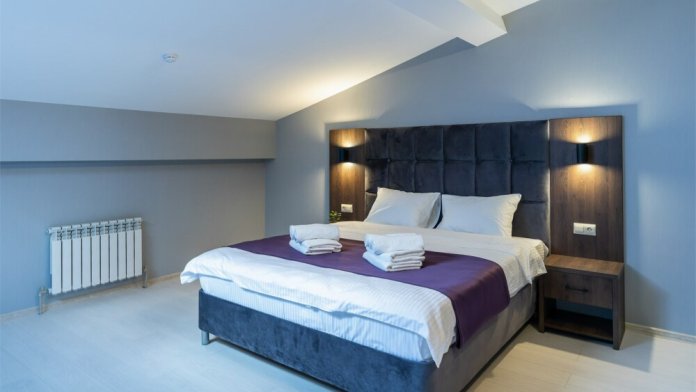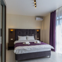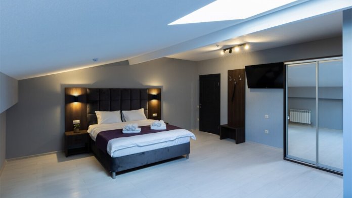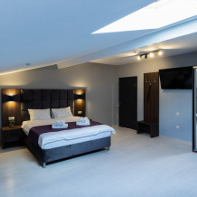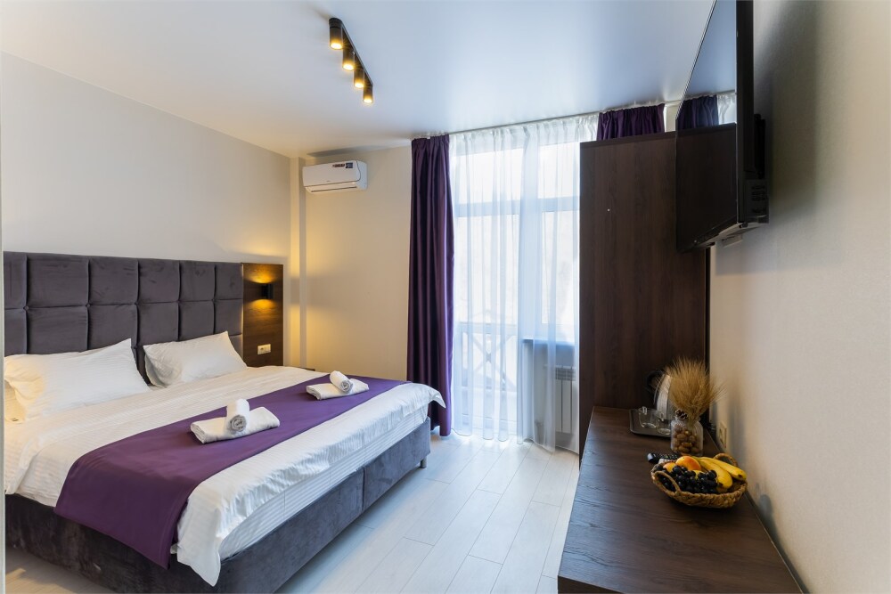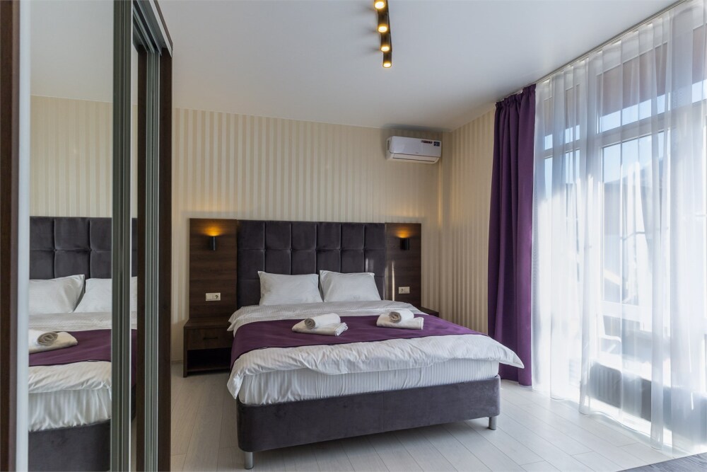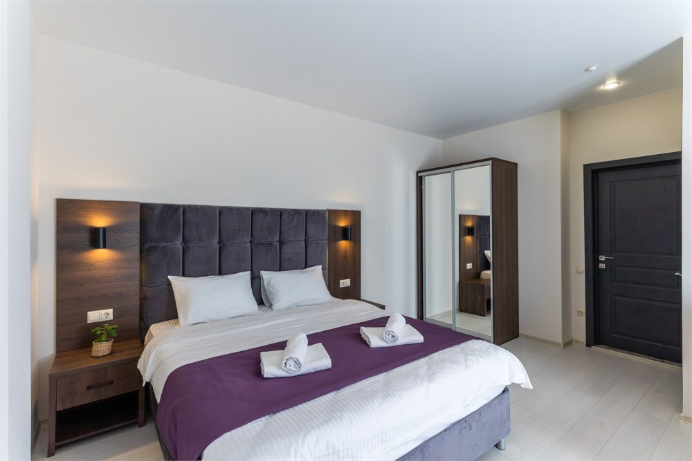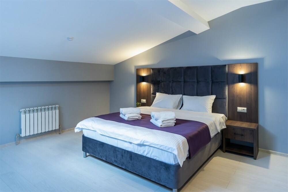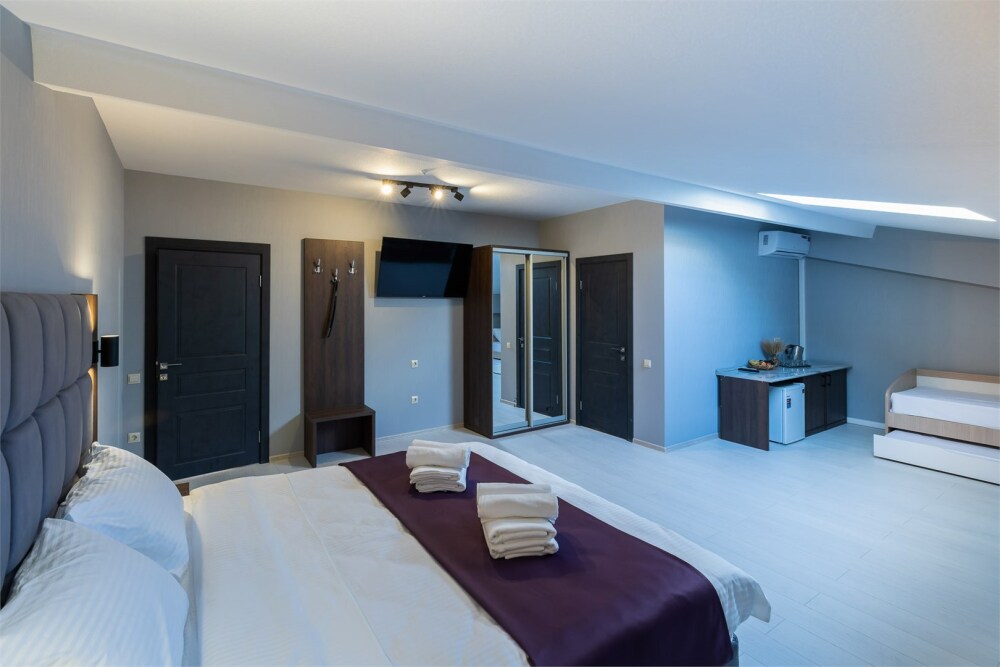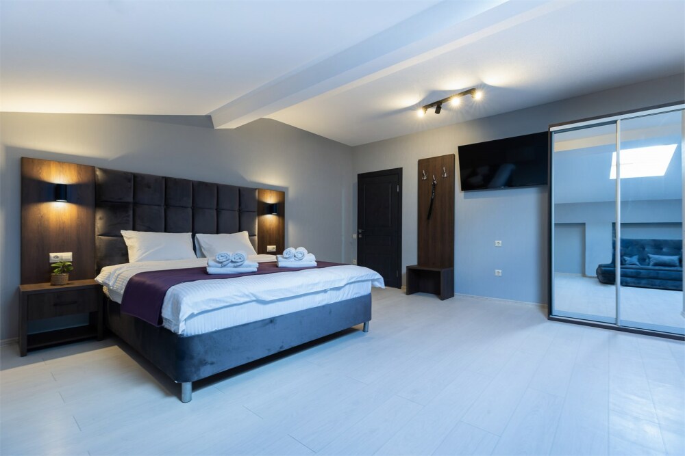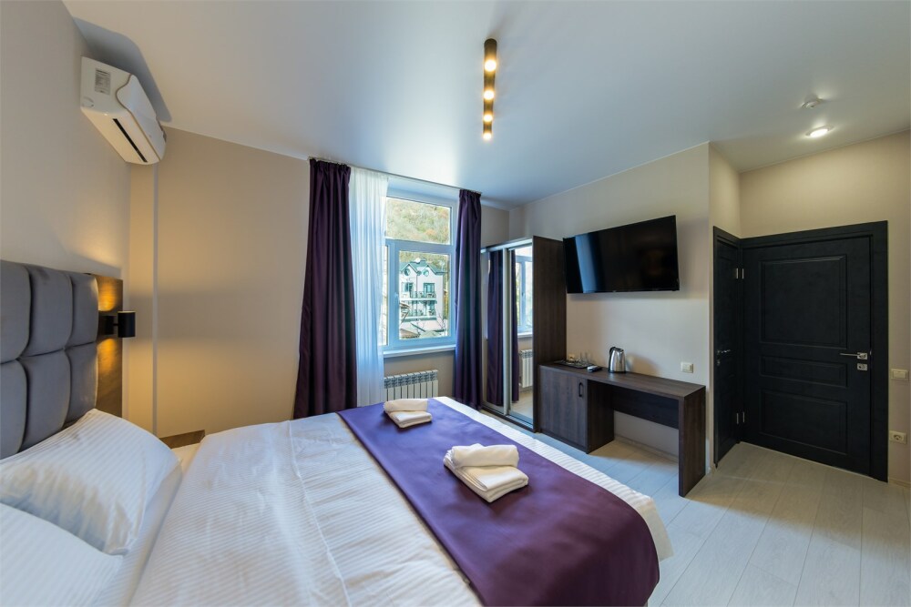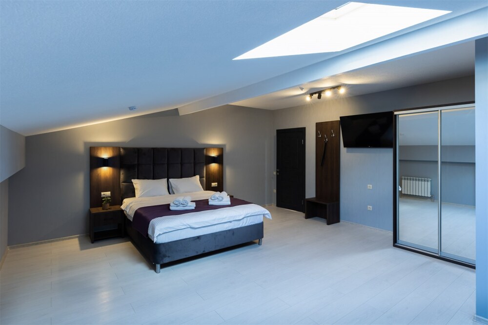 Панорамный люкс с двуспальной кроватью «king-size» с постельным бельем премиум качества. Панорамные окна с частичным видом на горы. В номере: телевизор, душ, фен, банные принадлежности, халаты, холодильник, рабочий стол,стул, чайник, кружки/стаканы, чай, кофе, шкаф с зеркалом во весь рост.