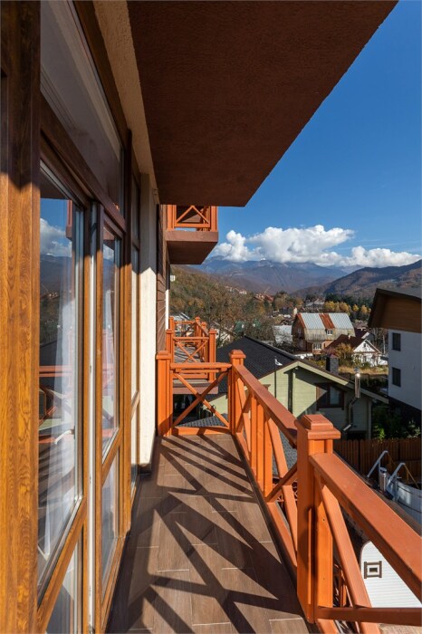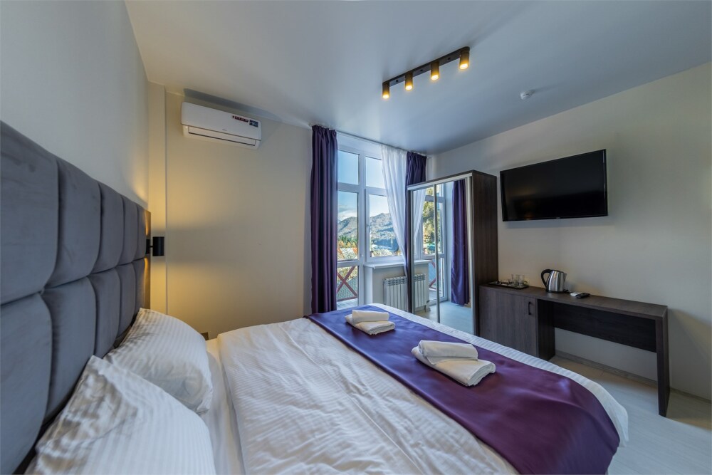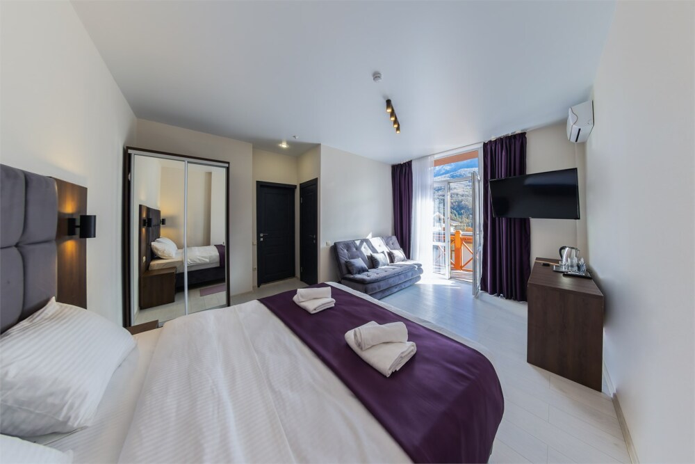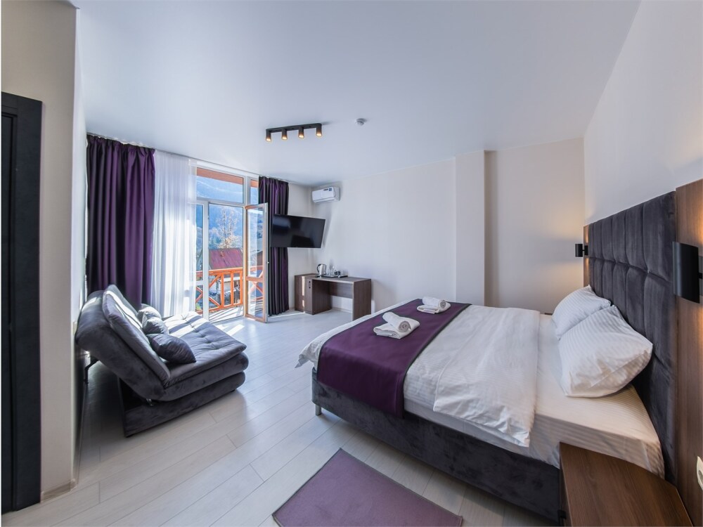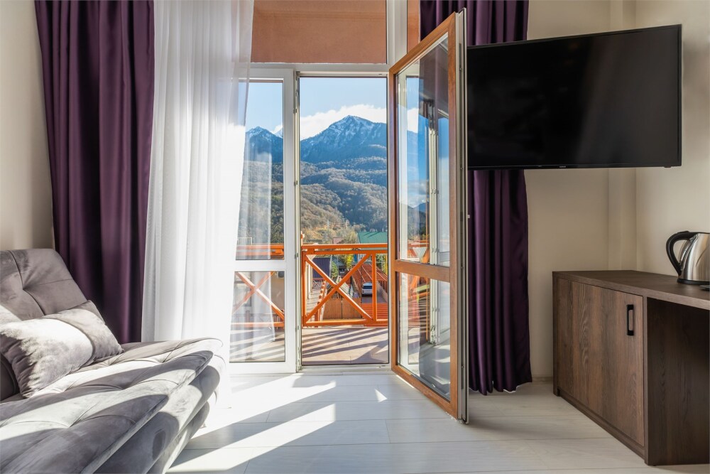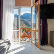 Панорамный люкс с балконом с двуспальной кроватью «king-size». Панорамные окна с видом на горы.В номере: телевизор, душ, фен, банные принадлежности, халаты, холодильник, рабочий стол,стул, чайник, кружки/стаканы, чай, кофе, шкаф с зеркалом во весь рост. На балконе столик со стульями.