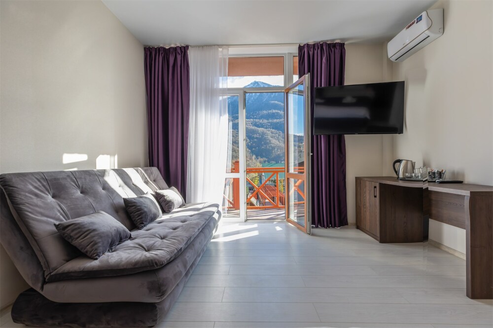 Панорамный семейный люкс с двуспальной кроватью «king-size» и раскладывающимся диваном. Панорамные окна с видом на горы. В номере: телевизор, душ, фен, халаты, холодильник, рабочий стол, стул, чайник, кружки/стаканы, кофе, чай, шкаф с зеркалом во весь рост. Балкон со столиком и стульями.