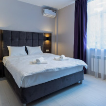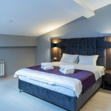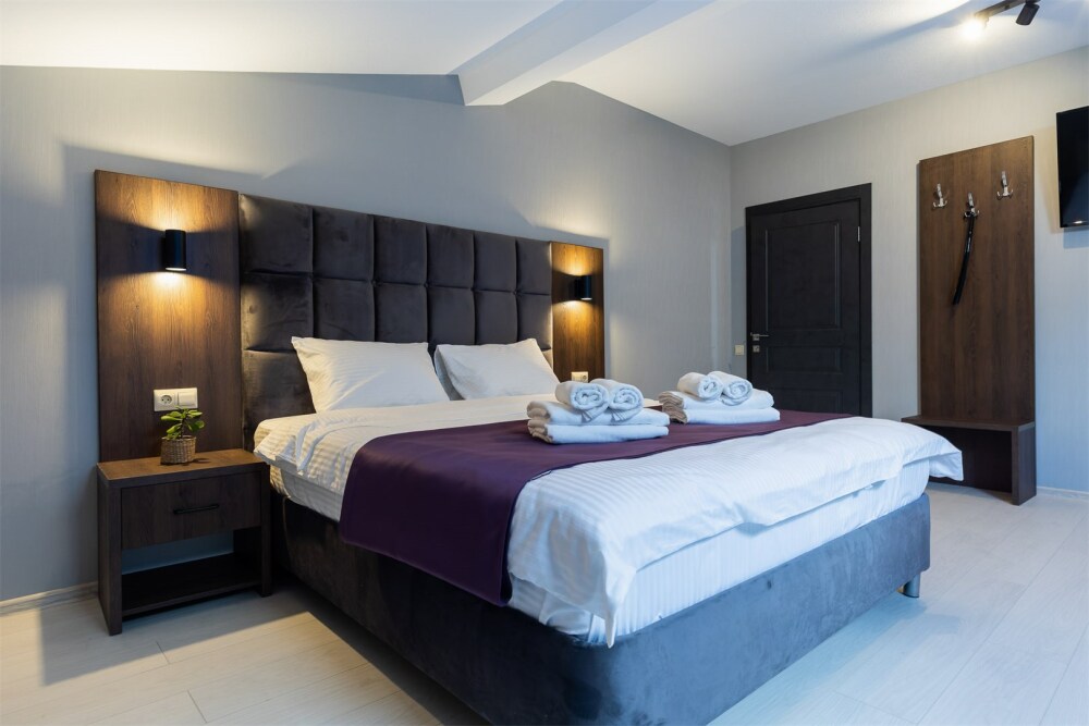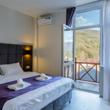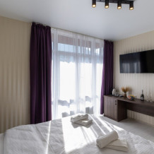Стандартный номер с двуспальной кроватью «king-size», постельным бельем премиум качества, с балконом и прекрасным видом на горы. В номере: телевизор, душ, фен, банные принадлежности, халаты, холодильник, рабочий стол,стул, чайник, кружки/стаканы, чай, кофе, шкаф с зеркалом во весь рост. На балконе столик со стульями.