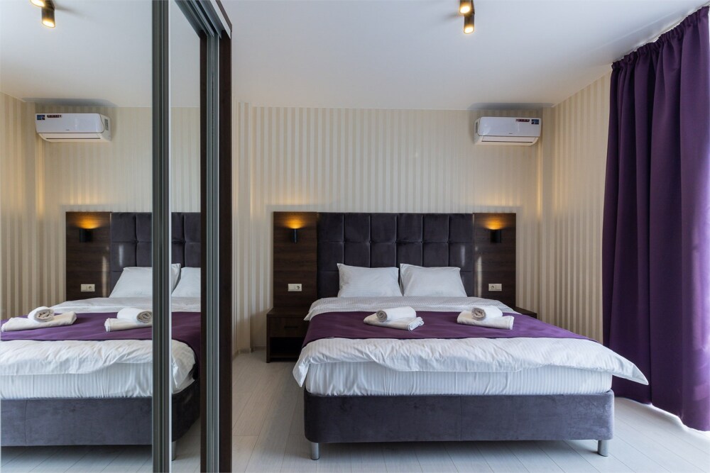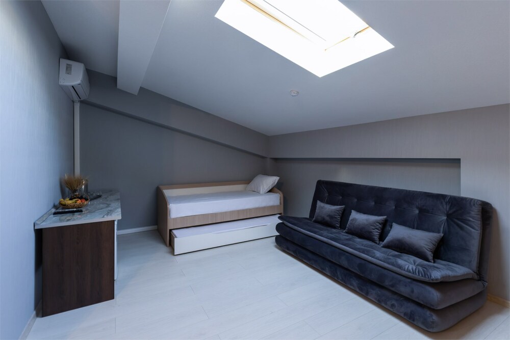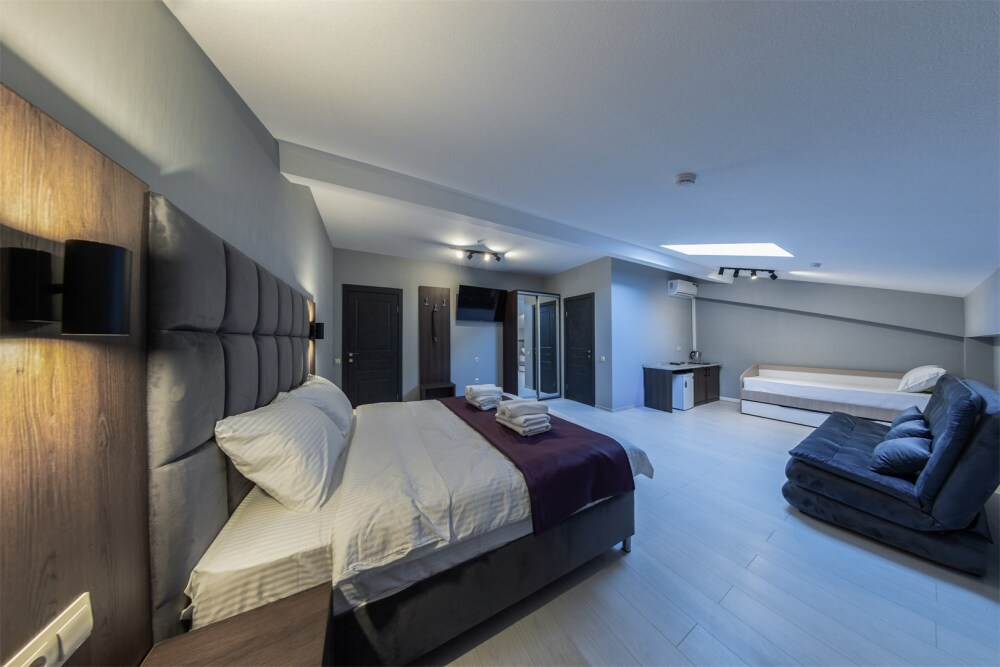 Семейный номер на 6 человек. Спальные места: двуспальная кровать king-size, раскладывающийся диван, двухъярусная выдвижная кровать (комфортно для детей). В номере: шкаф с зеркалом во весь рост, рабочий стол,стул, холодильник, душ, фен, чайник, кружки/стаканы, кофе, чай.