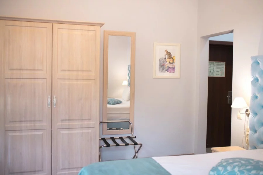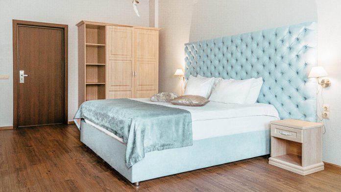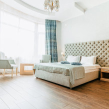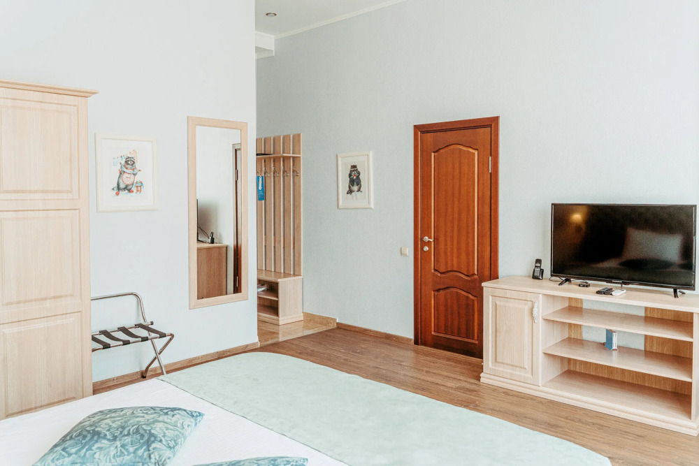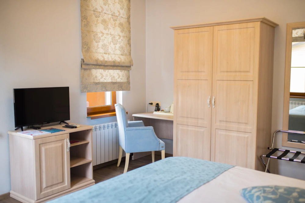 Номер оформлен в светлых тонах и оснащен всем необходимым для комфортного отдыха: мини-бар, телевизор, кондиционер, чайный сет. Расположен на первом этаже и имеет вид на прилегающую территорию и парковку.