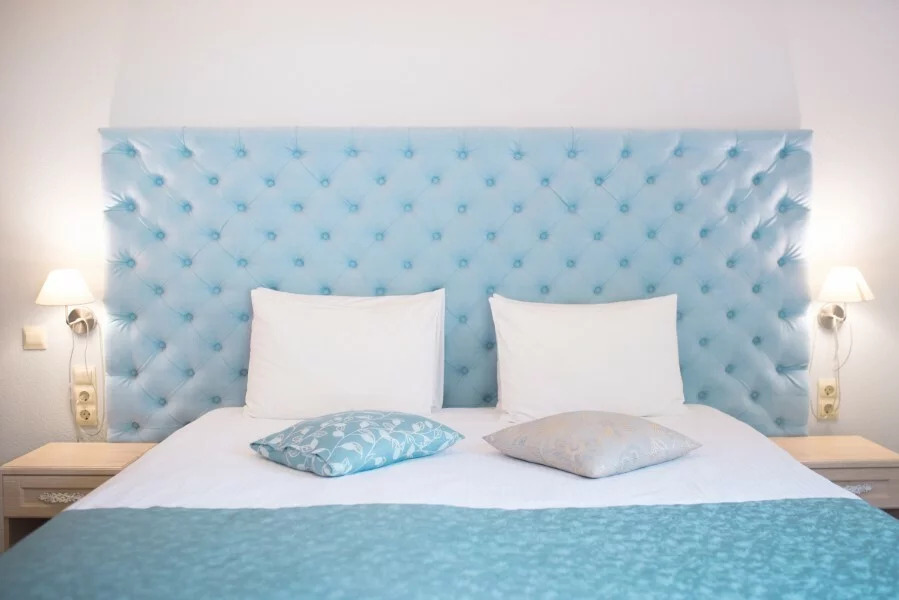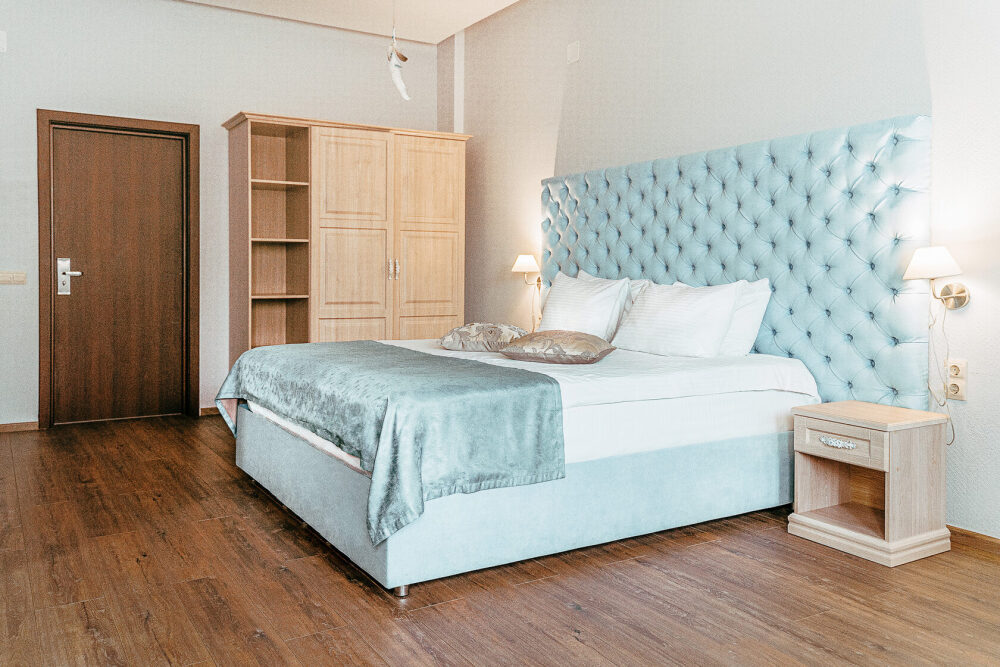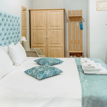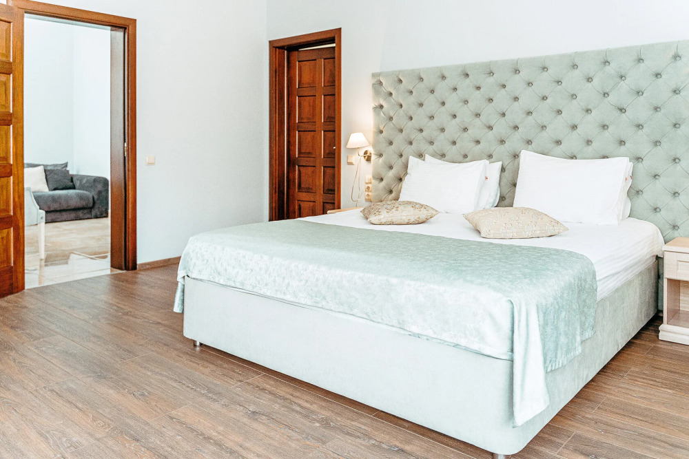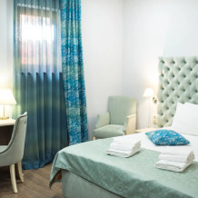 Люкс двухкомнатный — просторный номер с 2-мя изолированными комнатами и открытой террасой. Вмещает до 5-ти человек. Оформлен в светлых тонах и оснащен всем необходимым: мини-бар, телевизор, кондиционер, чайный сет. В номере большая двуспальная кровать и двуспальный диван, имеется межкомнатная дверь.