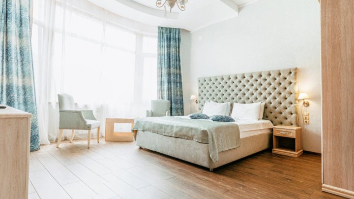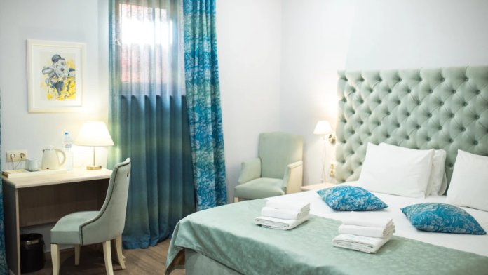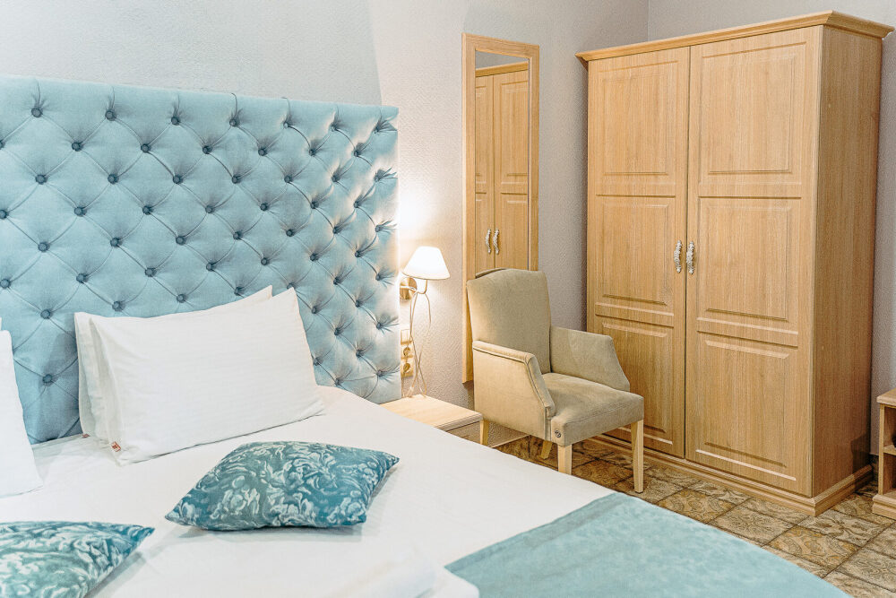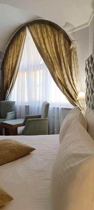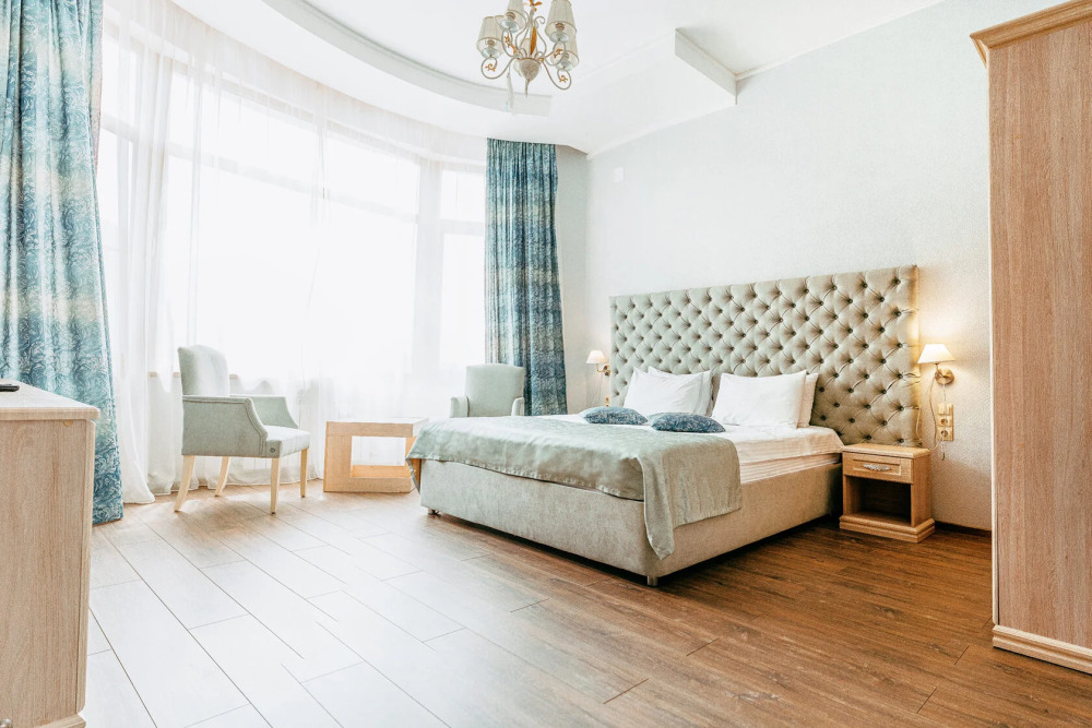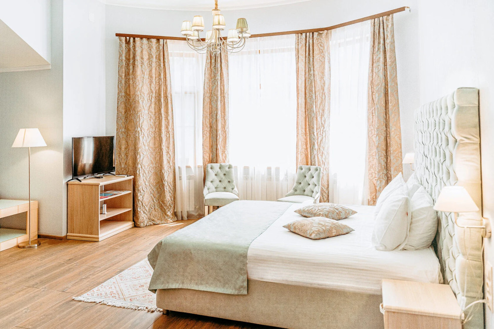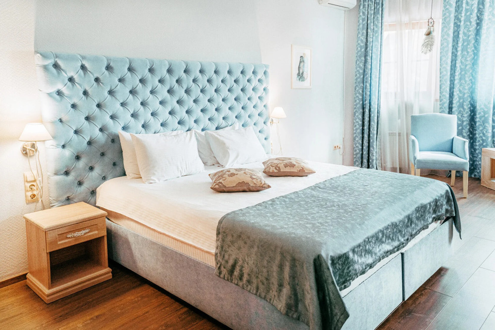 Номер оформлен в светлых тонах и оснащен всем необходимым: мини-бар, телевизор, кондиционер, чайный сет. Номер расположен на нулевом этаже, окно «без вида», что компенсируется близостью к SPA-зоне и выходу к бассейну.