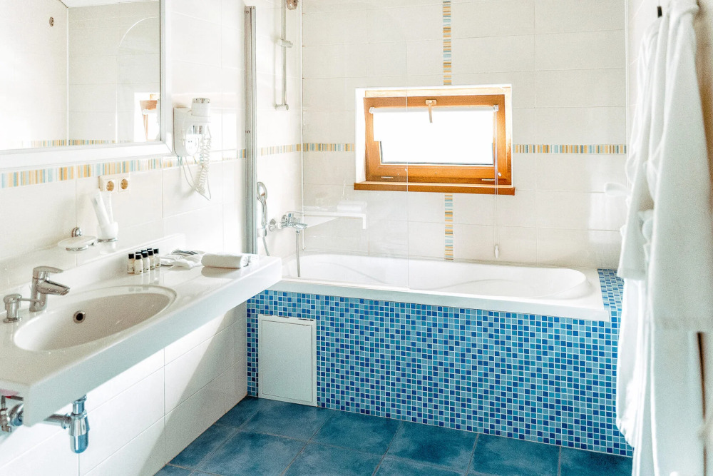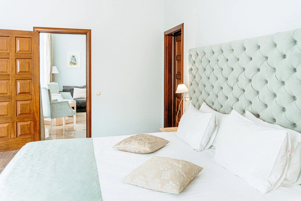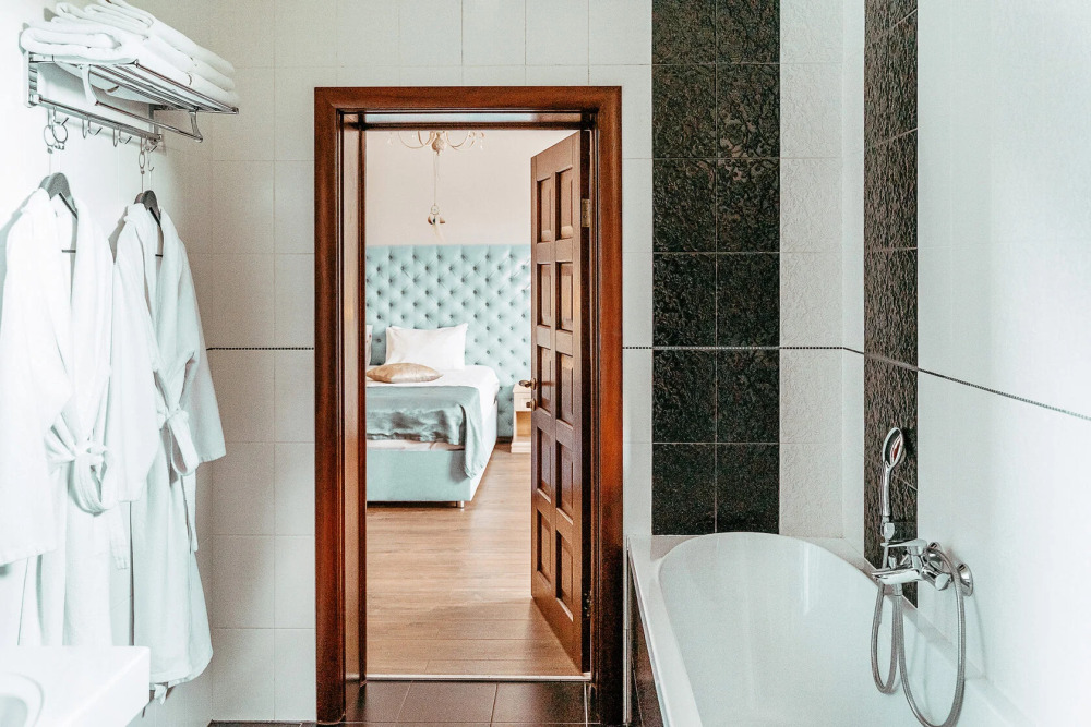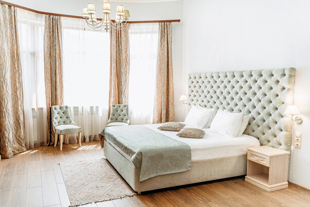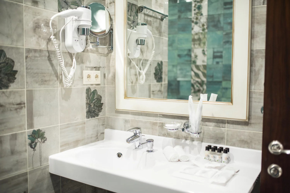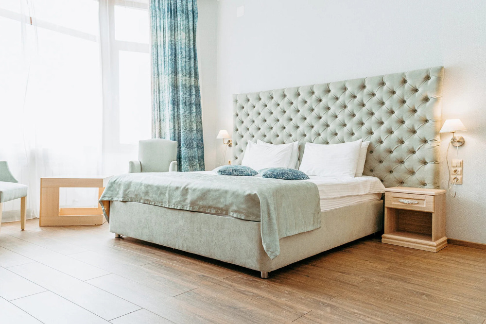 Номер оформлен в светлых тонах и оснащен всем необходимым: мини-бар, телевизор, кондиционер, чайный сет. Номер расположен на нулевом этаже, окно «без вида», что компенсируется близостью к SPA-зоне и выходу к бассейну.
