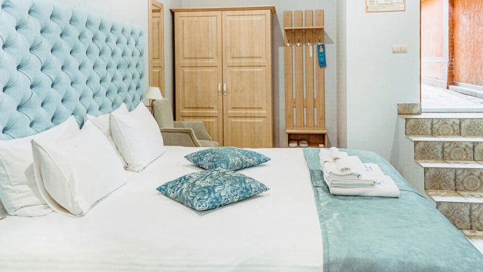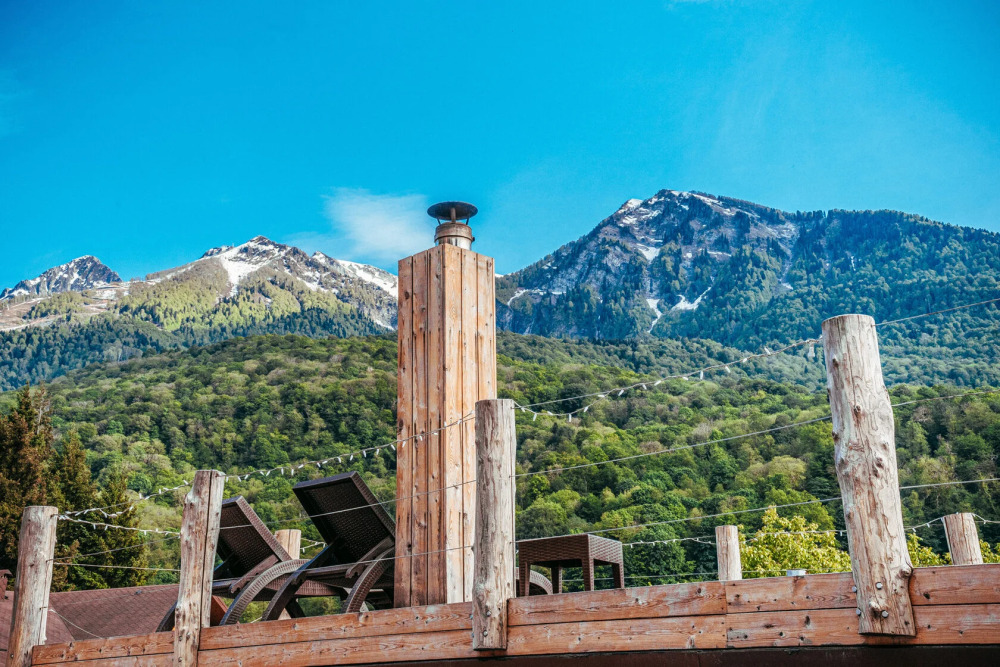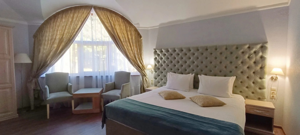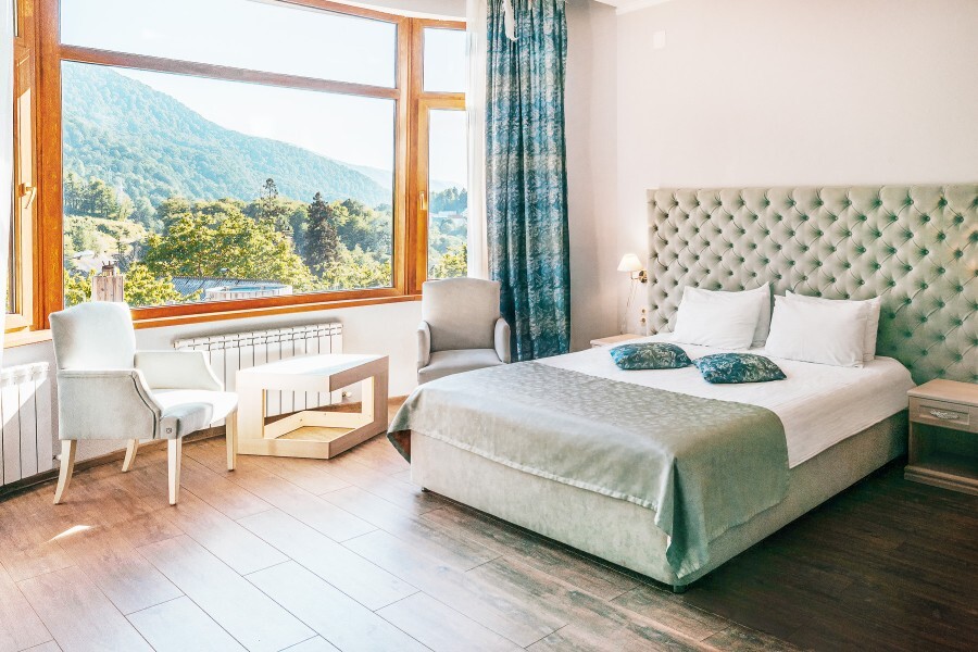 Люкс с видом на горы и балконом — роскошный, просторный номер, с открытой террасой и панорамными окнами с видом на горы, оформлен в светлых тонах и оснащен всем необходимым: мини-бар, телевизор, кондиционер, чайный сет. В номере большая двуспальная кровать и двуспальный диван. Расположен на втором этаже, из окон открывается панорамный вид на горы.