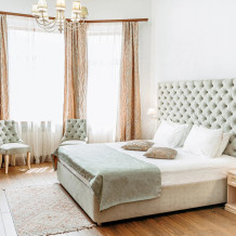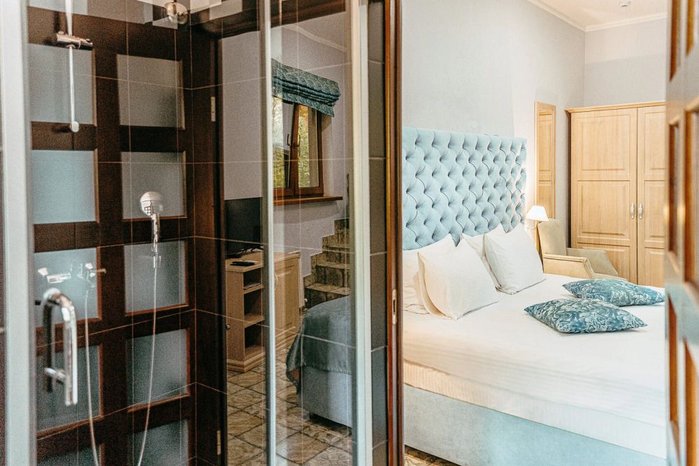 Уединенный номер с отдельным входом. Оформлен в светлых тонах и оснащен всем необходимым: мини-бар, телевизор, кондиционер, чайный сет. Имеет лестницу при входе, не рекомендуем для гостей с маленькими детьми.