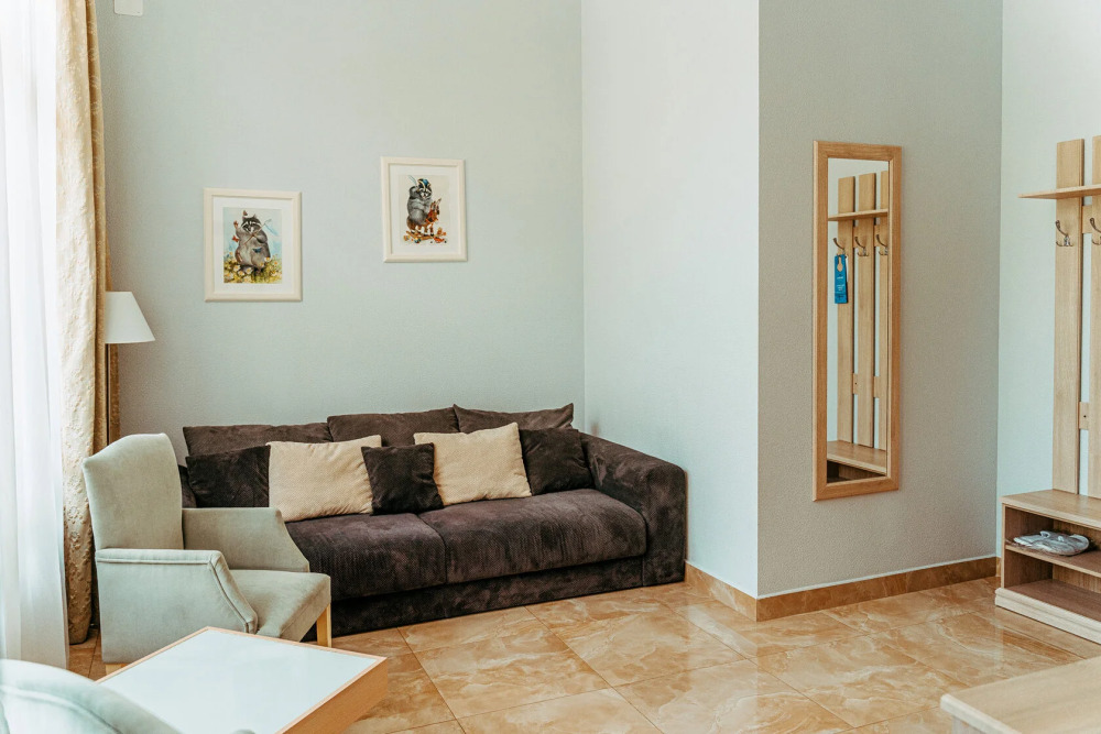 Просторный, уютный номер, оформленный в светлых тонах и оснащенный всем необходимым для комфортного отдыха: мини-бар, телевизор, кондиционер, чайный сет. Номер отличает наличие удобного дивана, ванны и душевой. Из окон открывается прекрасный вид на бассейн и на горы. Расположен на нулевом этаже в непосредственной близости к SPA-зоне и выходу к бассейну.
